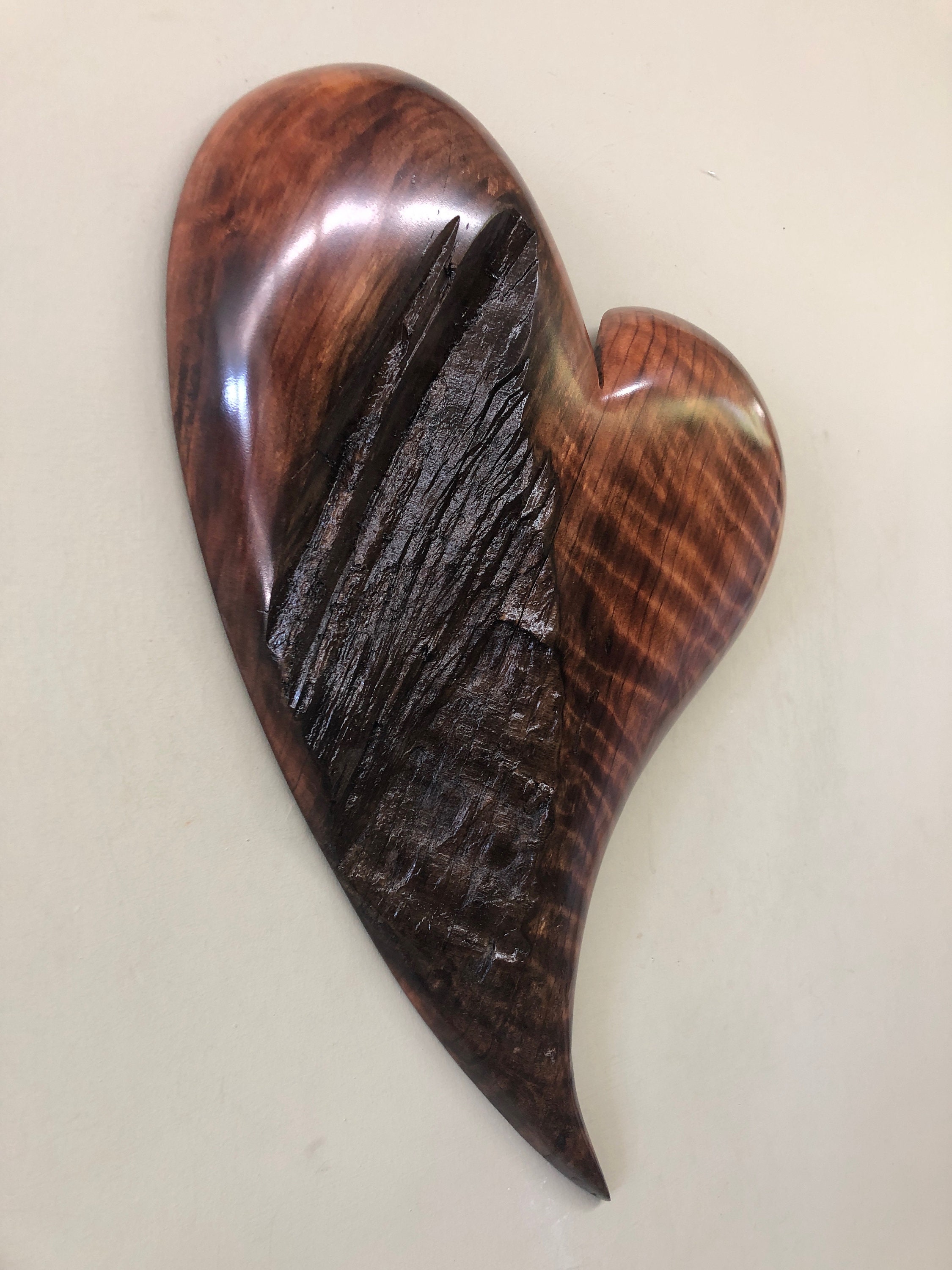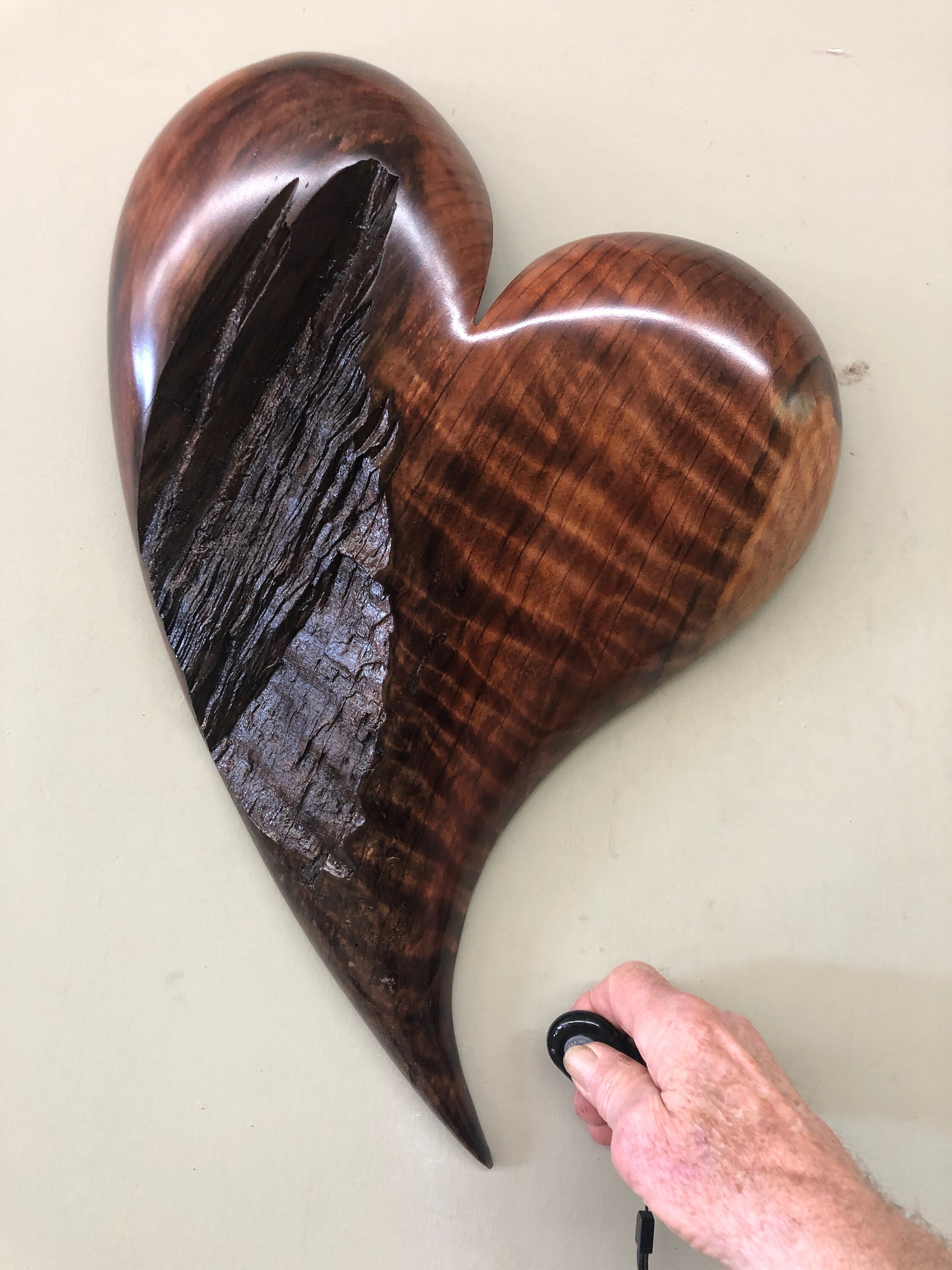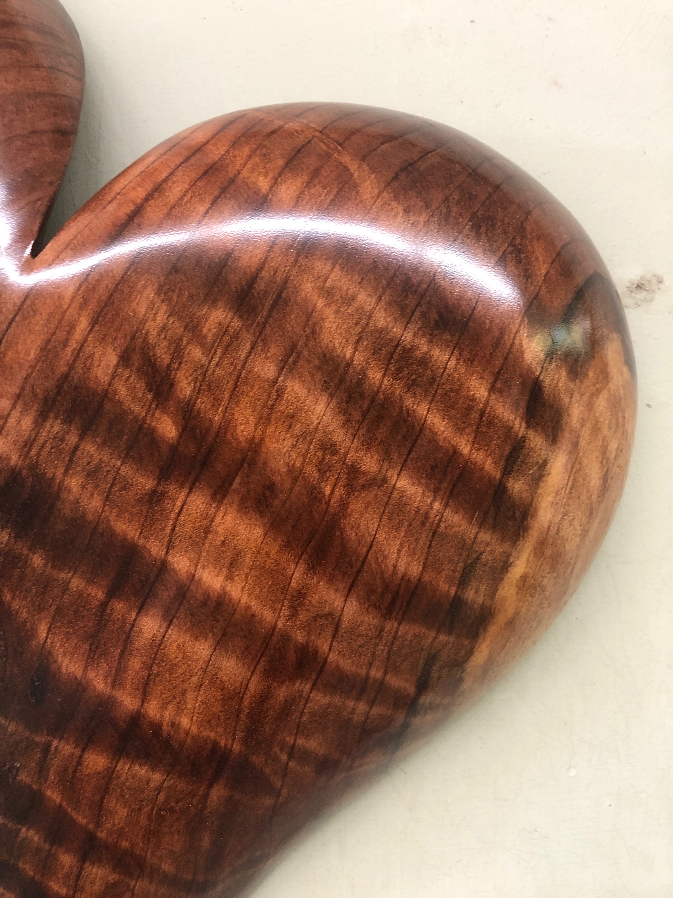 I just got this piece of wood not too long ago and couldn't wait to work it! A commercial fisherman friend here in Port Orford pulled this off of Battle Rock Beach 8 years ago. He had it milled and then did nothing with it. I traded him for it and am tickled to have it!! I don't get much Redwood these days! There is some great figure in the grain pattern! And I love the color. There is a darkening here and there that adds a lot of character to the piece. This isn't a blemish free heart but it has a wonderful feel to it. Like most of our hearts, it has been through some times that have tested it's love. Love and Gratitude!