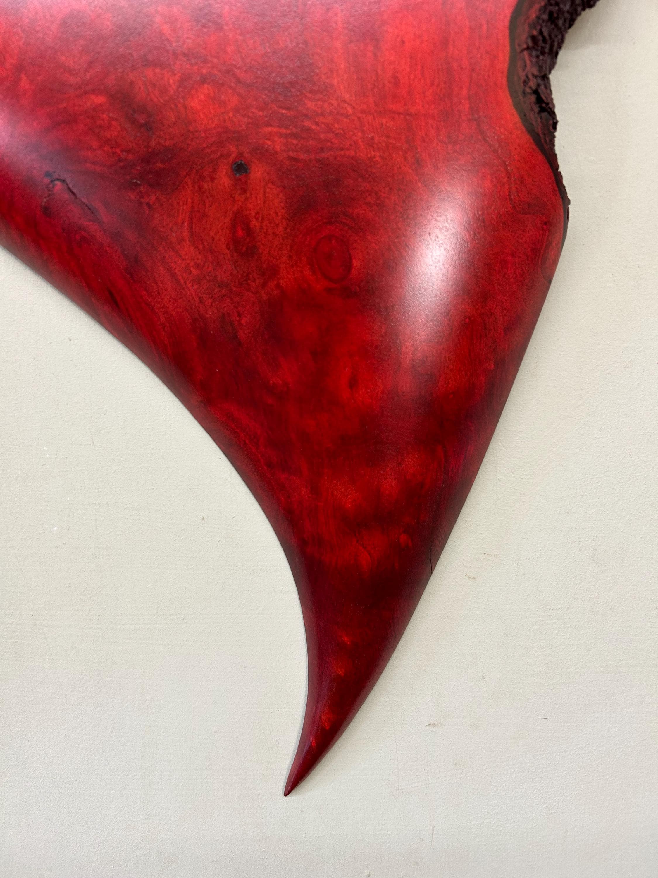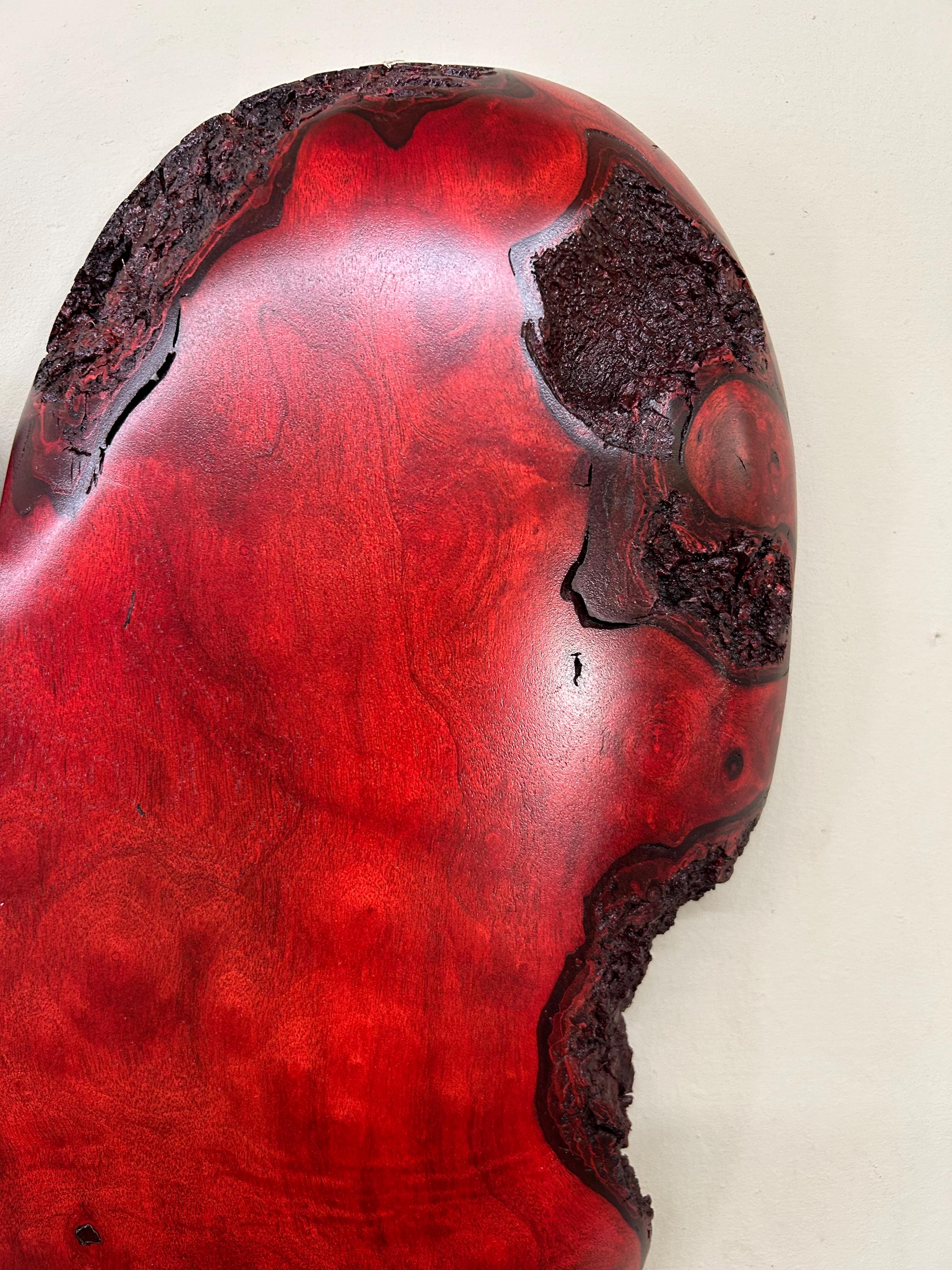 It's carved out of a Myrtlewood burl that I dyed a red. I have fastened a self leveling hanger for hanging and it is signed Wiz on the back.