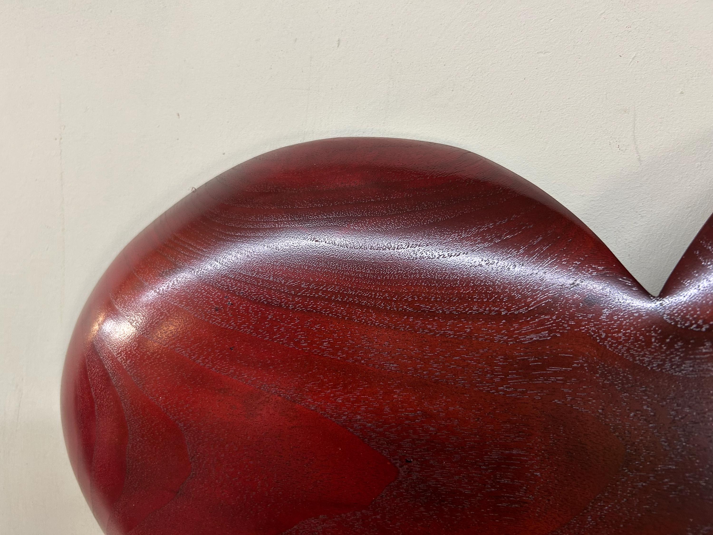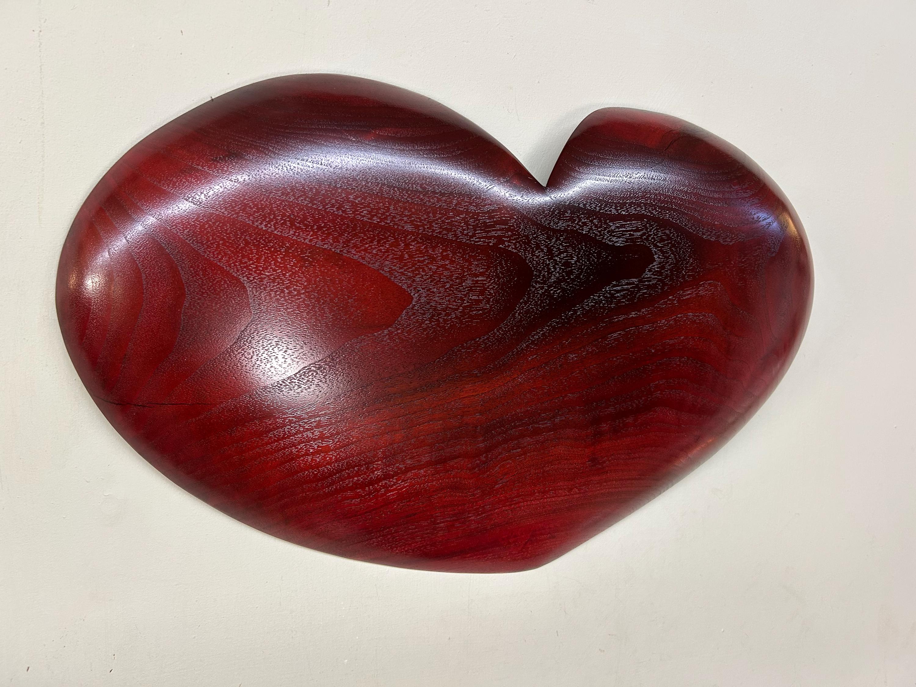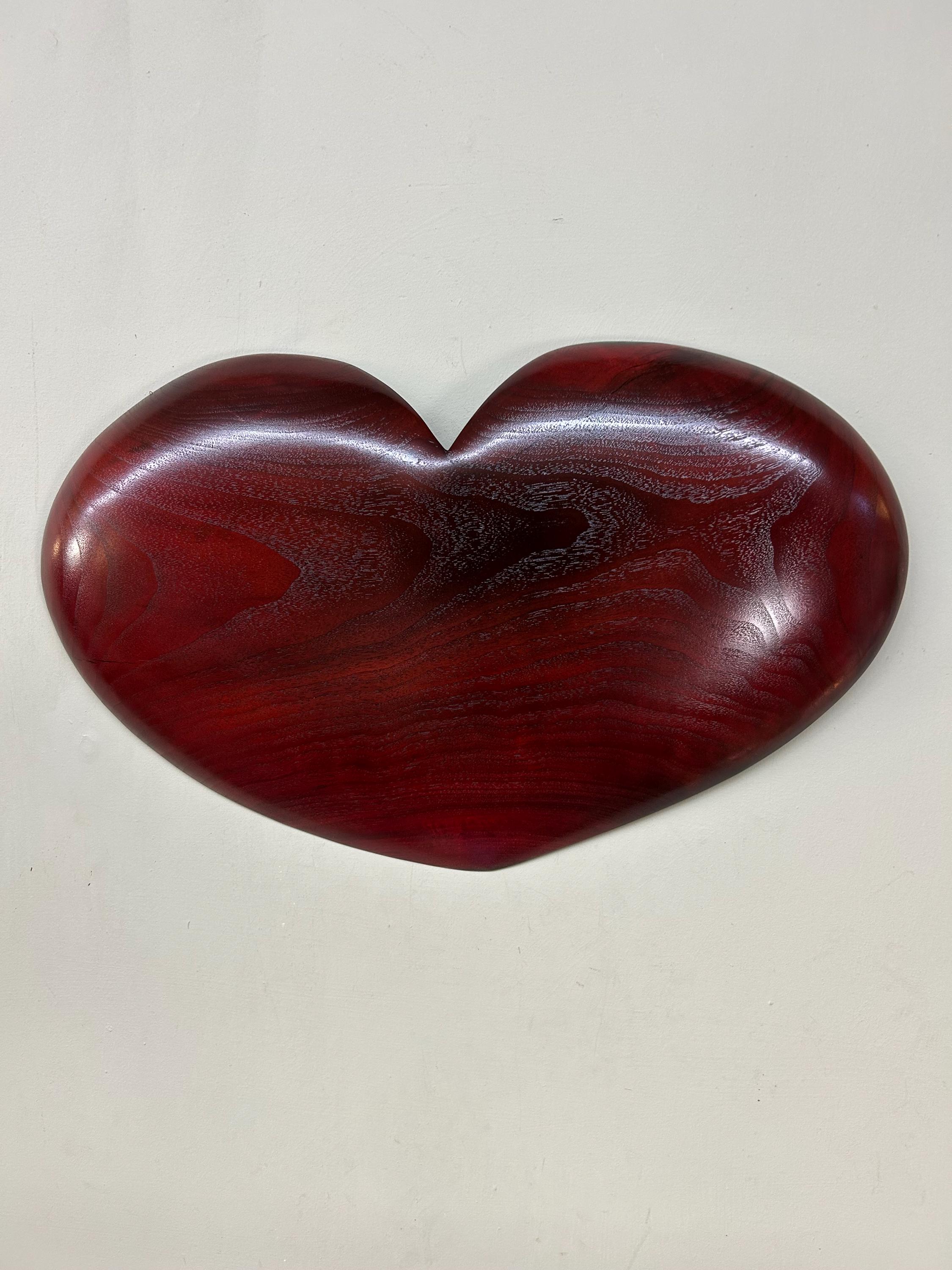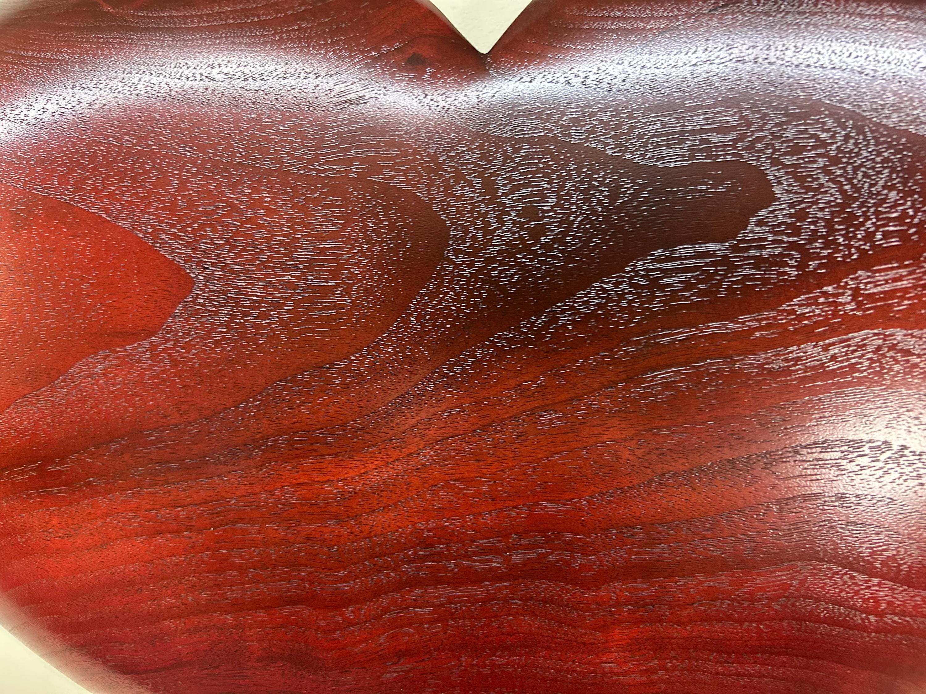 A Valentine's day gift present Walnut red wall heart art. It would be a perfect any occasion gift present!! I am Gary Burns the treewiz or Wiz. This piece comes ready to hang on the wall. It measures 12" tall x 19 1/2" wide x 1 1/2" thick. It's carved out of a piece of Black Walnut that I dyed red.