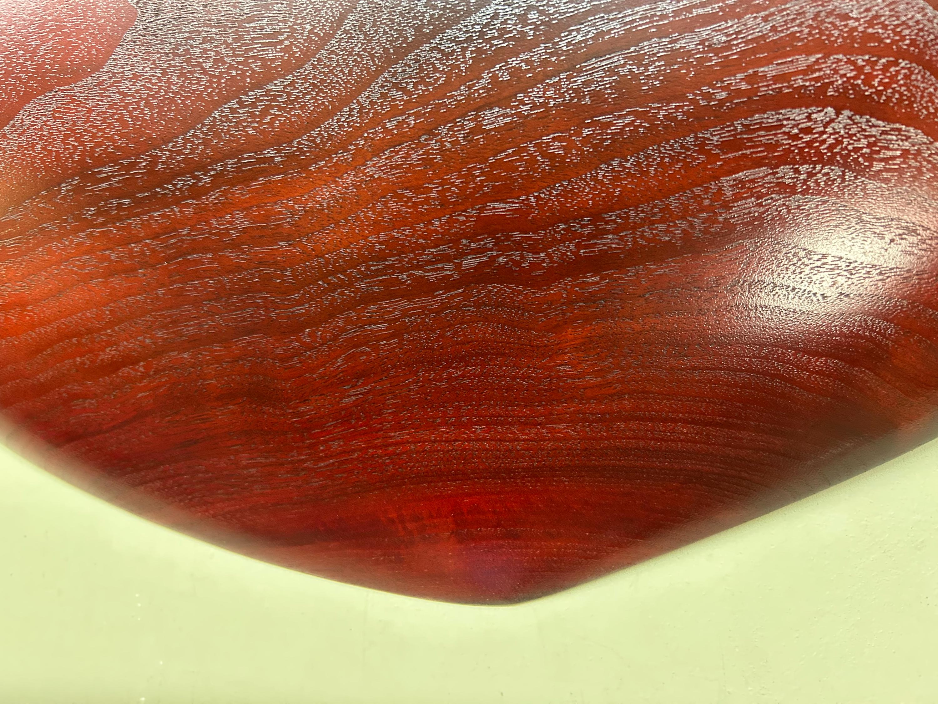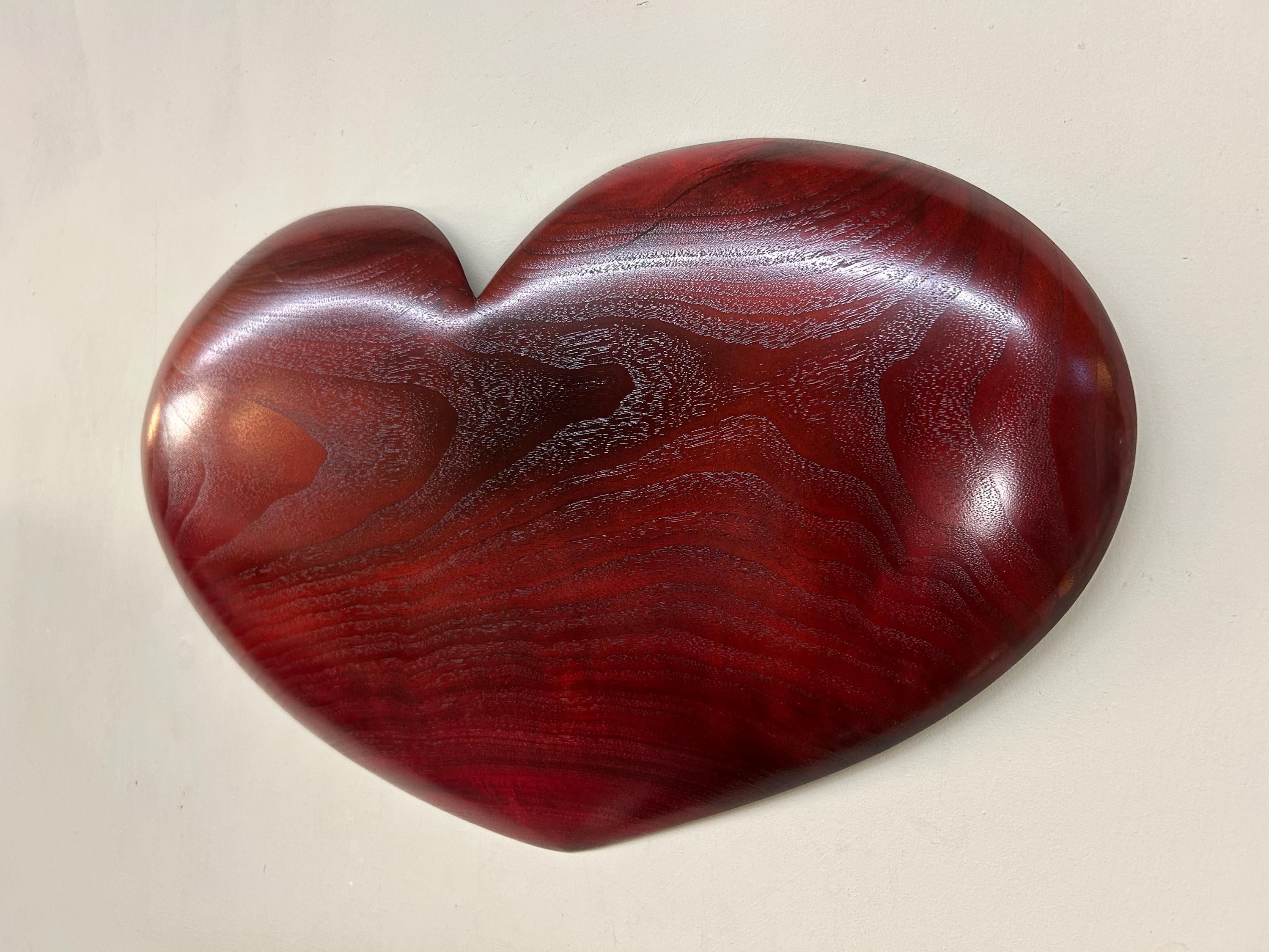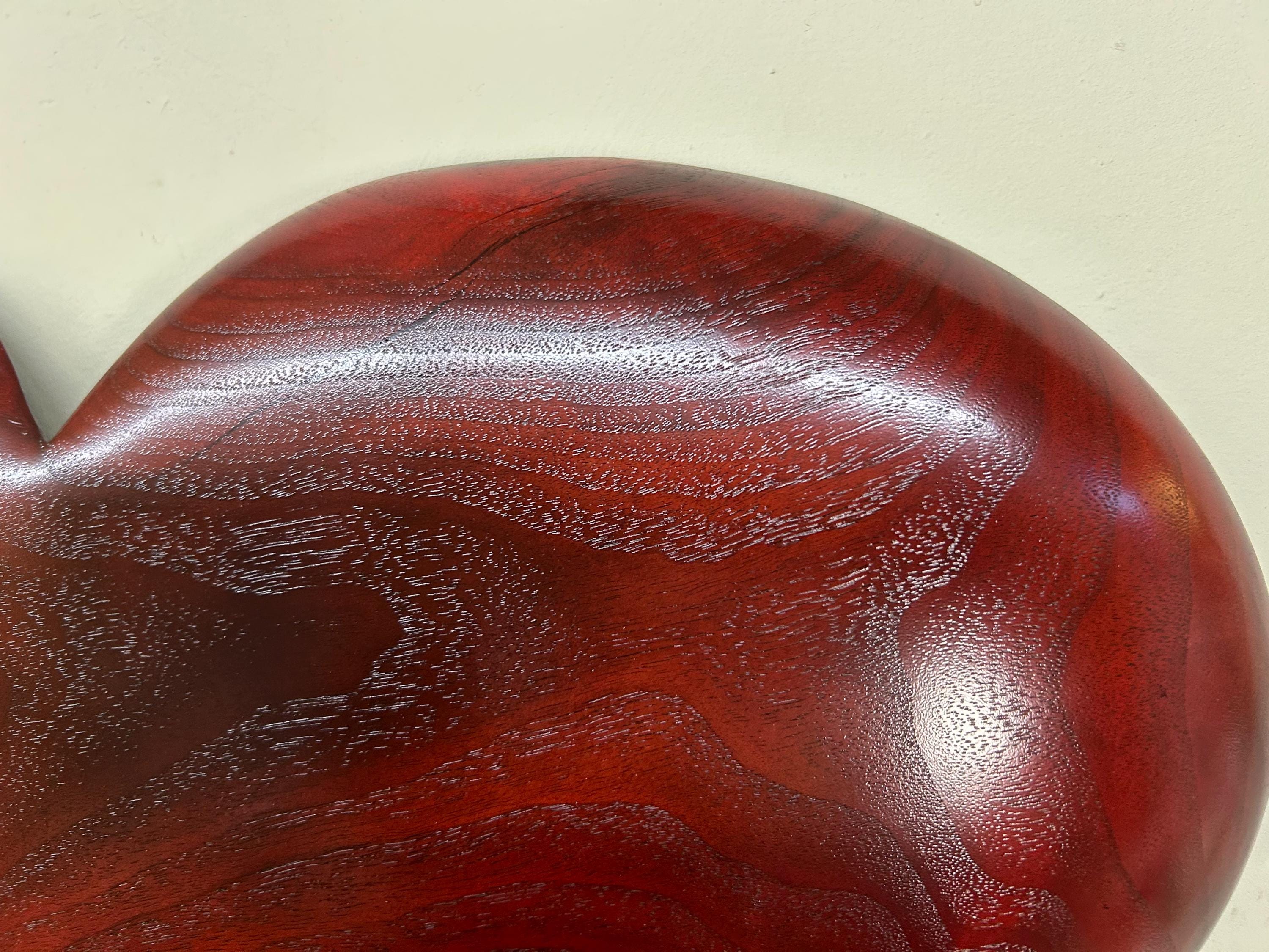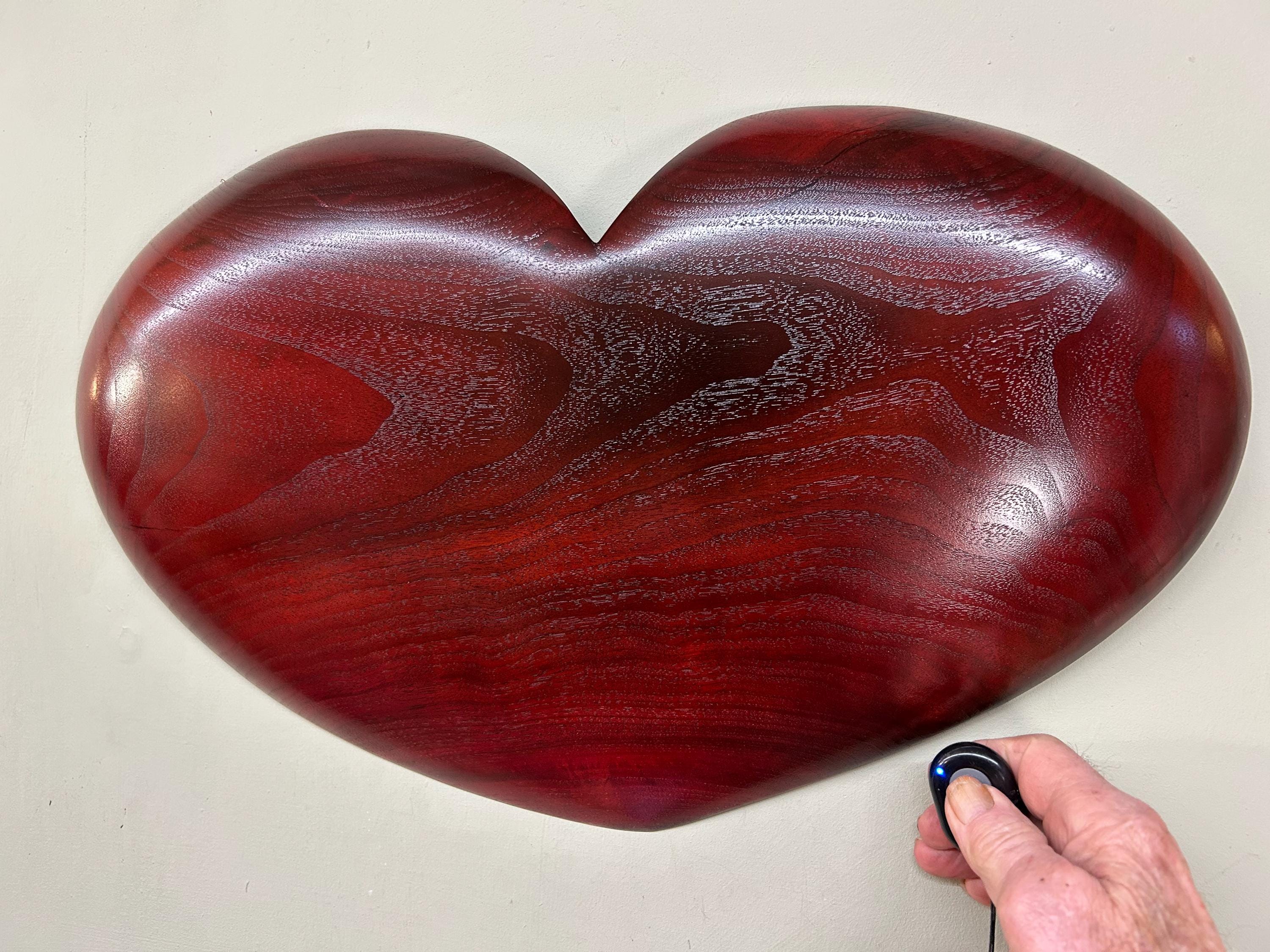 A Valentine's day gift present Walnut red wall heart art. It would be a perfect any occasion gift present!! I am Gary Burns the treewiz or Wiz. This piece comes ready to hang on the wall. It measures 12" tall x 19 1/2" wide x 1 1/2" thick. It's carved out of a piece of Black Walnut that I dyed red.