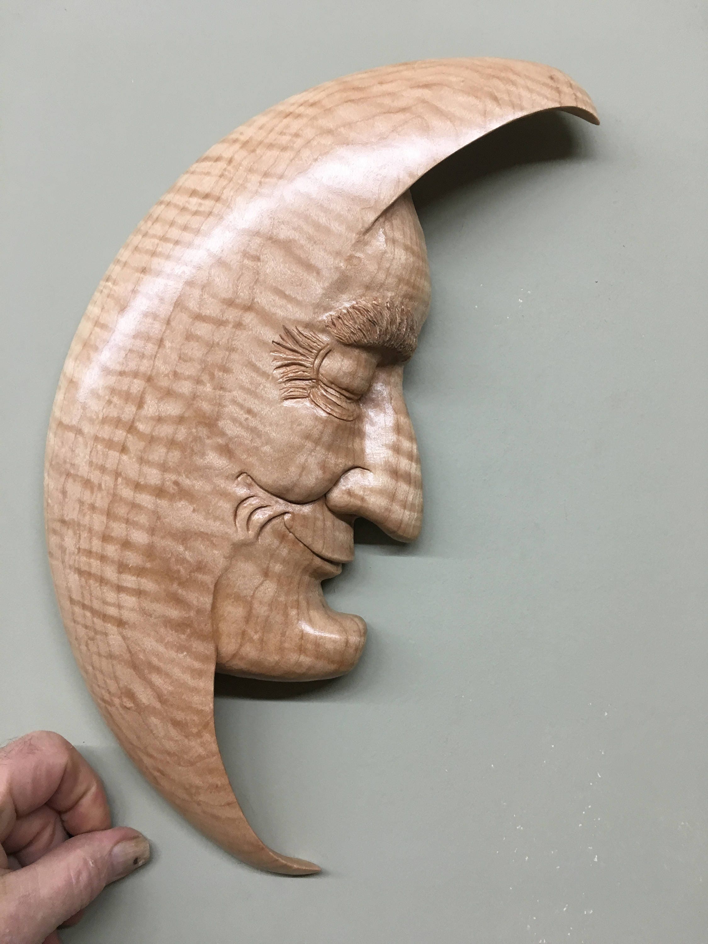 This Moon Man Wood Carving of the Man in the Moon is a Unique Art Wood Sculpture Present. He is a Ooak Moon Man Fantasy Gift wall hanging. I really love this Man in the Moon. He has a great attitude. I am Gary Burns the Treewiz and I carve everything in my shop. He measures 15" tall by 11" wide by 1" thick. He comes ready to hang on the wall. Dusting and a little Lemon Oil once in a while is all he needs to keep him looking like new. A wonderful any occasion gift!!