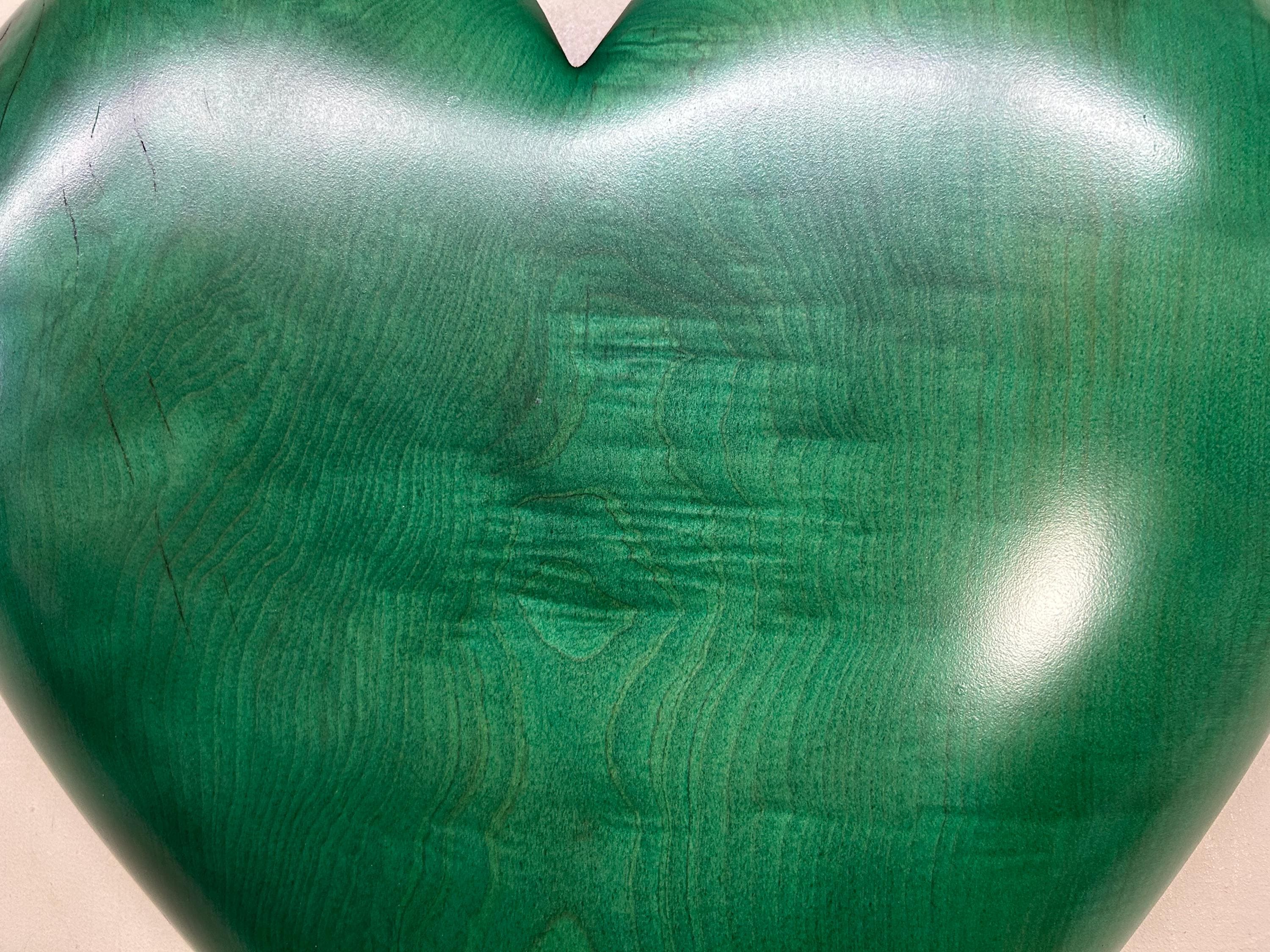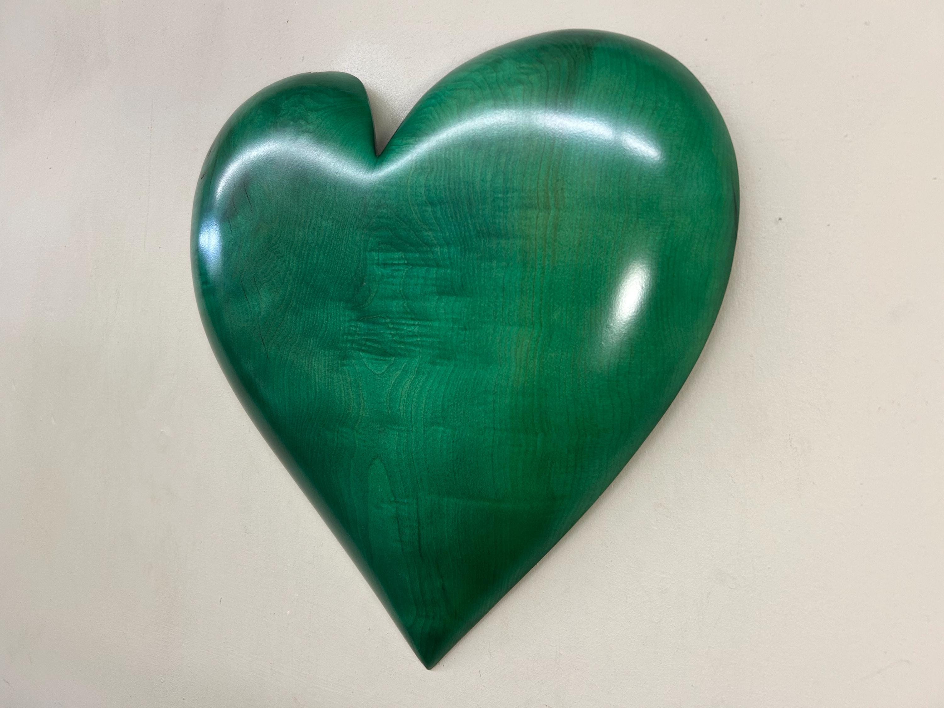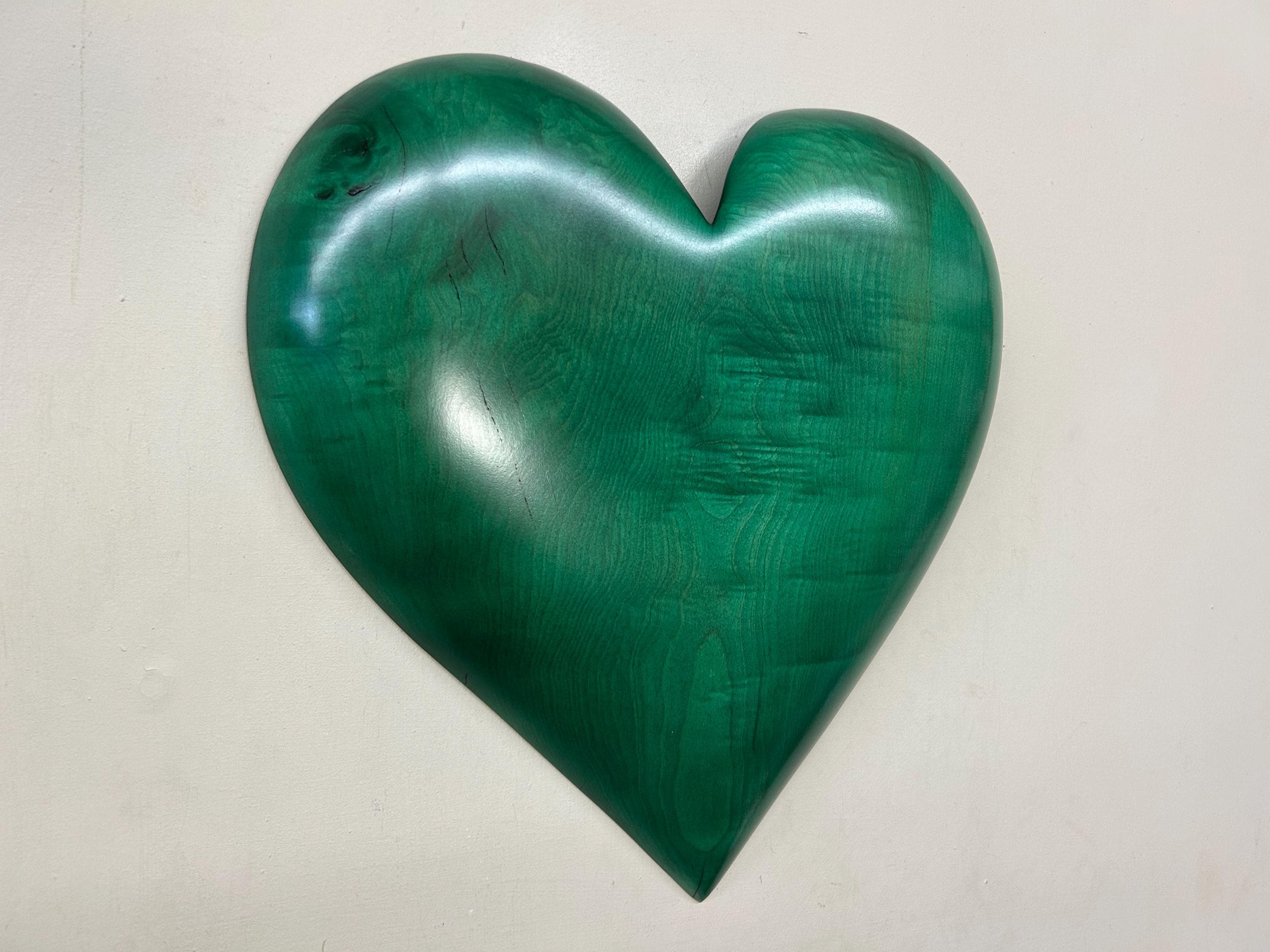 This is a loving Christmas gift present is carved out of white Cedar that I dyed green. It's a wood wall heart and would make a wonderful present for any occasion!! It comes ready to hang on the wall. There are 7 photos of this heart. There are some photos at the end of my gallery, The Tree Wizard Gallery at 2200 Jackson street in Port Orford, Oregon and of me in my shop carving. It measures 15 1/2" tall x 15" wide x 1 1/2" thick. I have attached a metal self leveling hanger on the back and I signed Wiz on the back as well.