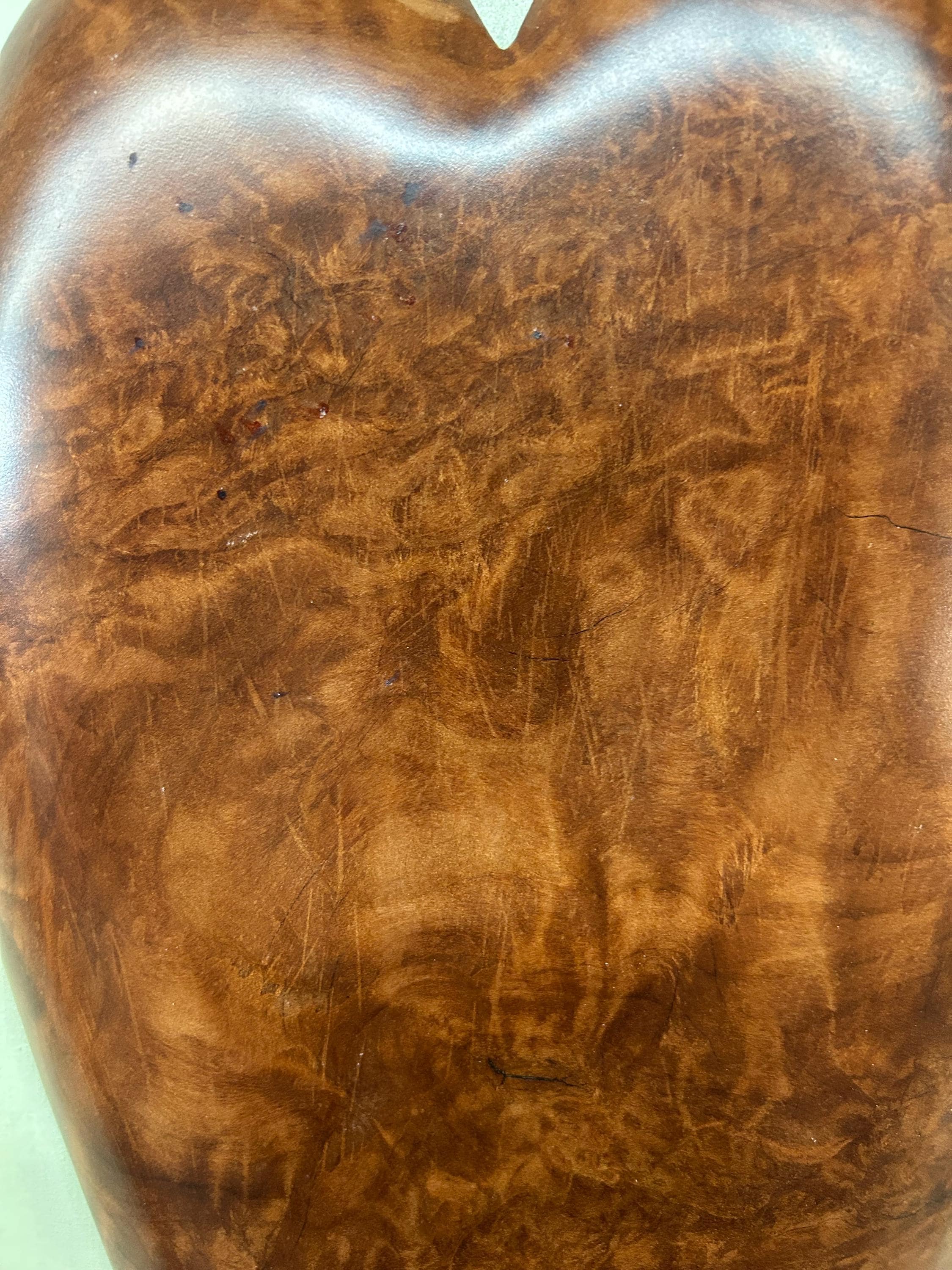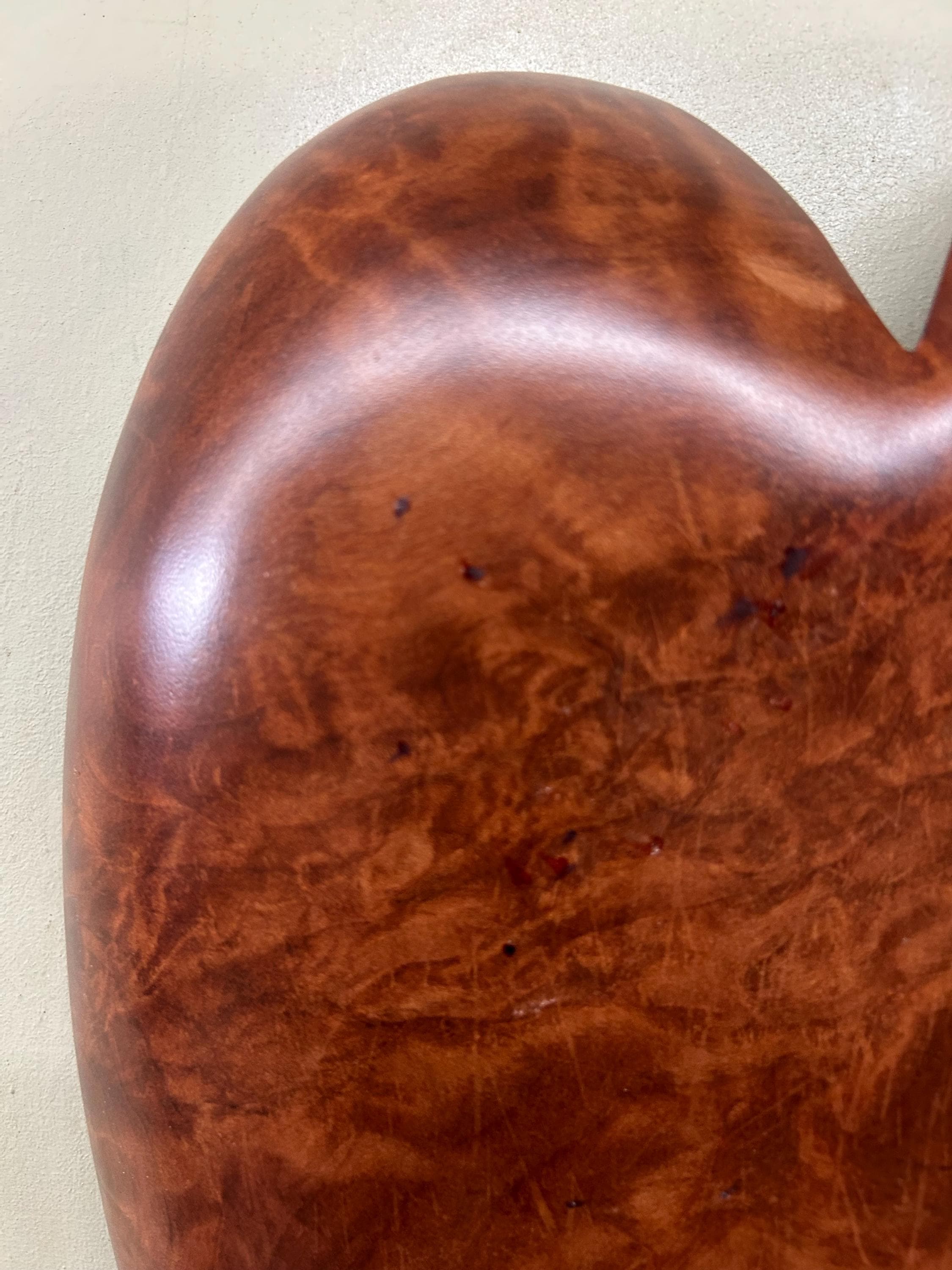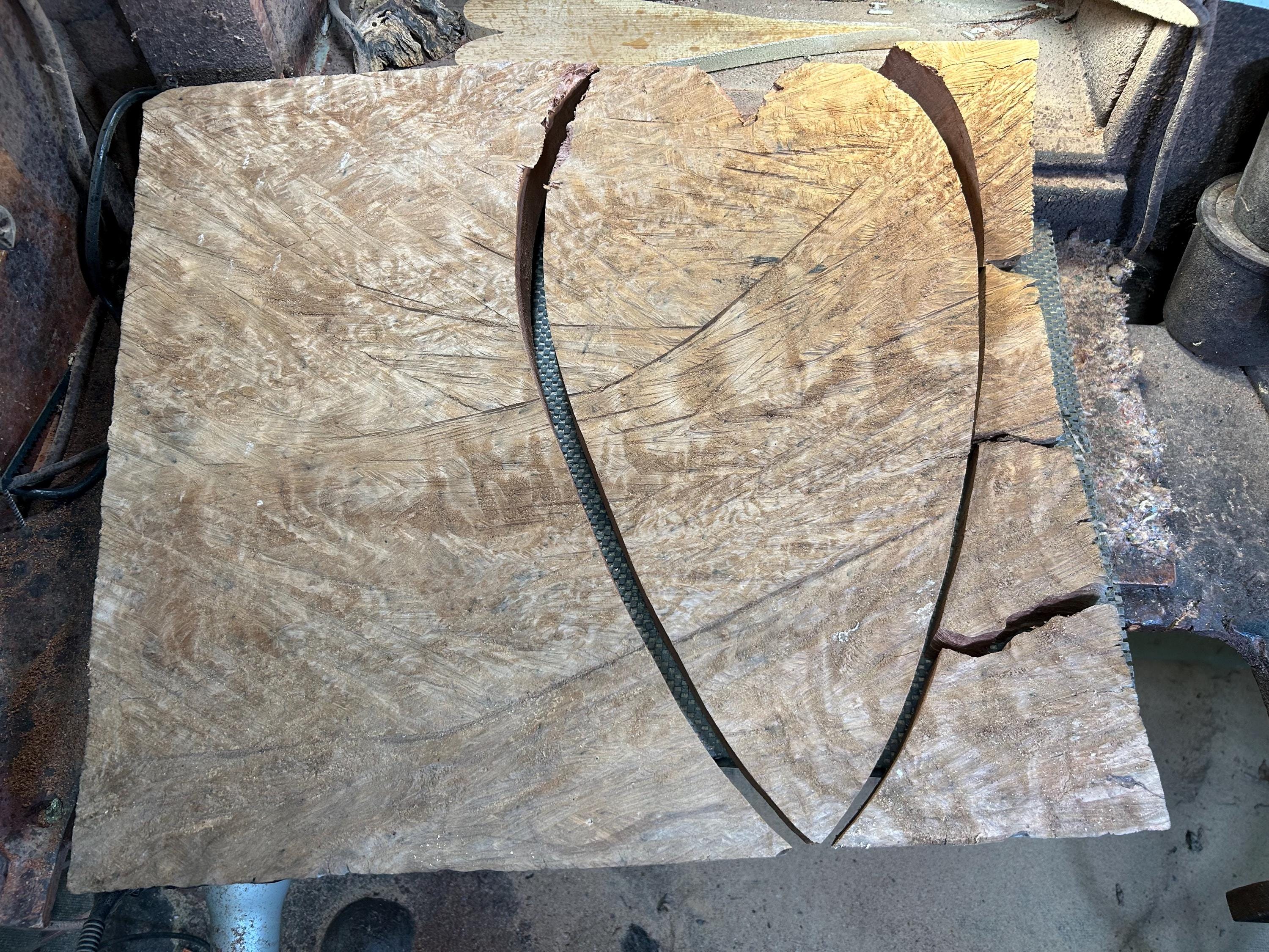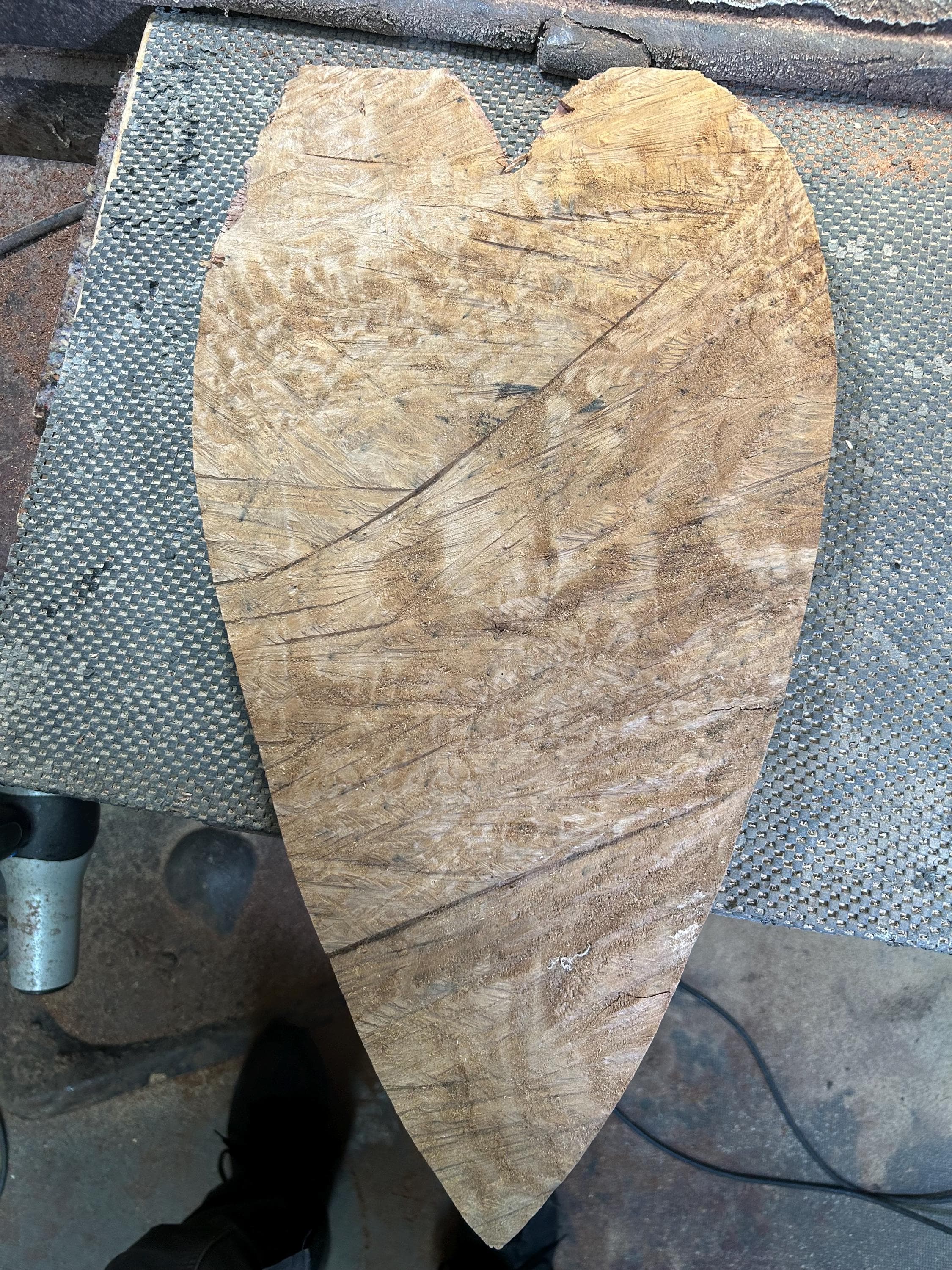 The second and third photos are of the beginning process. The 2nd photo is of the heart cut out but in the original slab and the 3rd photo is of the heart cut out of the slab all by itself. The 2nd to last photo is of me carving in my shop and the last if of my shop/gallery, The Tree Wizard Gallery in Port Orford, Oregon.