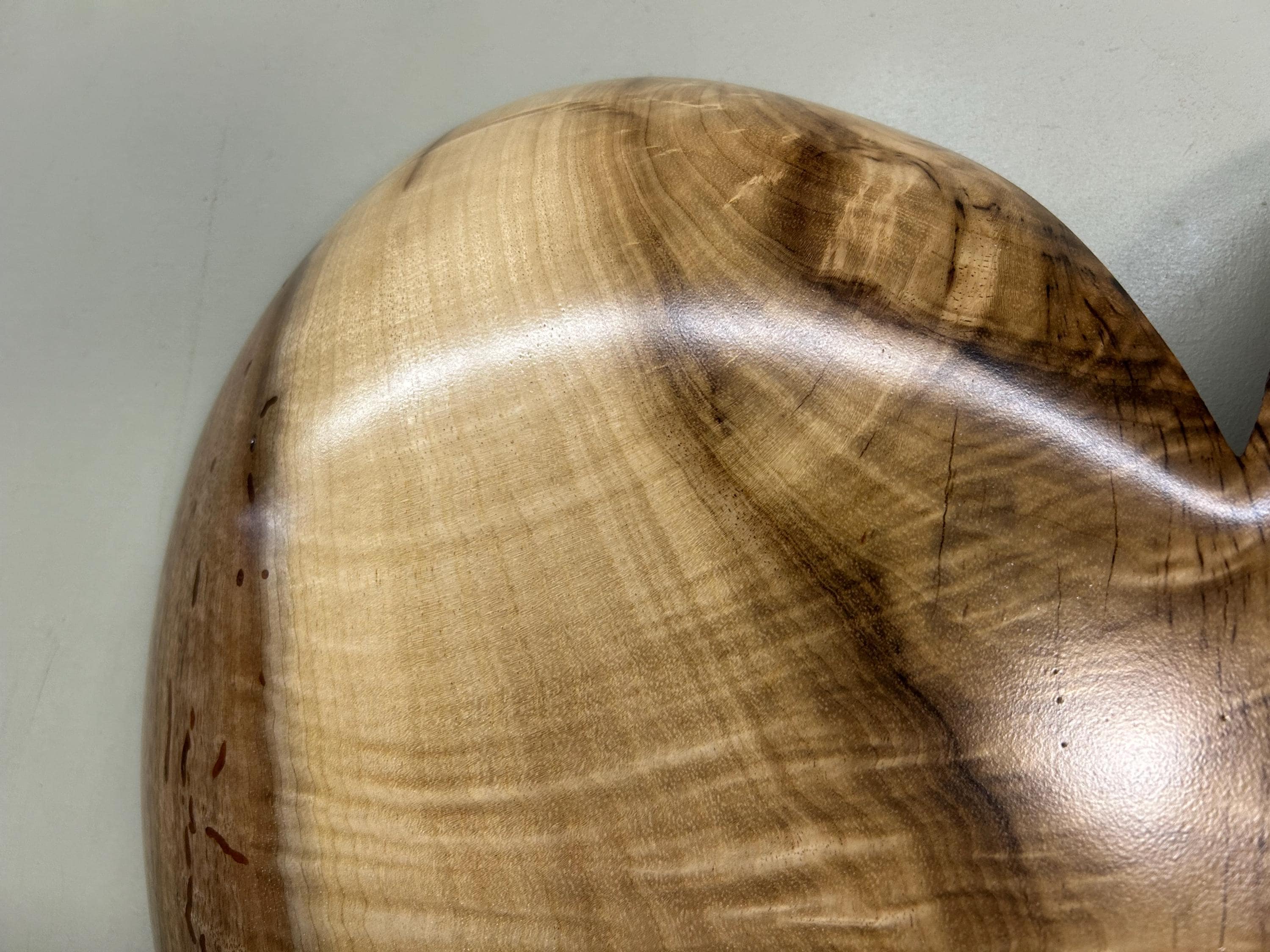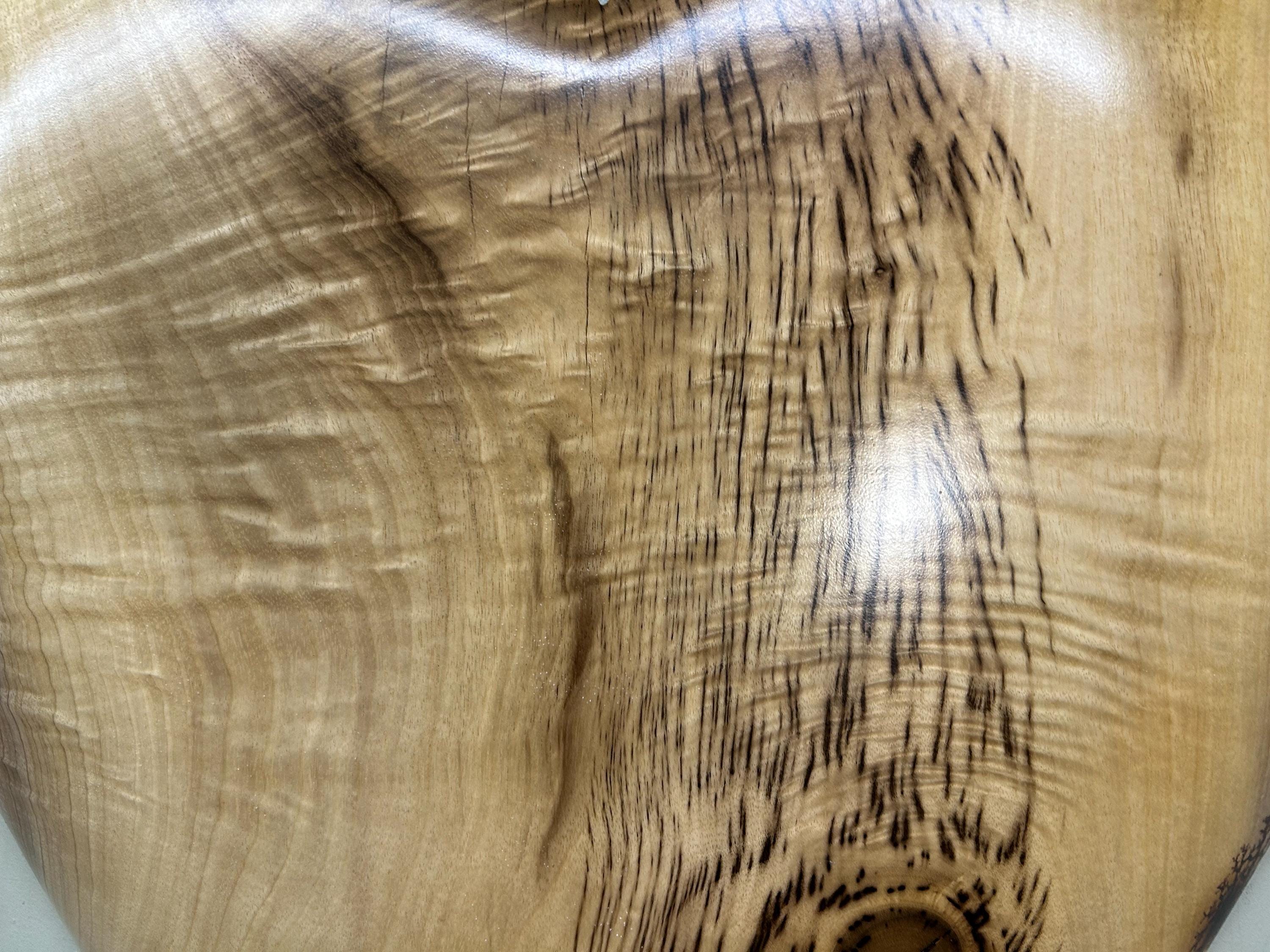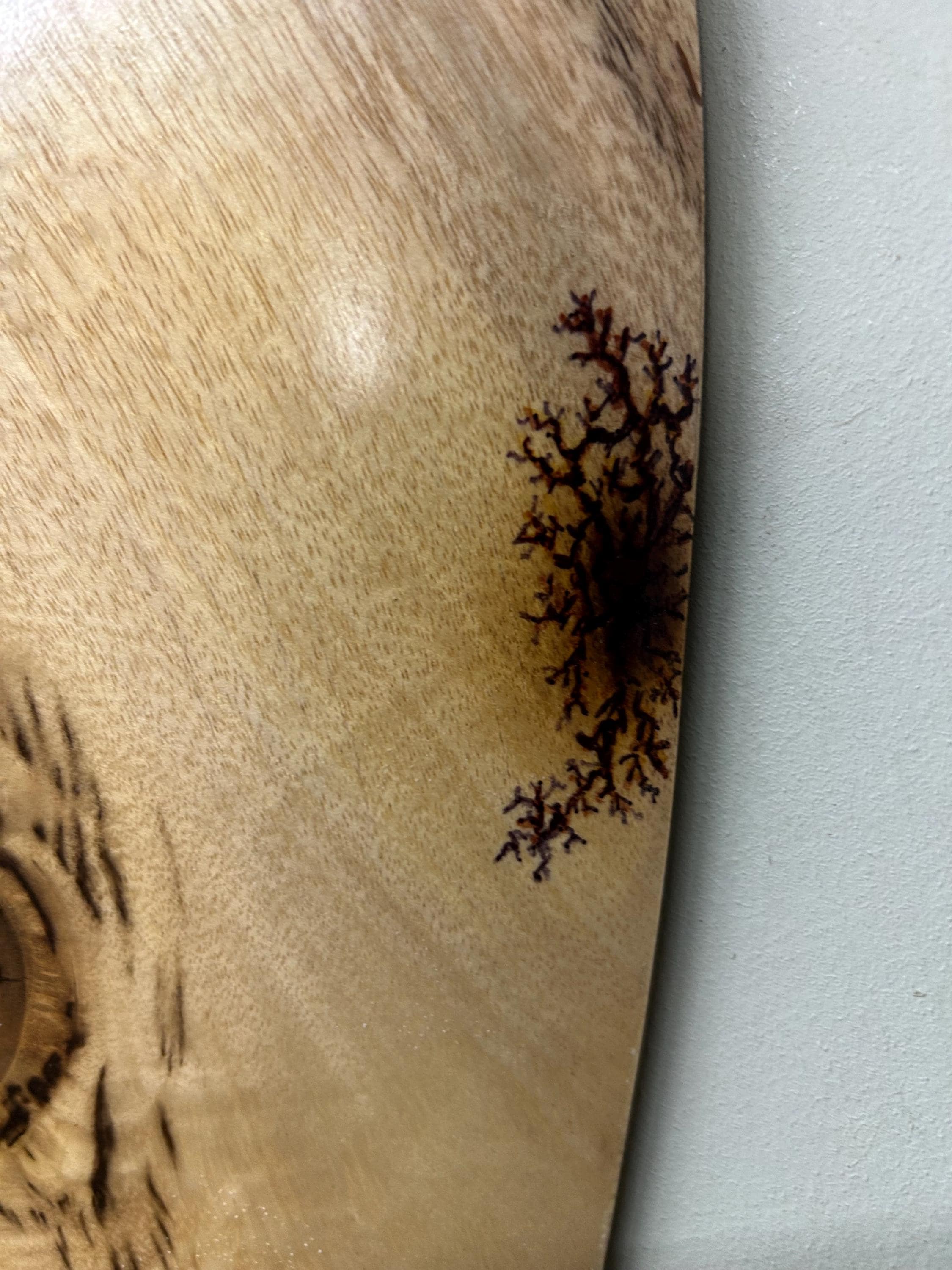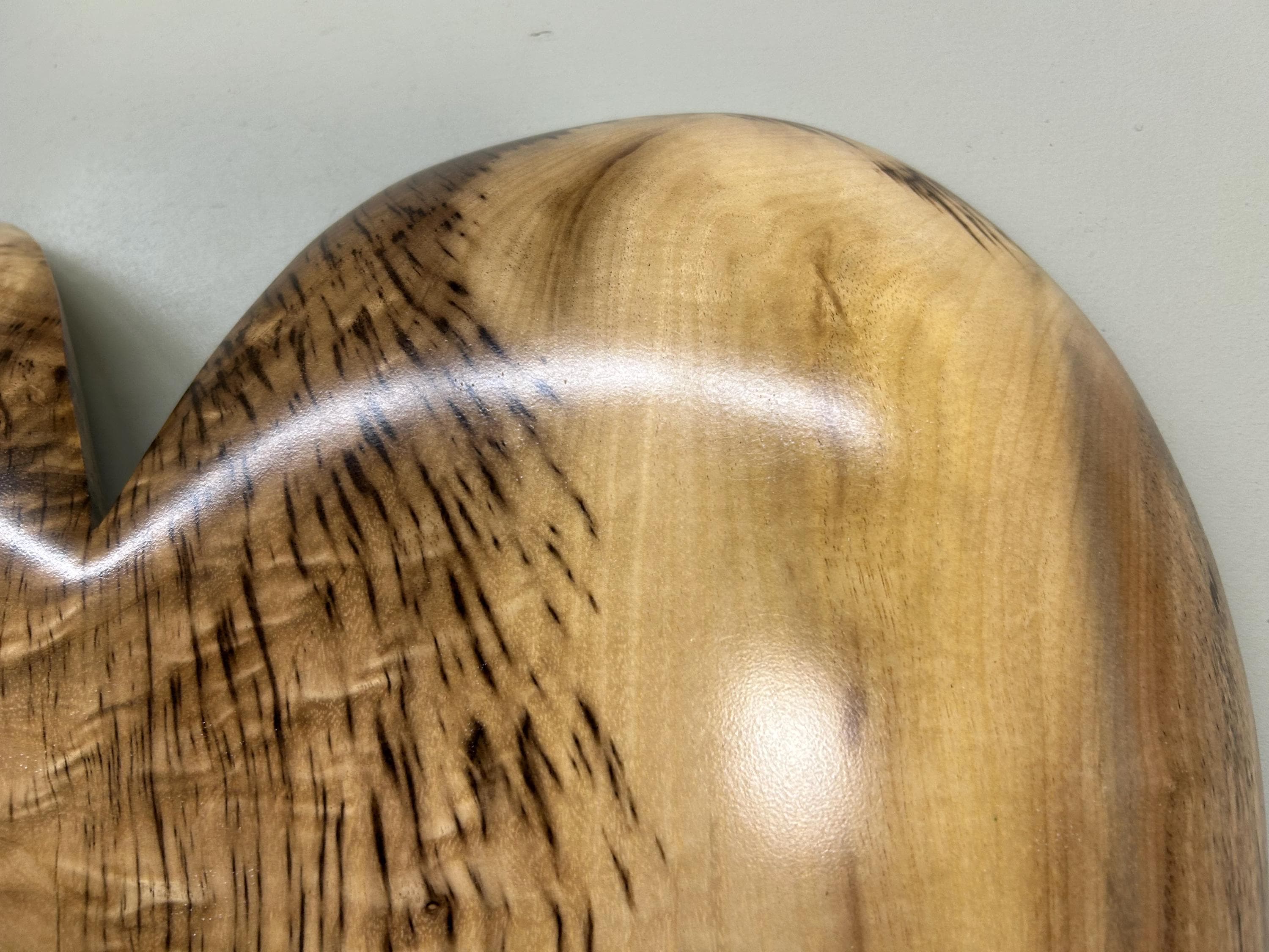 It's carved out of a Myrtlewood. I have fastened a self leveling hanger for hanging and it is signed Wiz on the back.