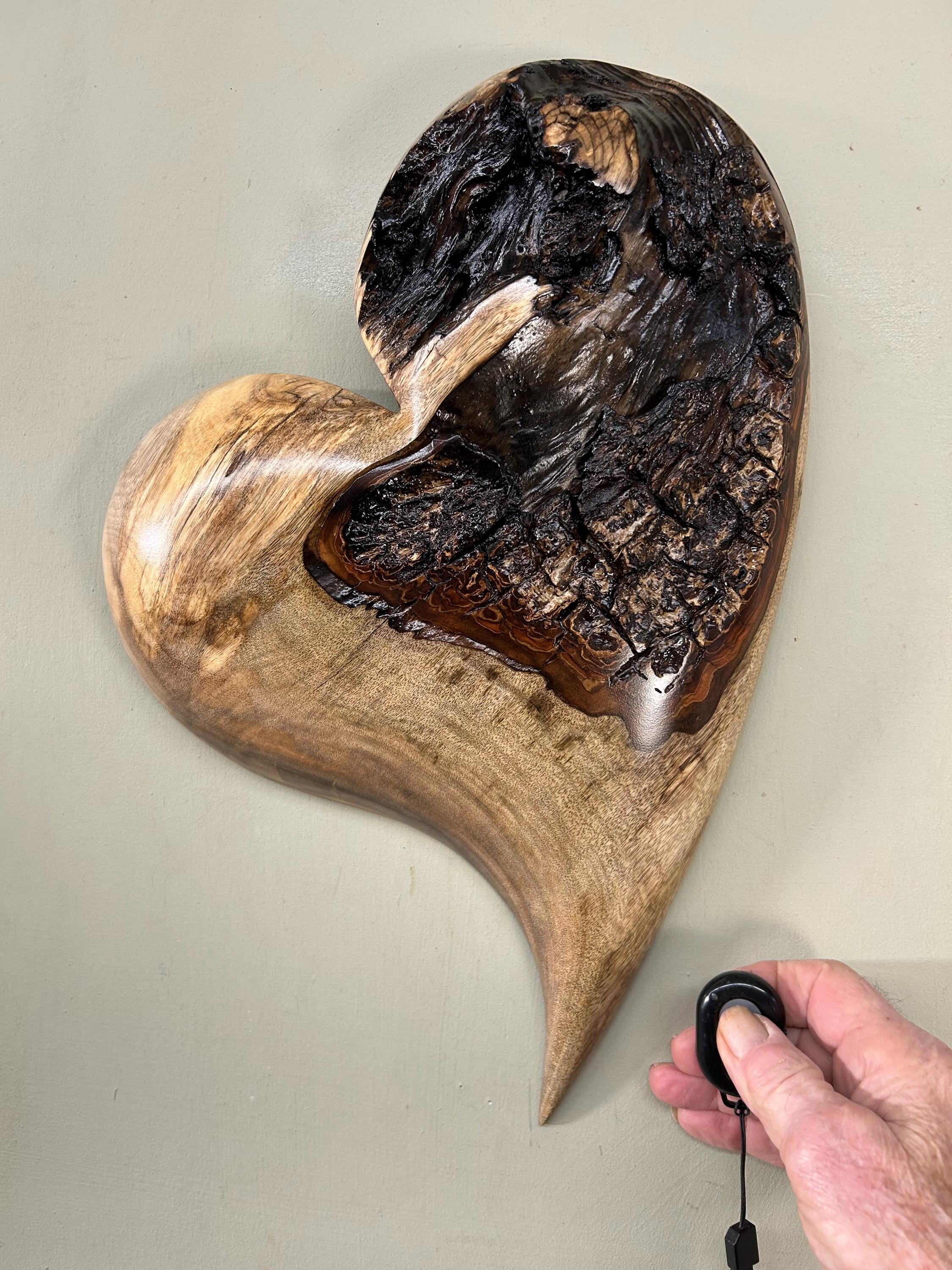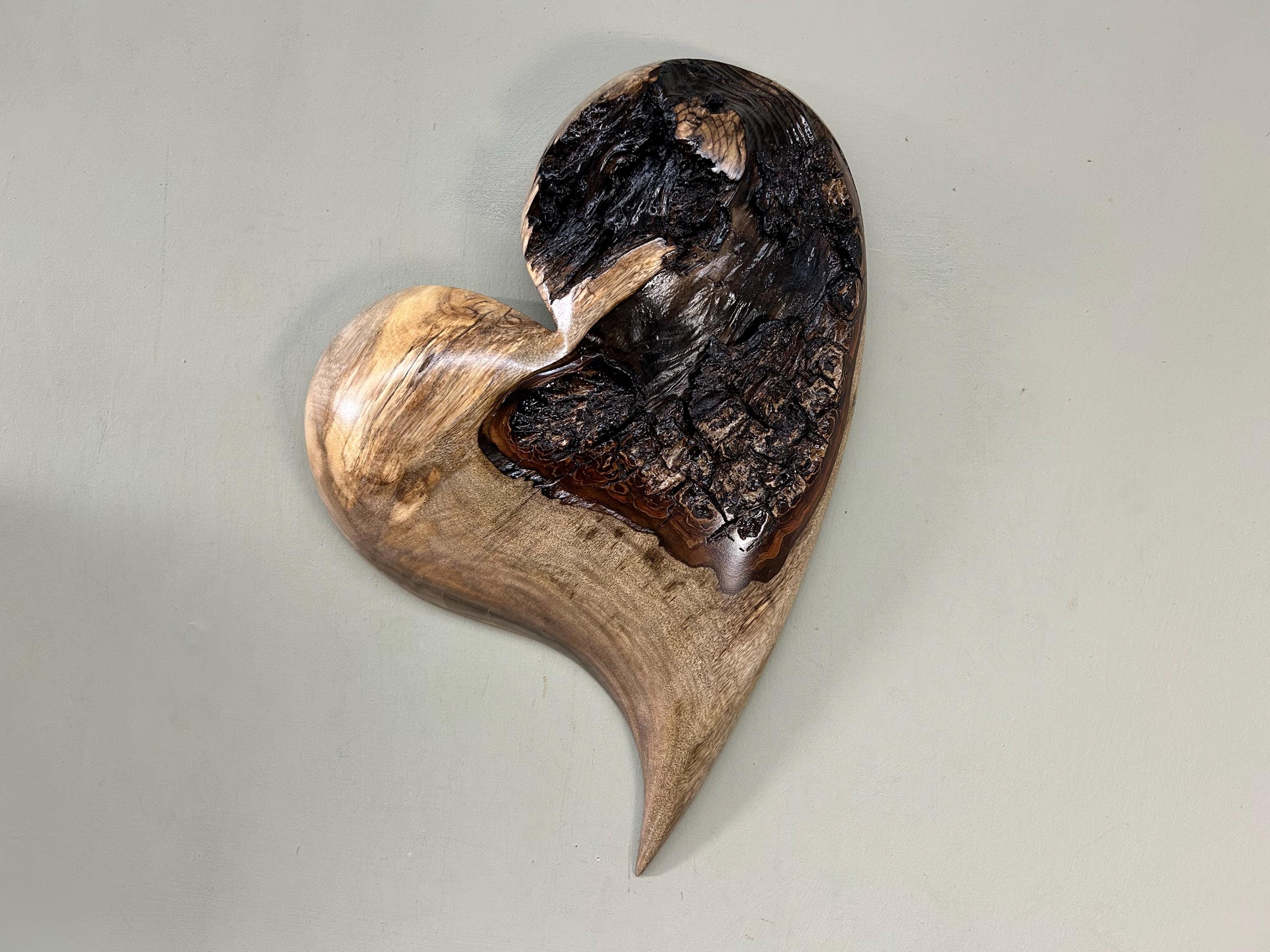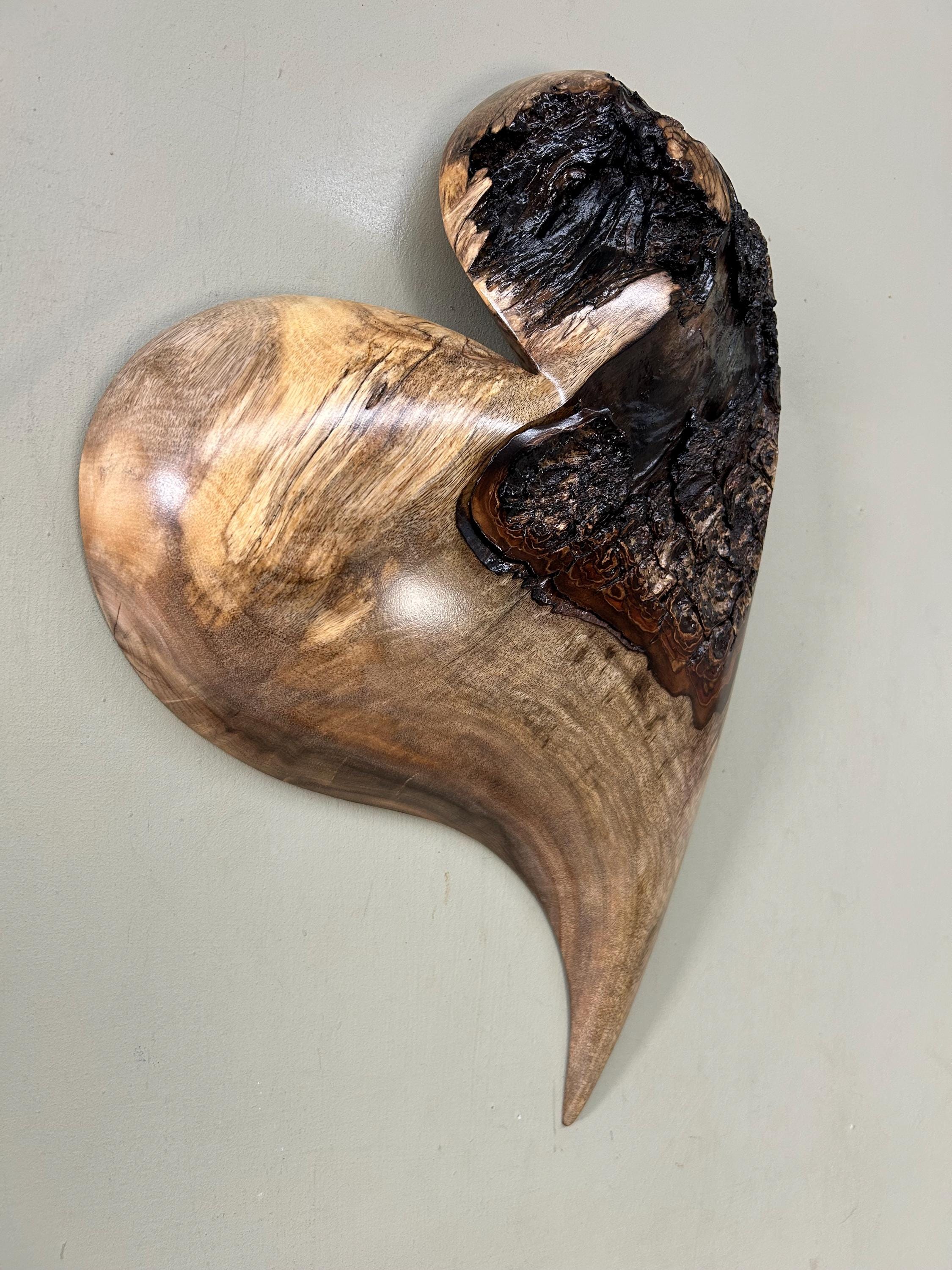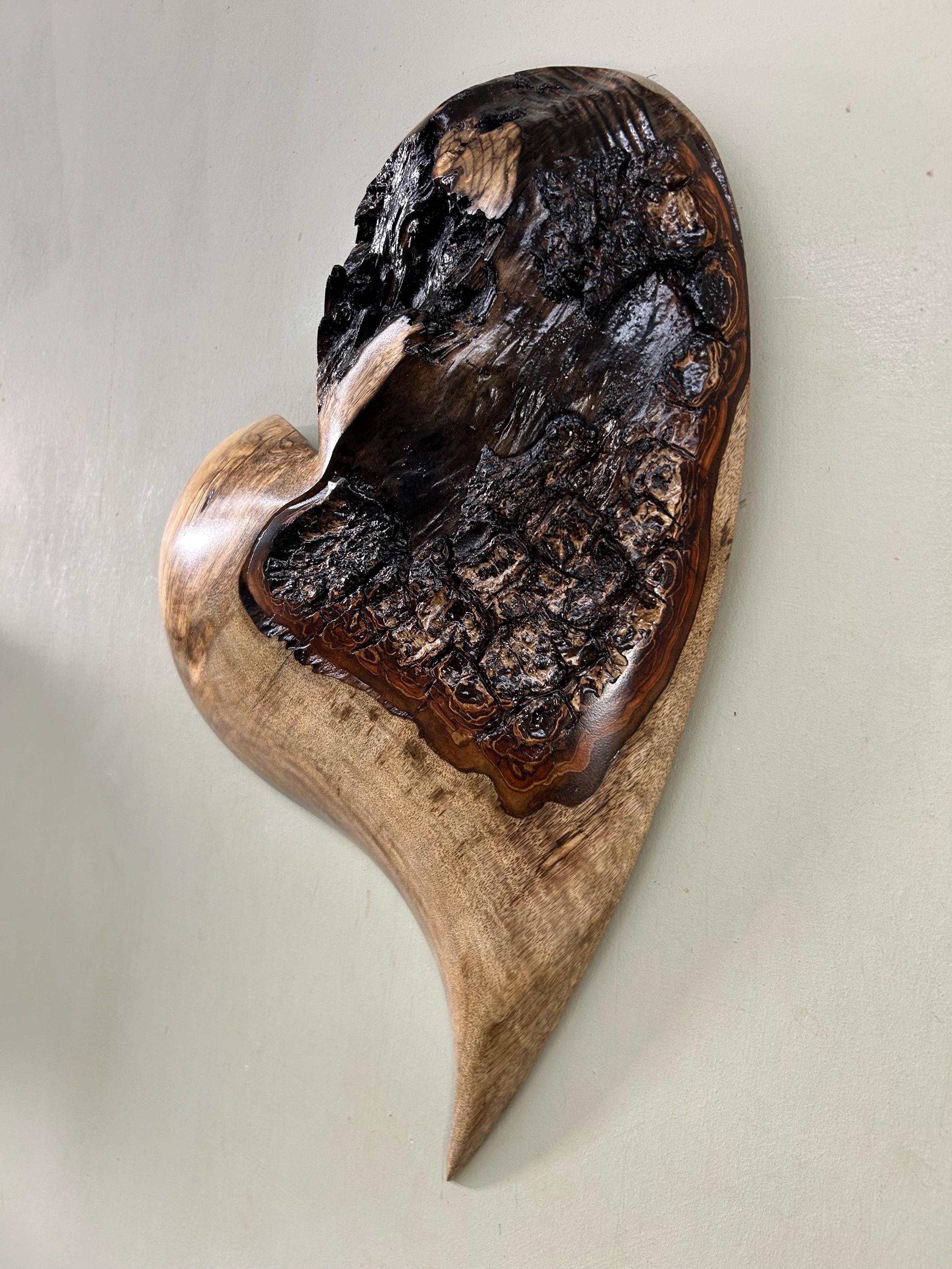 This is a Myrtlewood burl 50th Wedding Anniversary heart gift present . It's an amazing any occasion heart wall hanging!! It's flat on the back and is ready to hang on the wall with a metal self leveling hanger. There is an interesting natural edge in the middle. Really has an interesting grain pattern too.