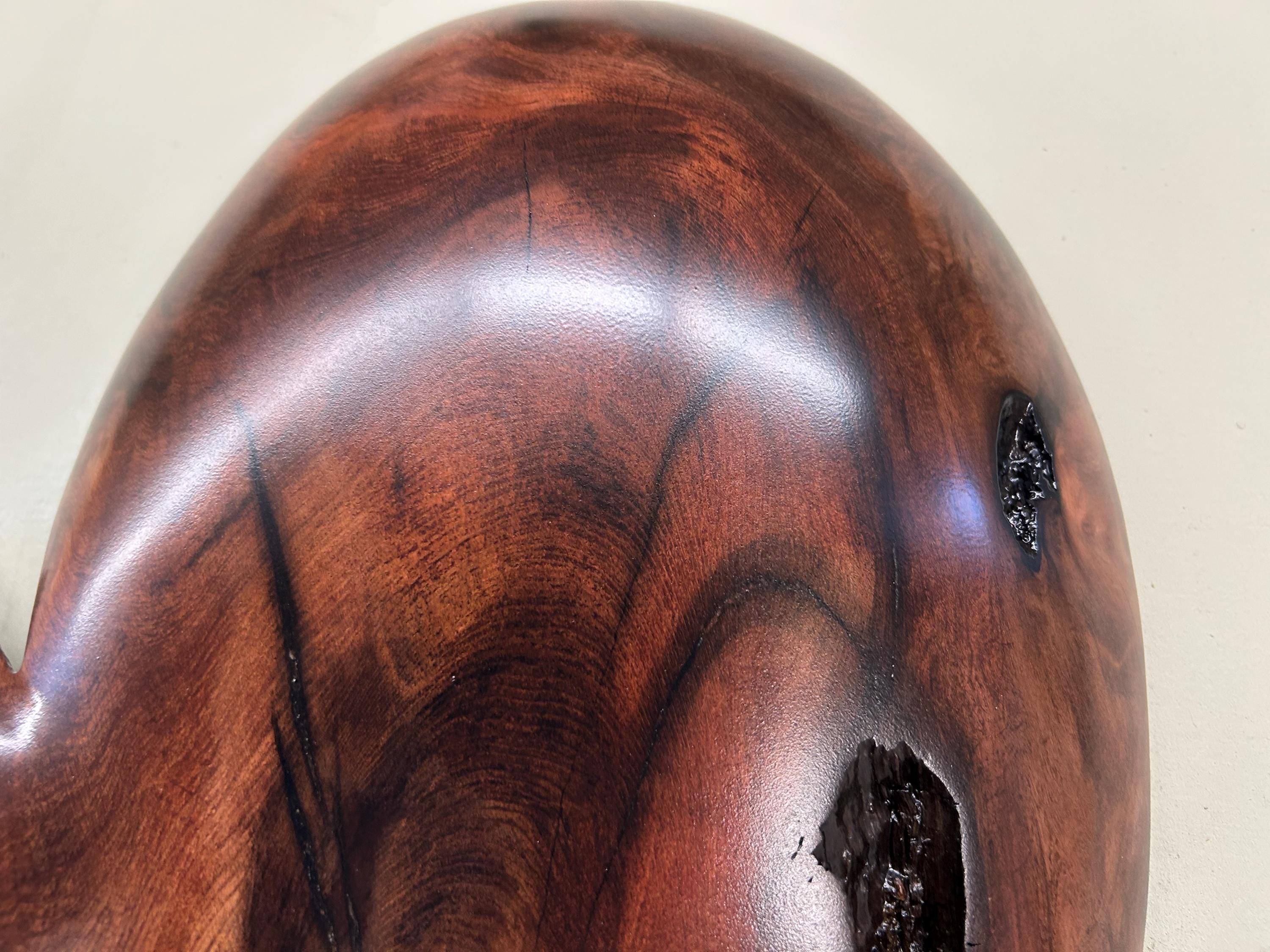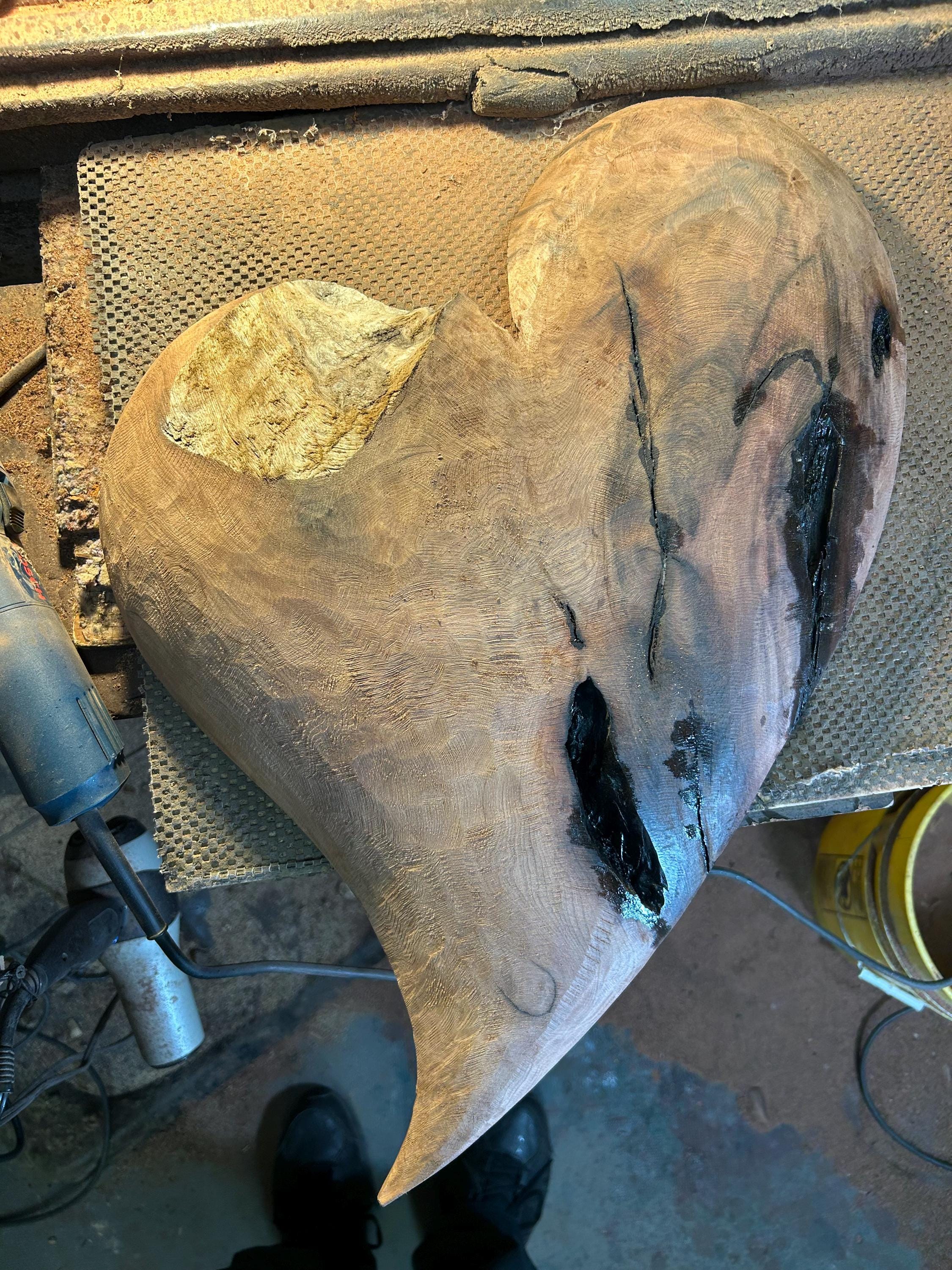 You can see more photos of this heart by clicking on the arrow on the right of the above photo. If you click on the photo it will go to a format that you can enlarge. One more click enlarges the photo. The second and third photos are of it in progress. The next to last photo is of me carving in my shop and the last photo is of my Gallery, the Tree Wizard Gallery in Port Orford, Oregon.