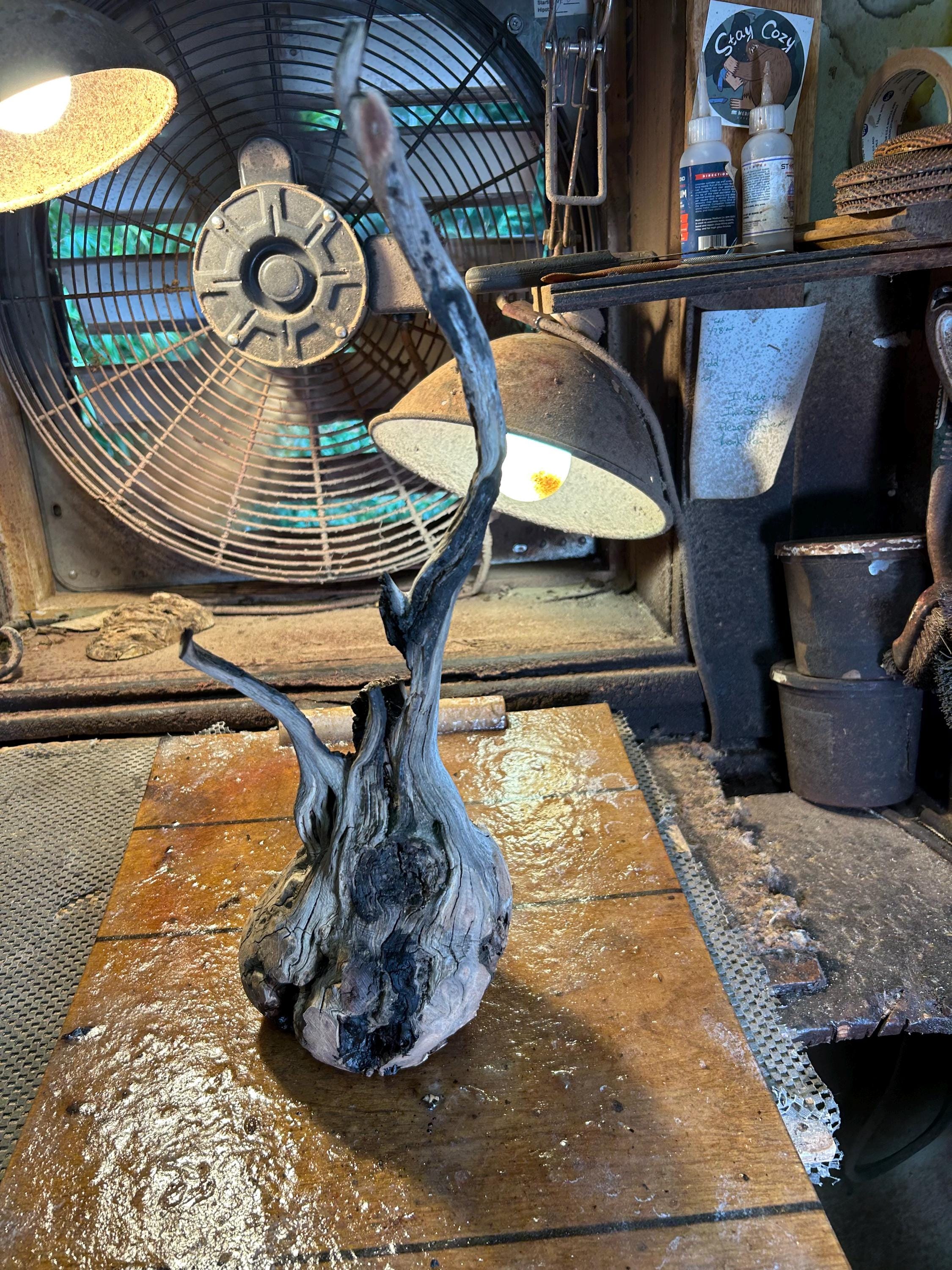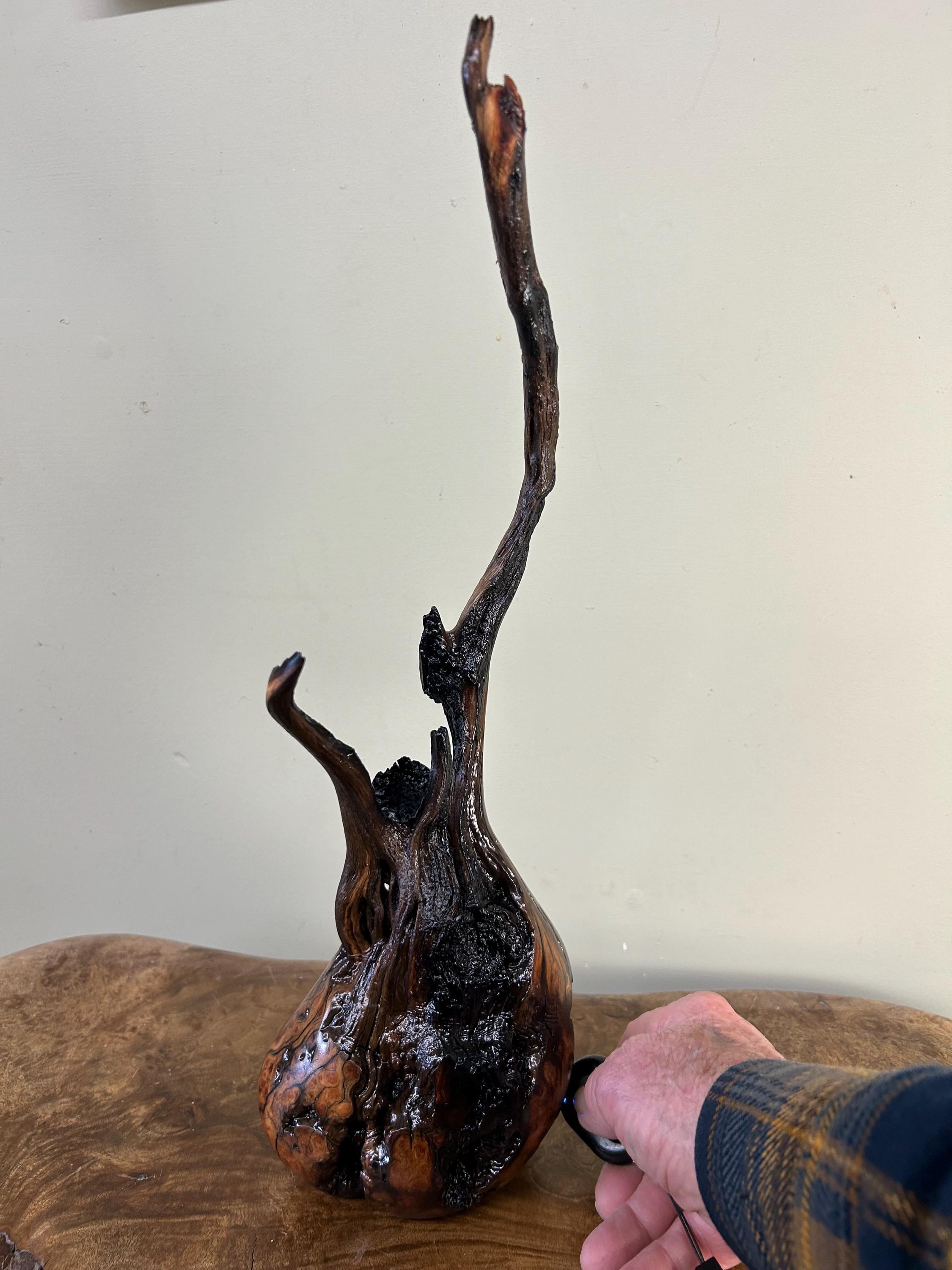This is a piece of Manzanita burl. These burls are not so easy to find. The burl is in the roots of the Manzanita. They often have voids and rocks that they can grow around. Tricky wood to work. But I love the results. It is a completely different piece with each small turn. I turned the carving 1/8 turn for each of the photos included. The next to last photo is of me carving in my shop. The last photo is of my shop/gallery, The Tree Wizard Gallery in Port Orford, Oregon.