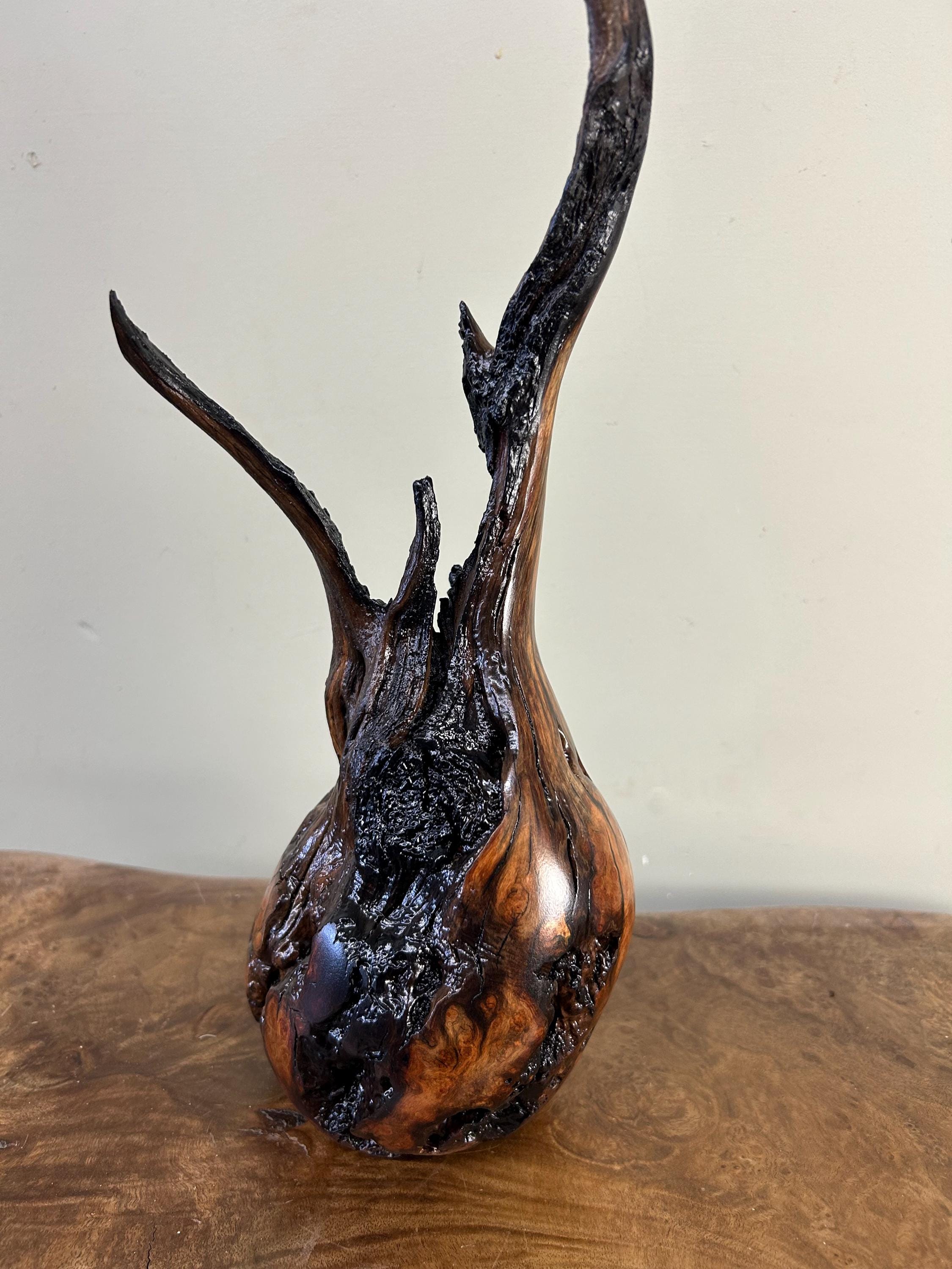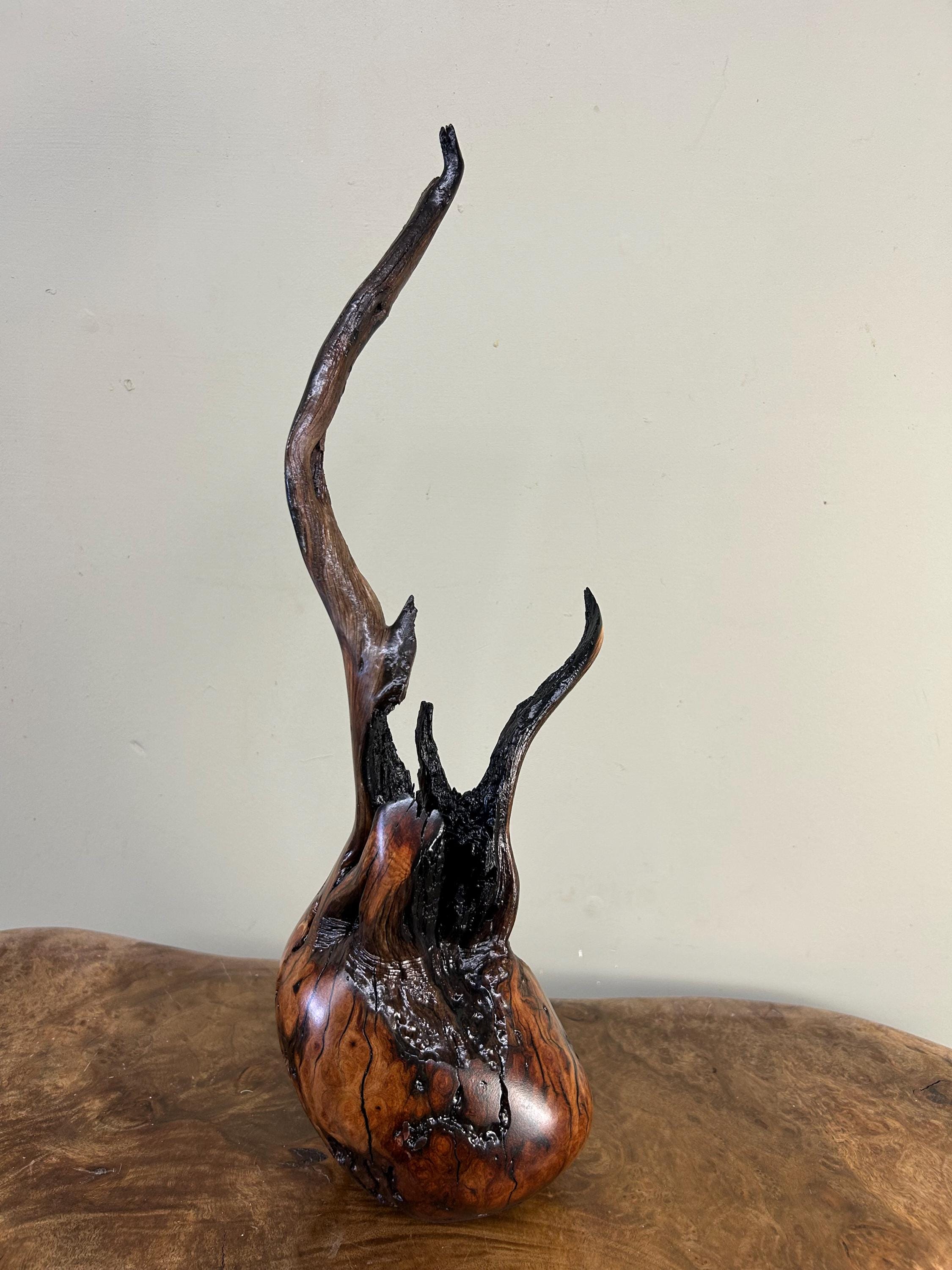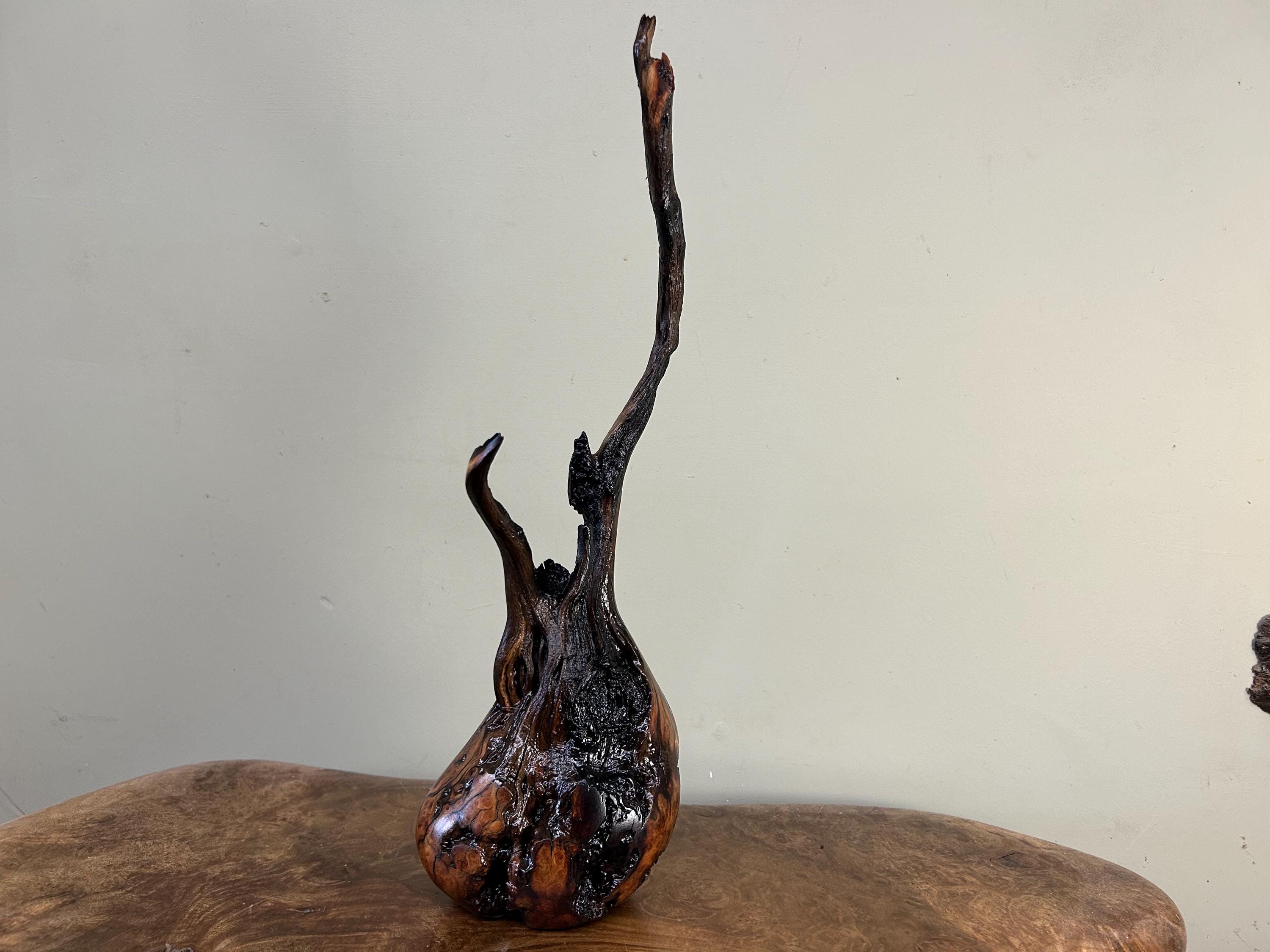 An abstract Manzanita art wood carving sculpture. It would make a unique mantle sculpture. This piece sets on a Table, shelf or Mantle. It measures in at 17" tall x 5 1/2" wide" x 4 1/2" deep. The second photo is of it in progress. And there's a video of this piece. PRIORITY USPS SHIPPING IS INCLUDED IN ALL OF MY CARVINGS!