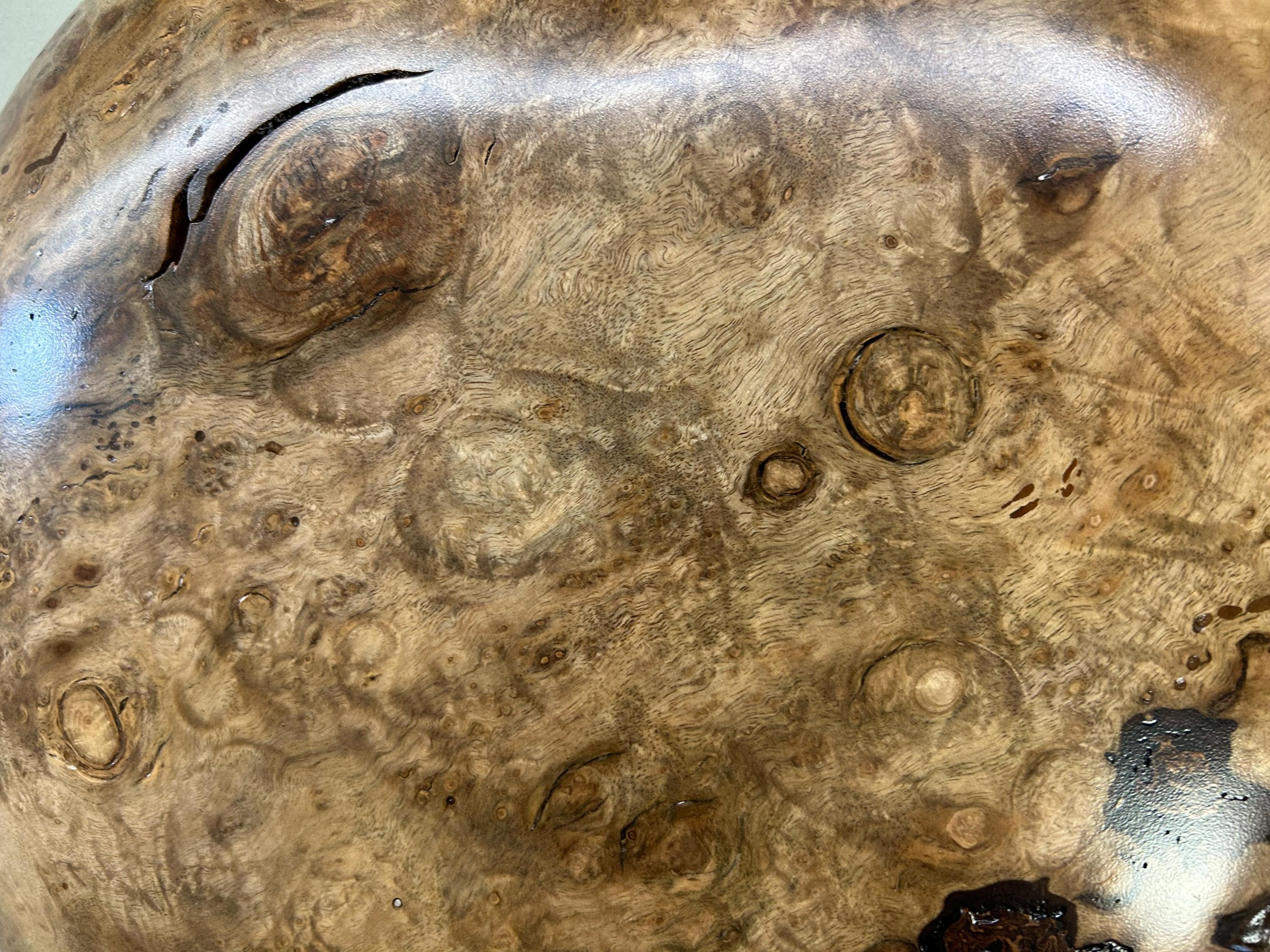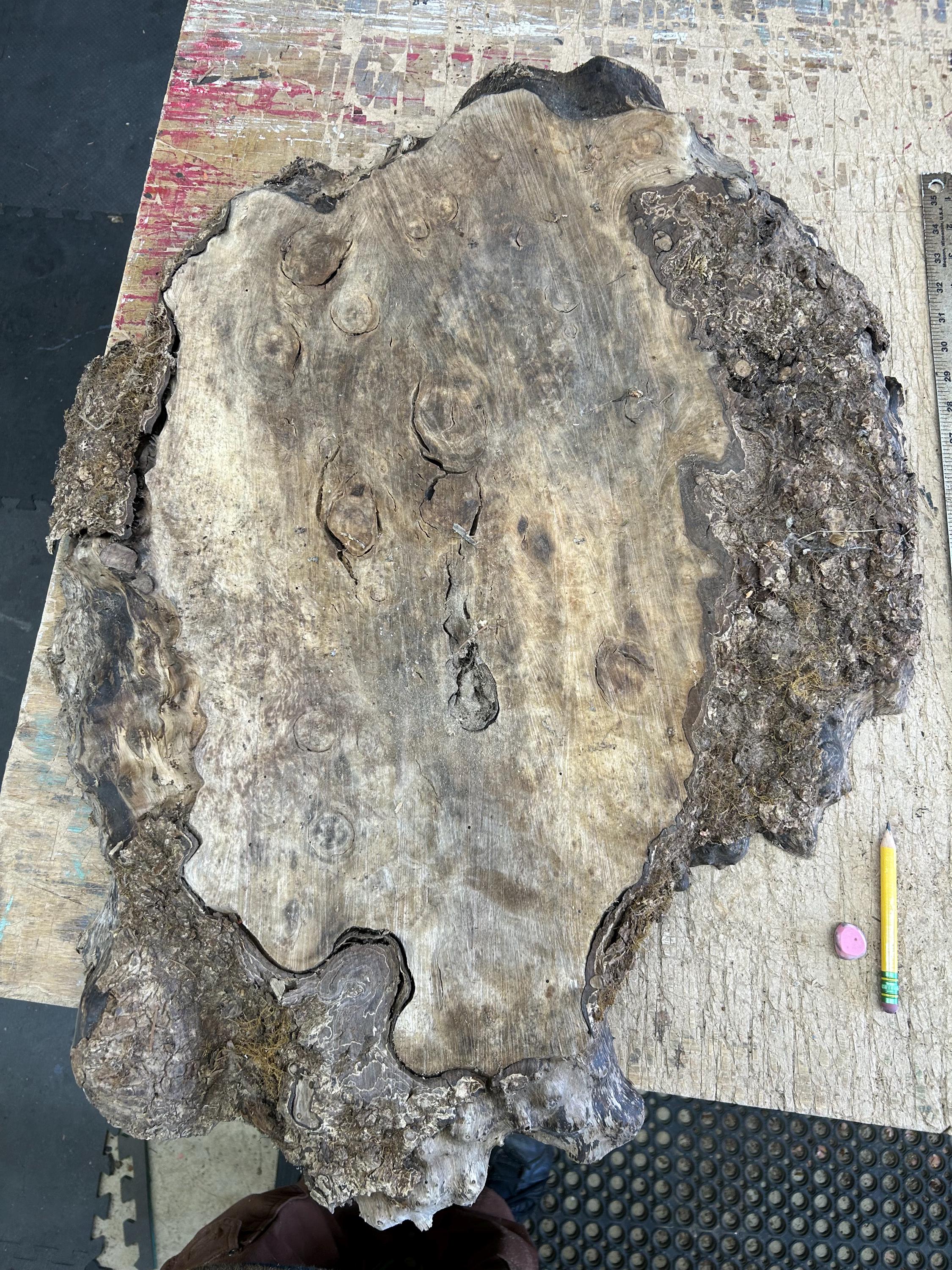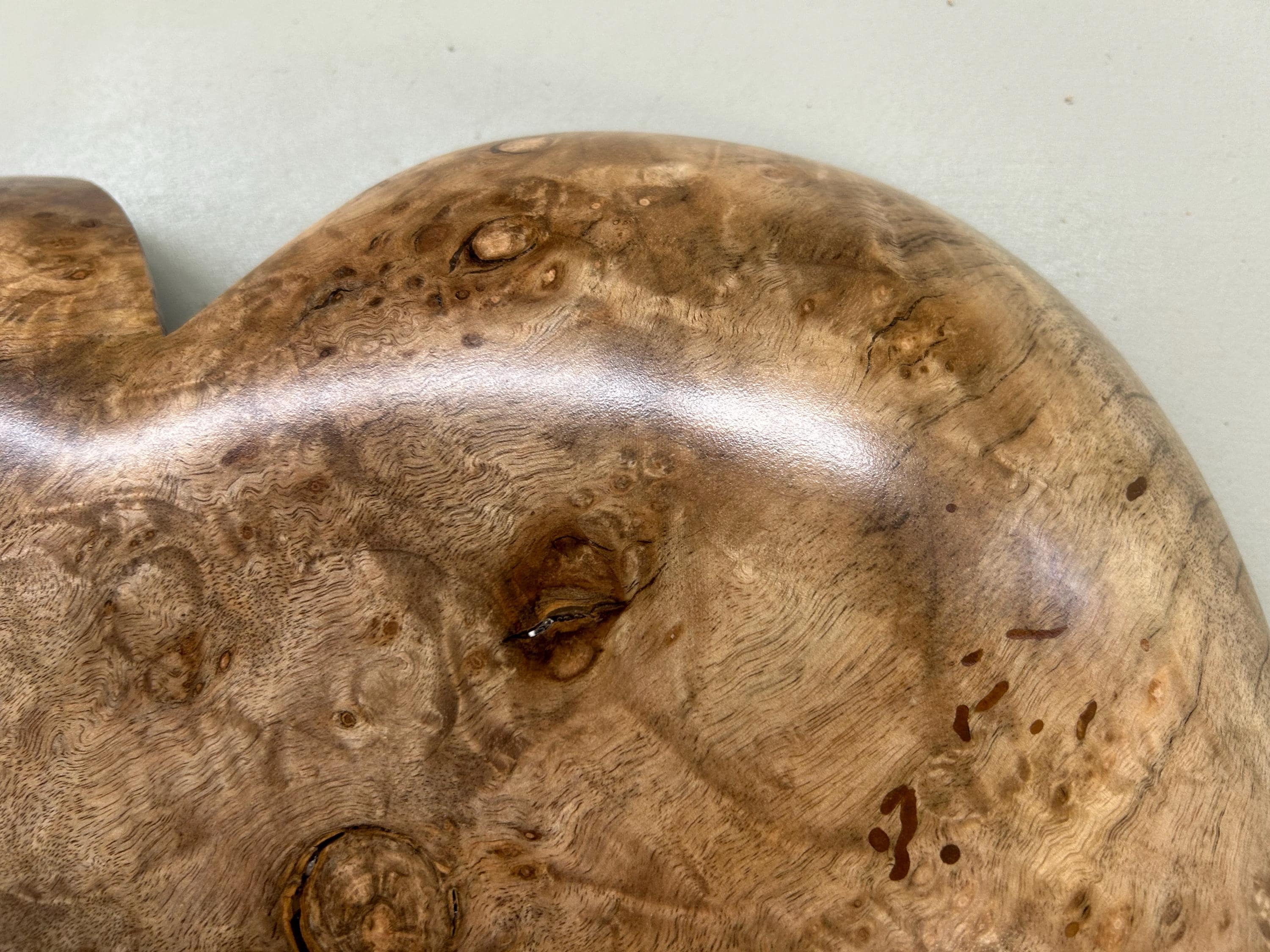 It's carved out of a Myrtlewood. I have fastened a self leveling hanger for hanging and it is signed Wiz on the back.