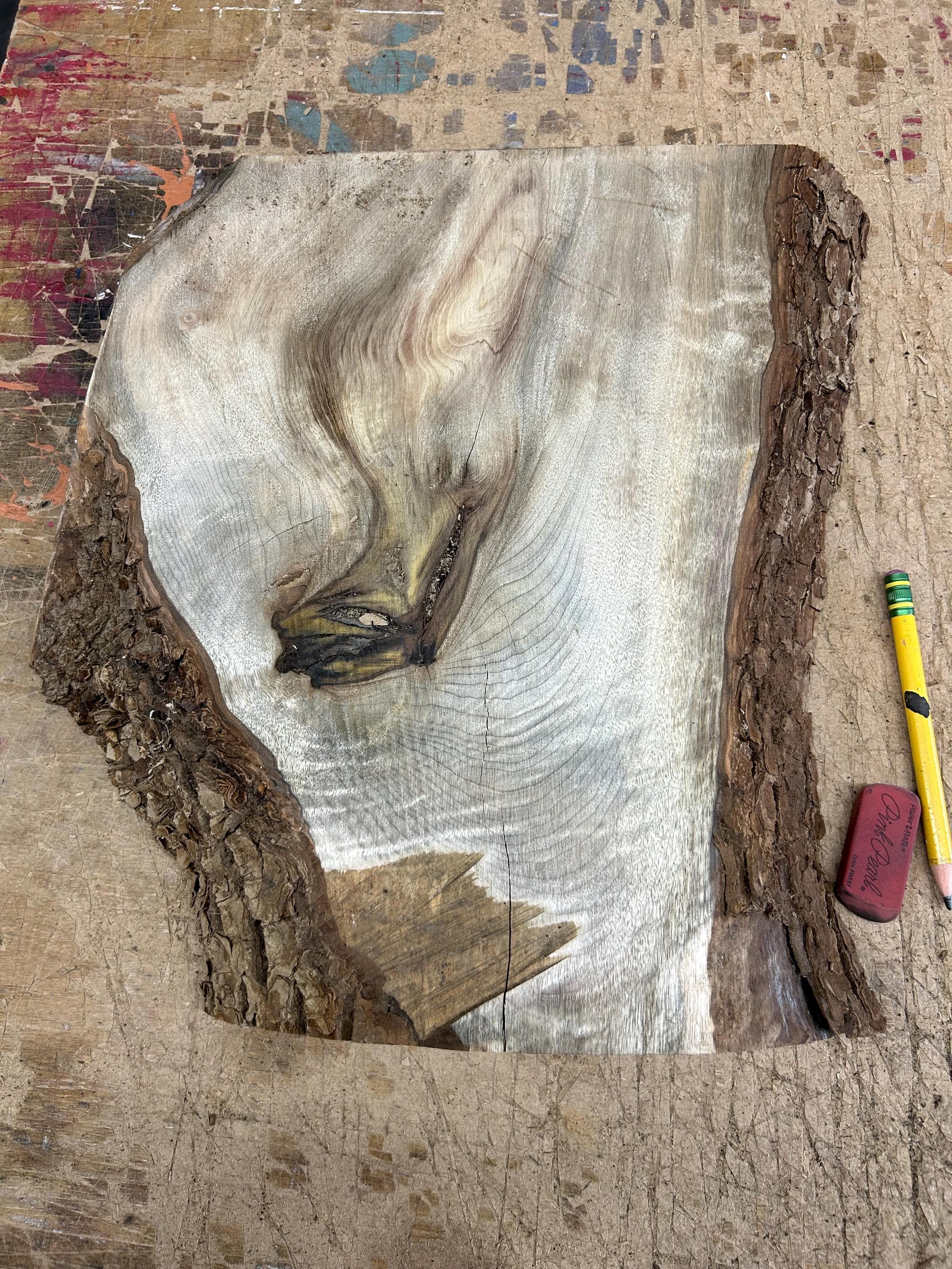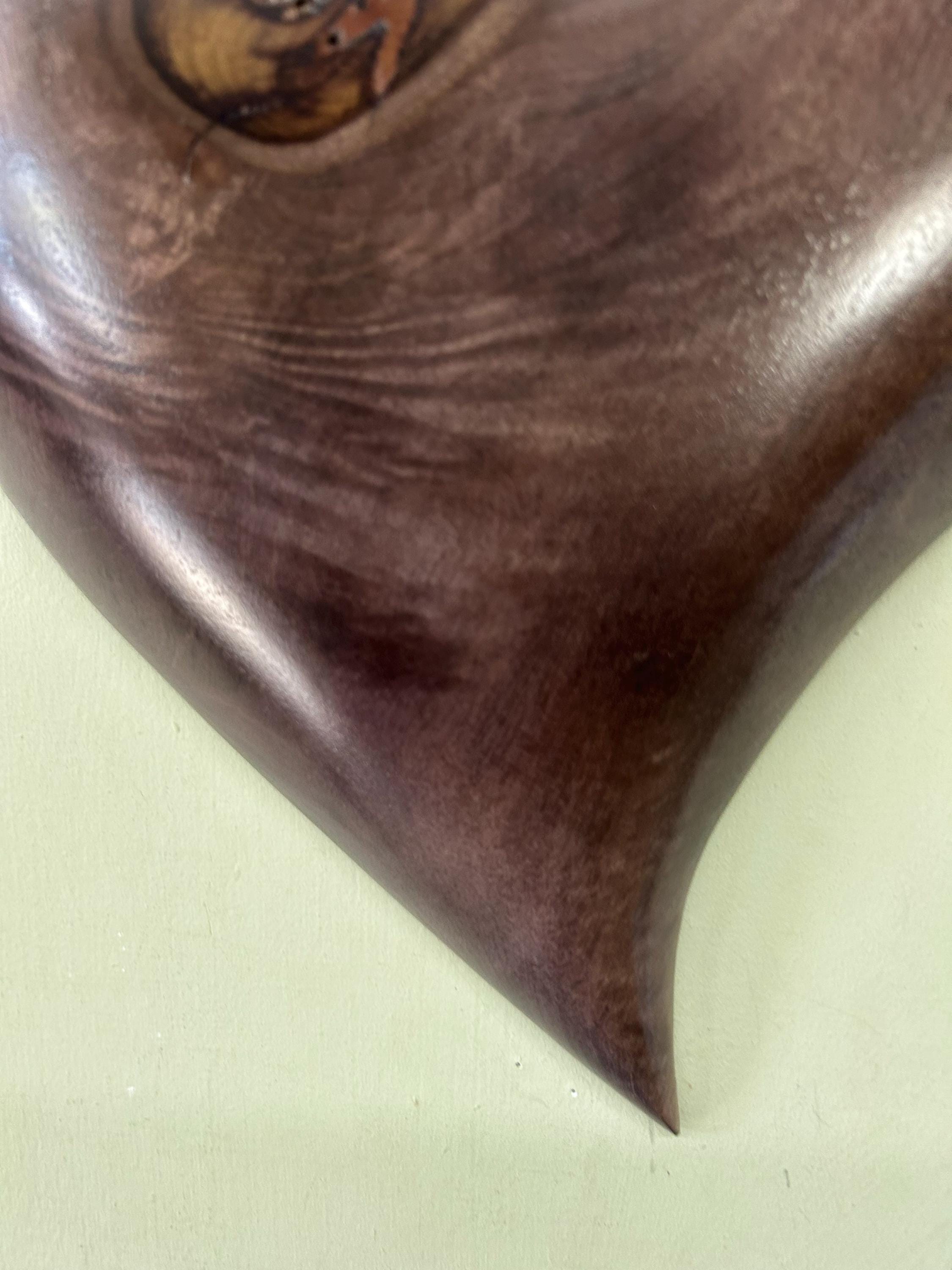 I signed it Wiz on the back. The next to last photo is of me carving in my shop and the last photo is of my shop, The Tree Wizard Gallery in Port Orford, Oregon. There's also a short video of it. It measures 15 1/2" tall x 14" wide x 2" thick.