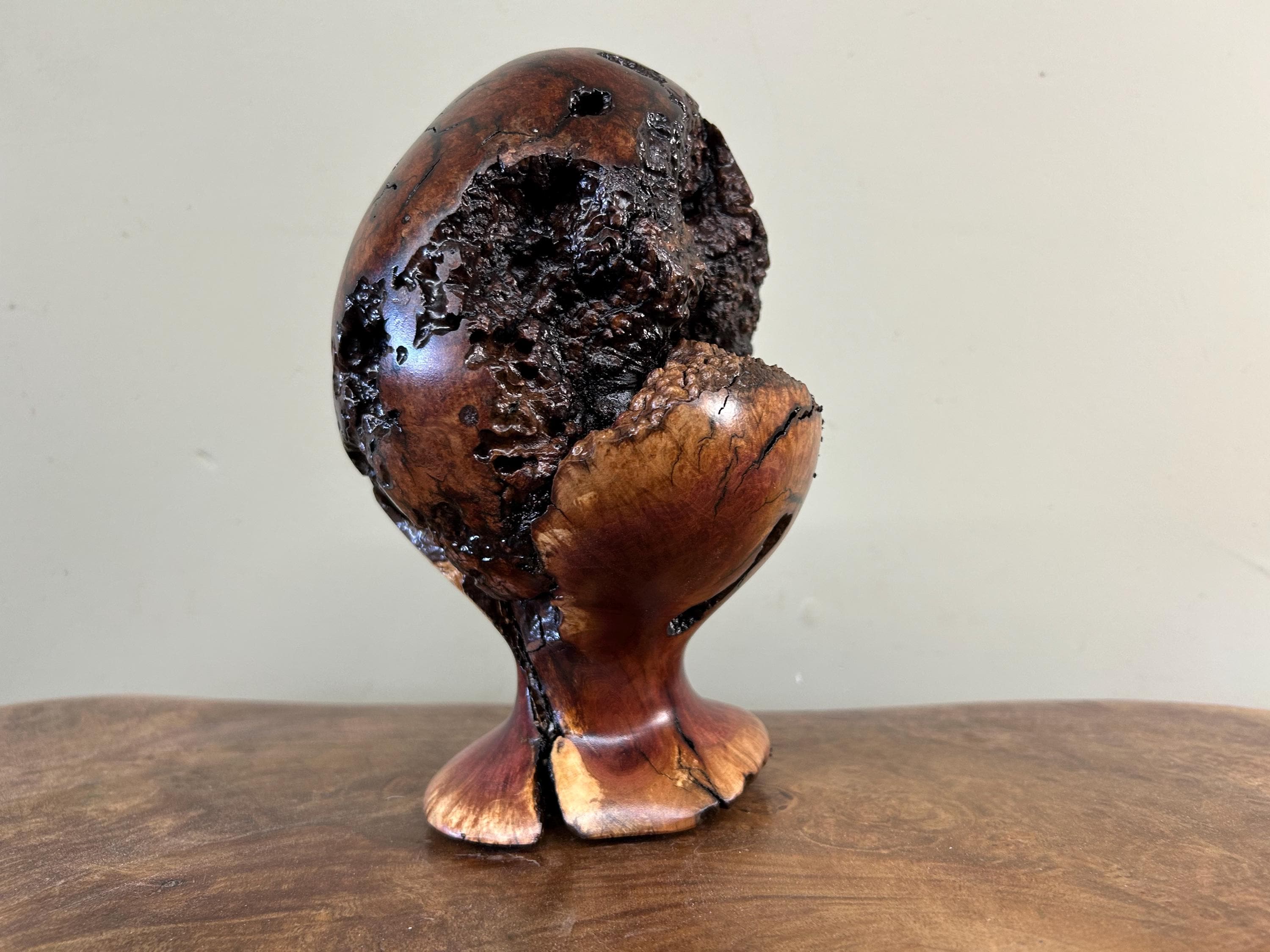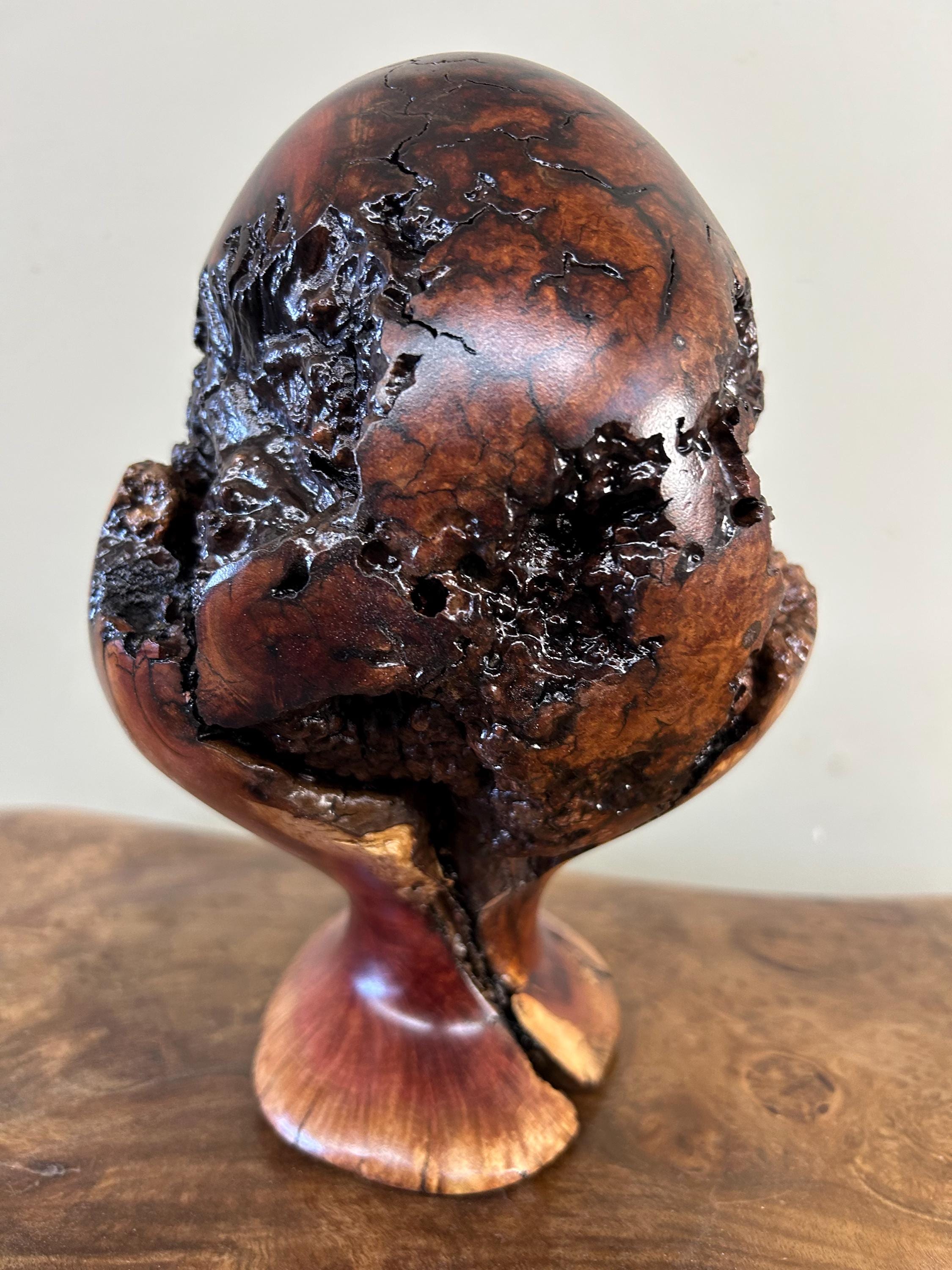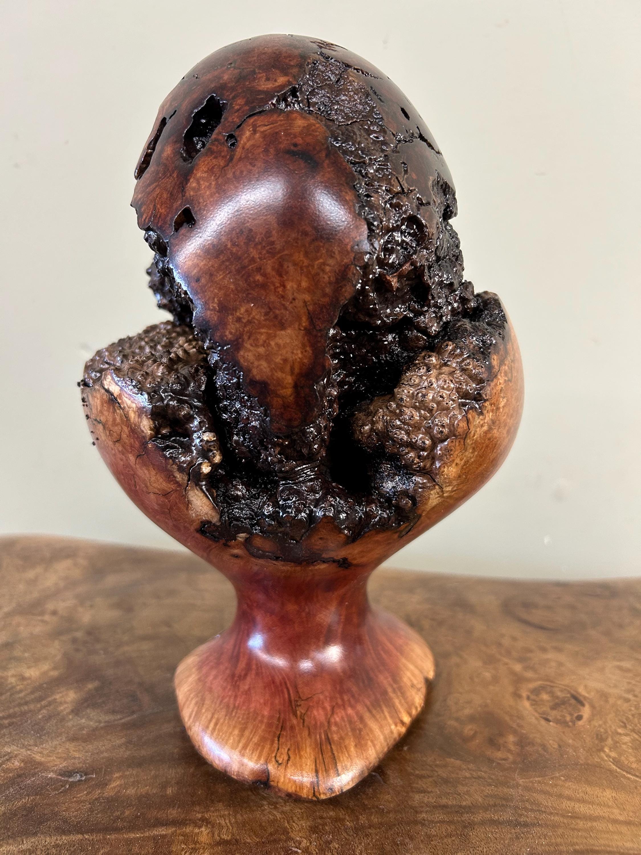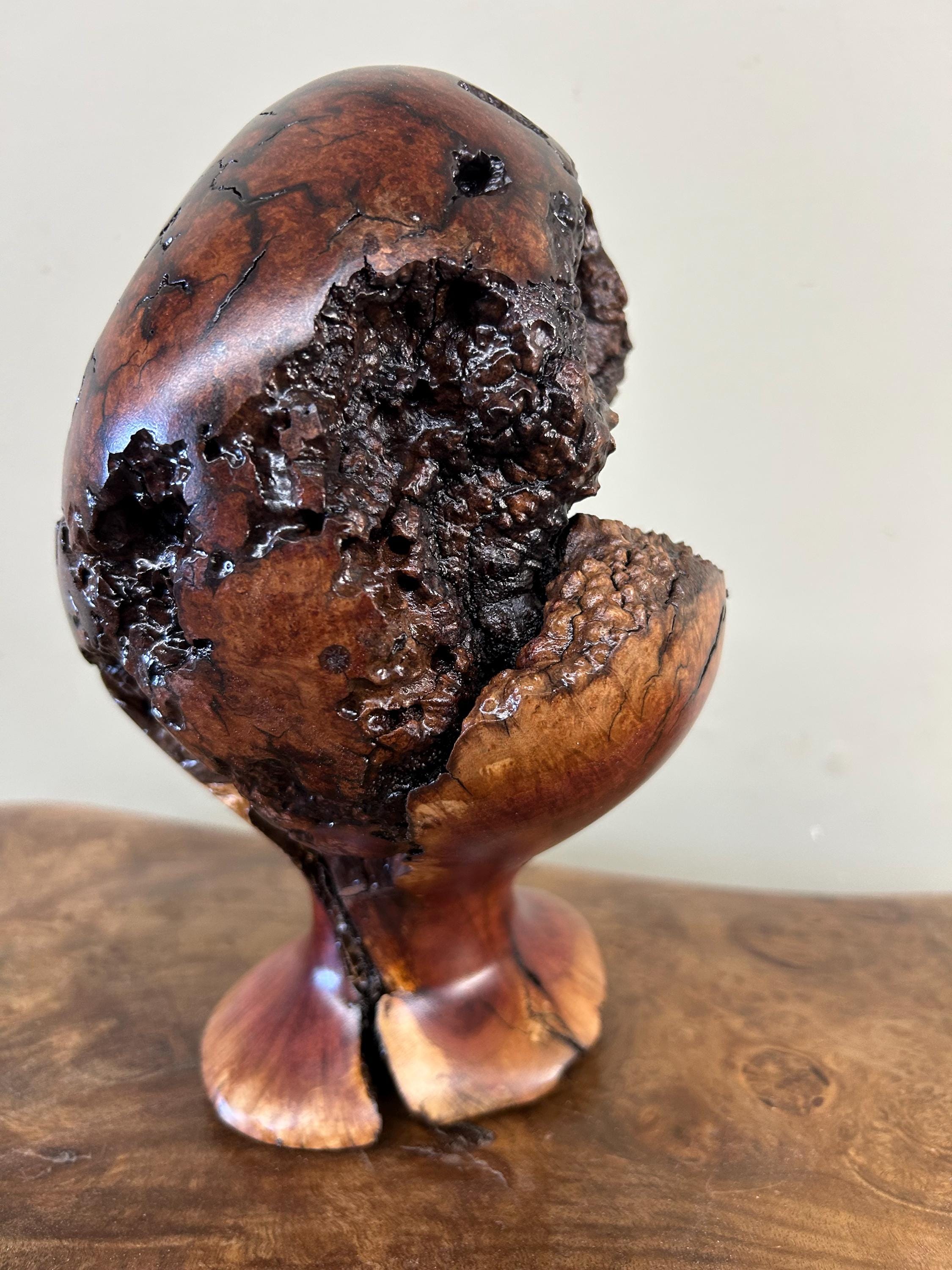 This is a piece of Manzanita burl. These burls are not so easy to find. This piece can be turned in multiple ways to make it seem like a completely different sculpture. There are 8 photos of it from different angles. The next to last photo is of me carving in my shop and the last one is of my shop/gallery, the Tree Wizard Gallery in Port Orford, Oregon.