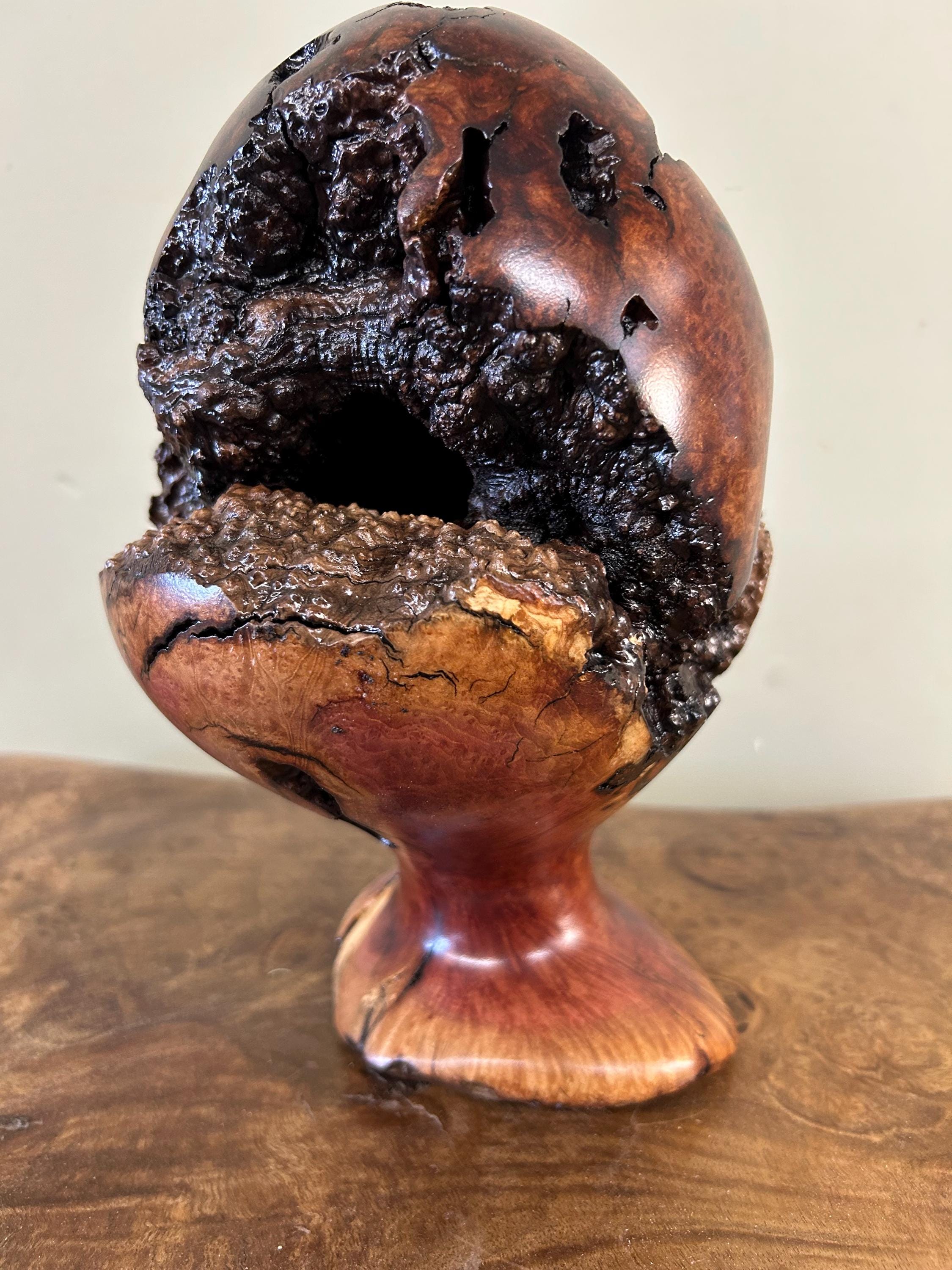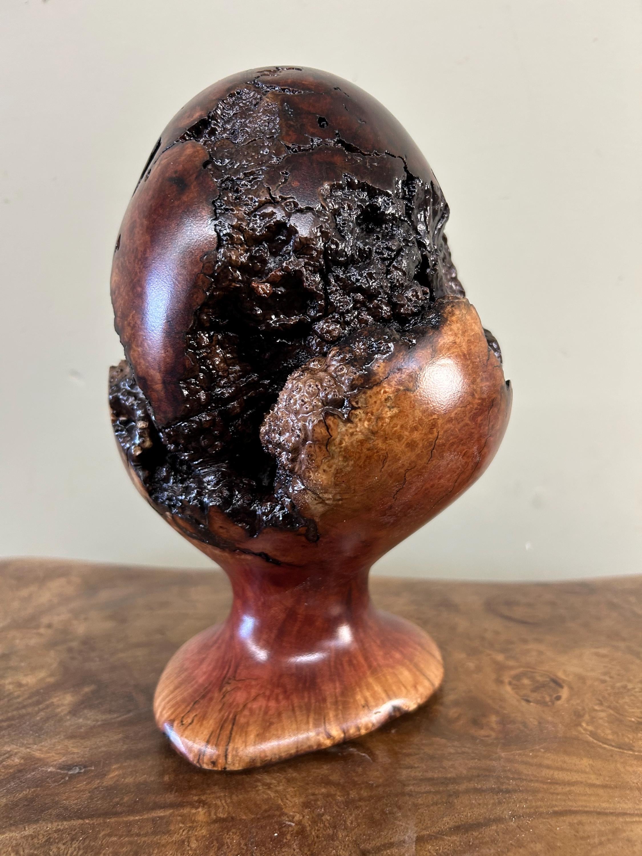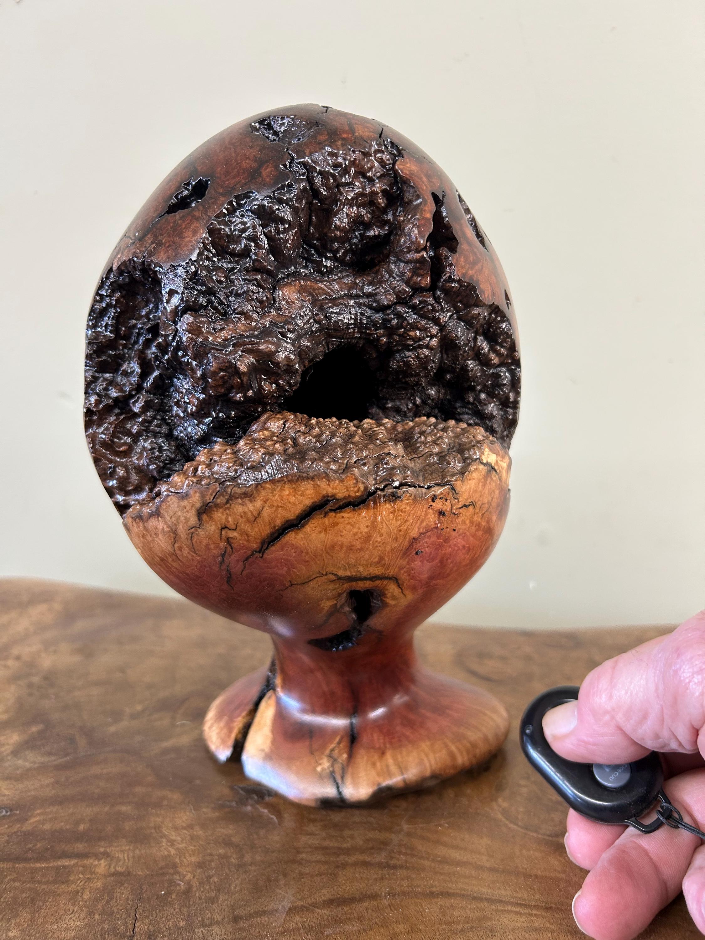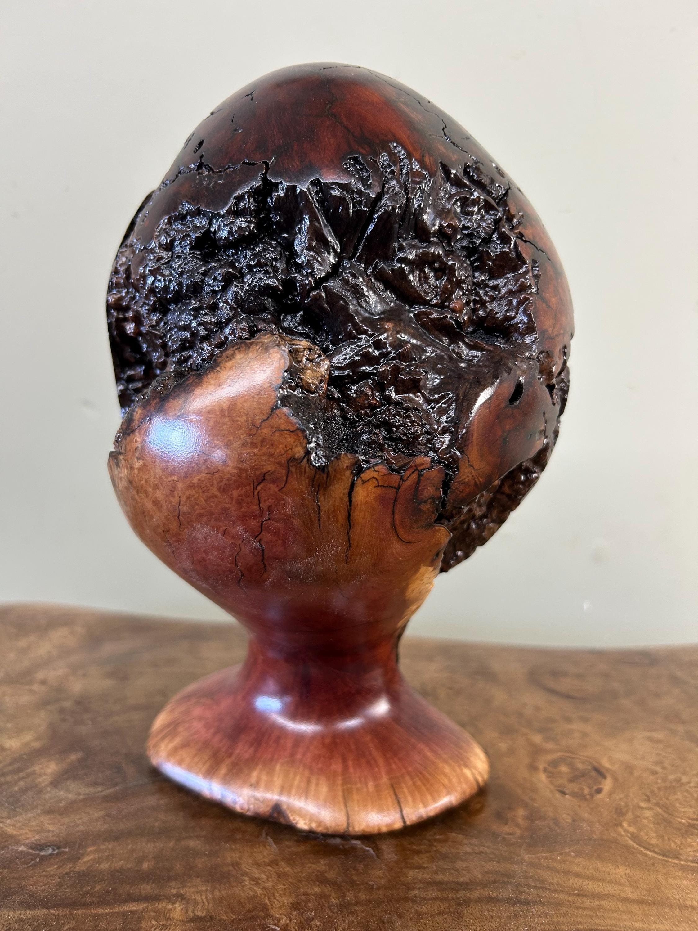 This is a piece of Manzanita burl. These burls are not so easy to find. This piece can be turned in multiple ways to make it seem like a completely different sculpture. There are 8 photos of it from different angles. The next to last photo is of me carving in my shop and the last one is of my shop/gallery, the Tree Wizard Gallery in Port Orford, Oregon.