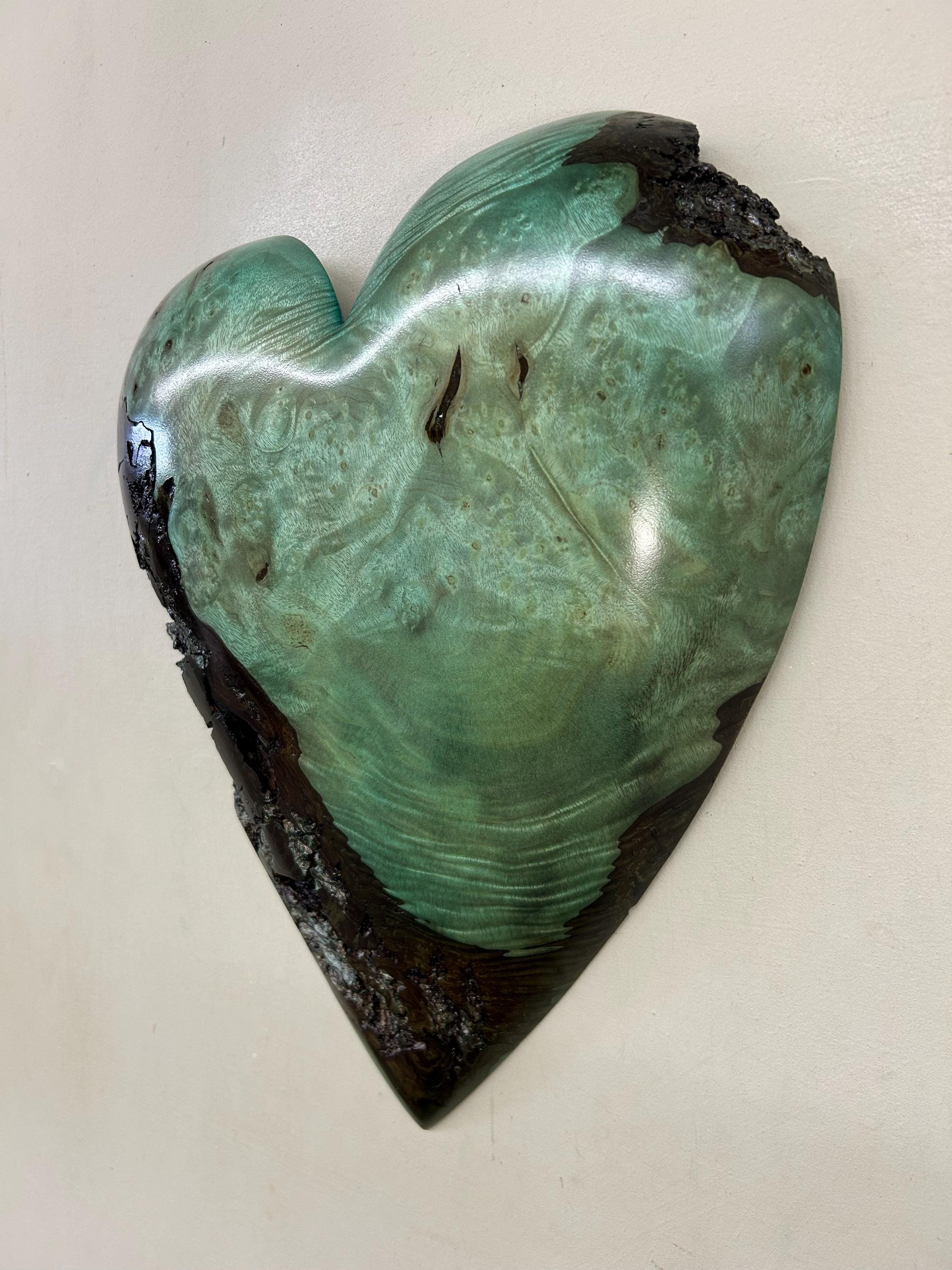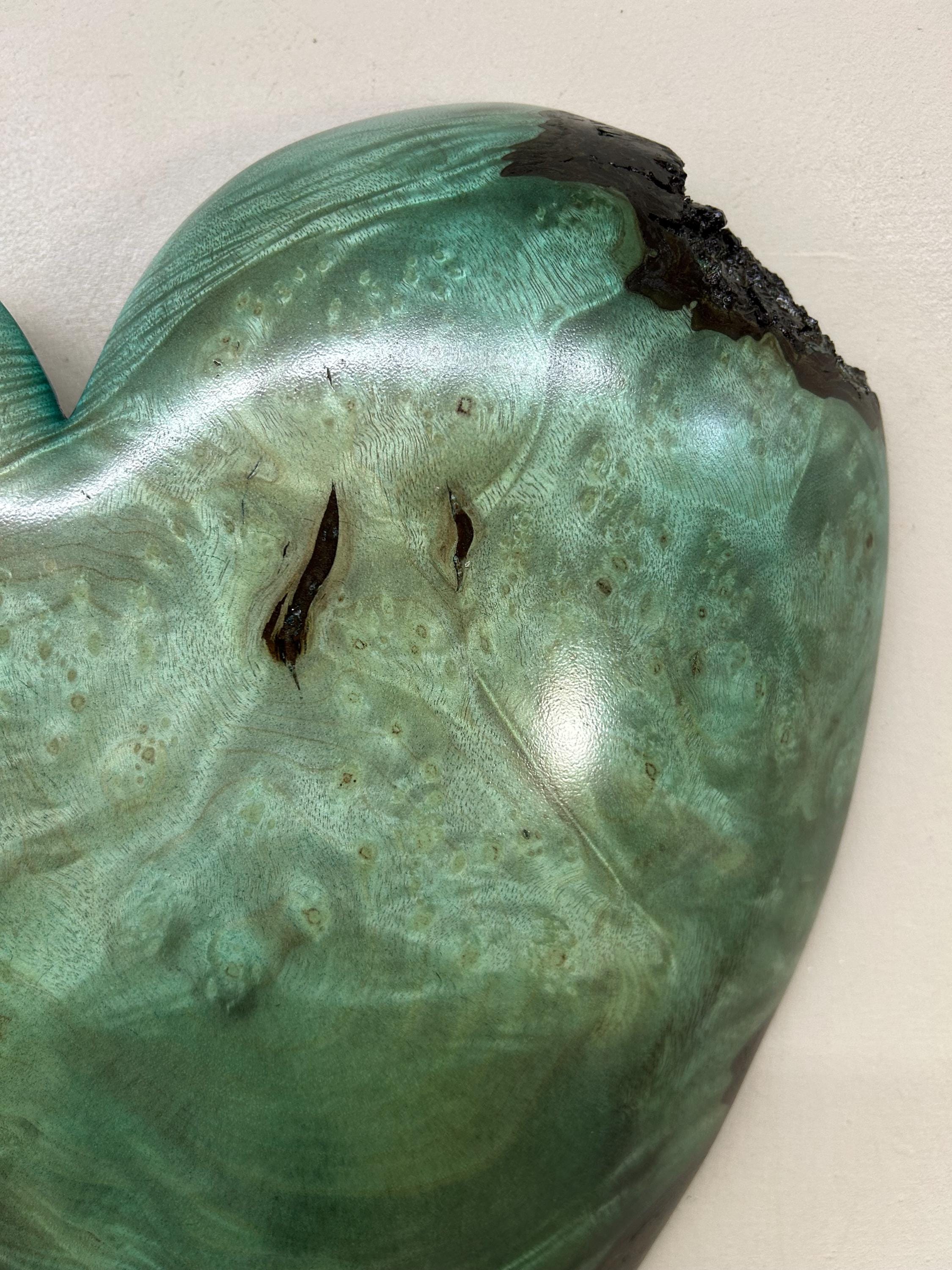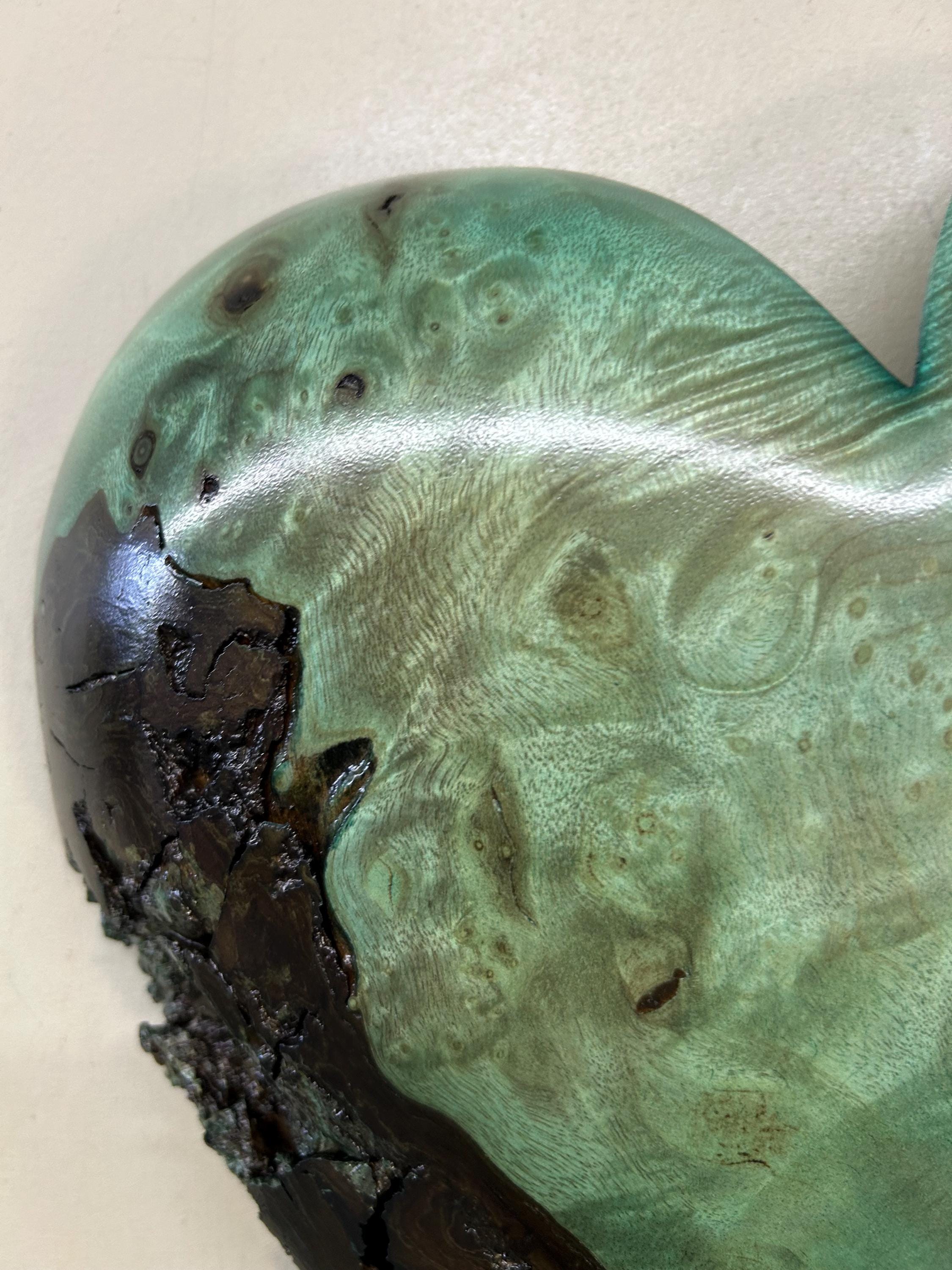 This is a wood Anniversary gift wall present is carved out of Myrtlewood that I dyed green. I love this color combination with the grain pattern. The color is a bit of a green/blue color because of the way that the dye took to the Myrtle wood. It would make a wonderful present for any occasion!!