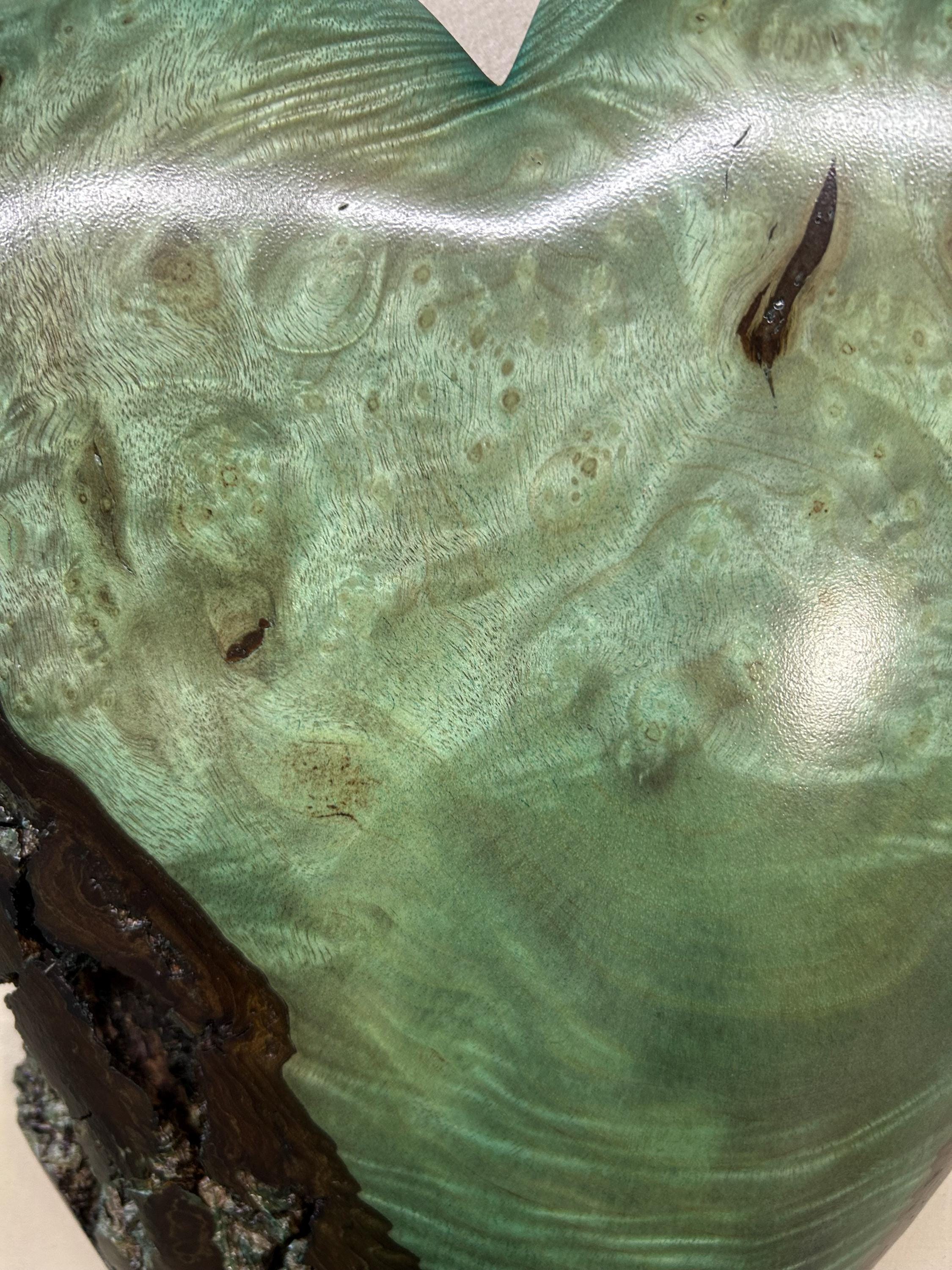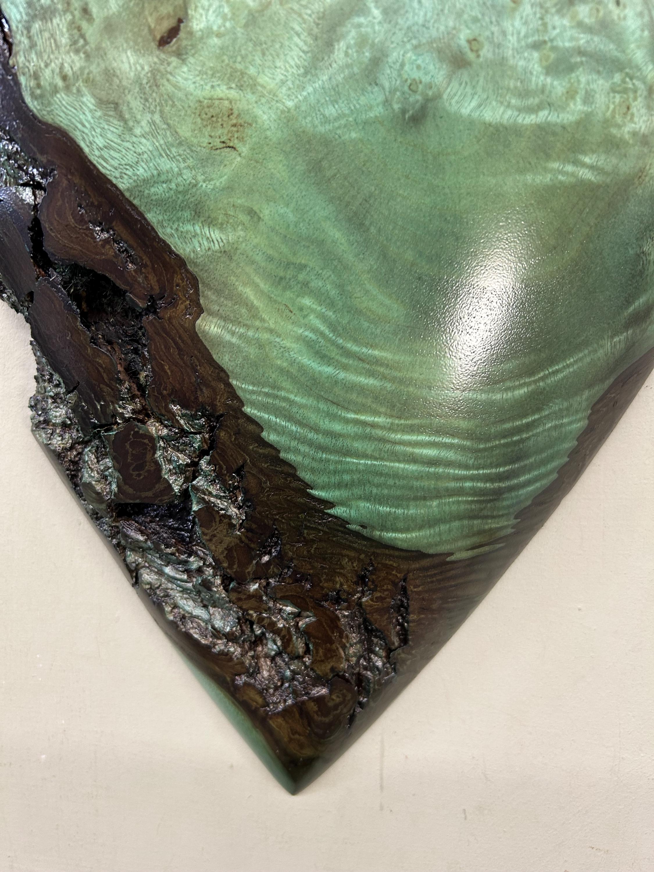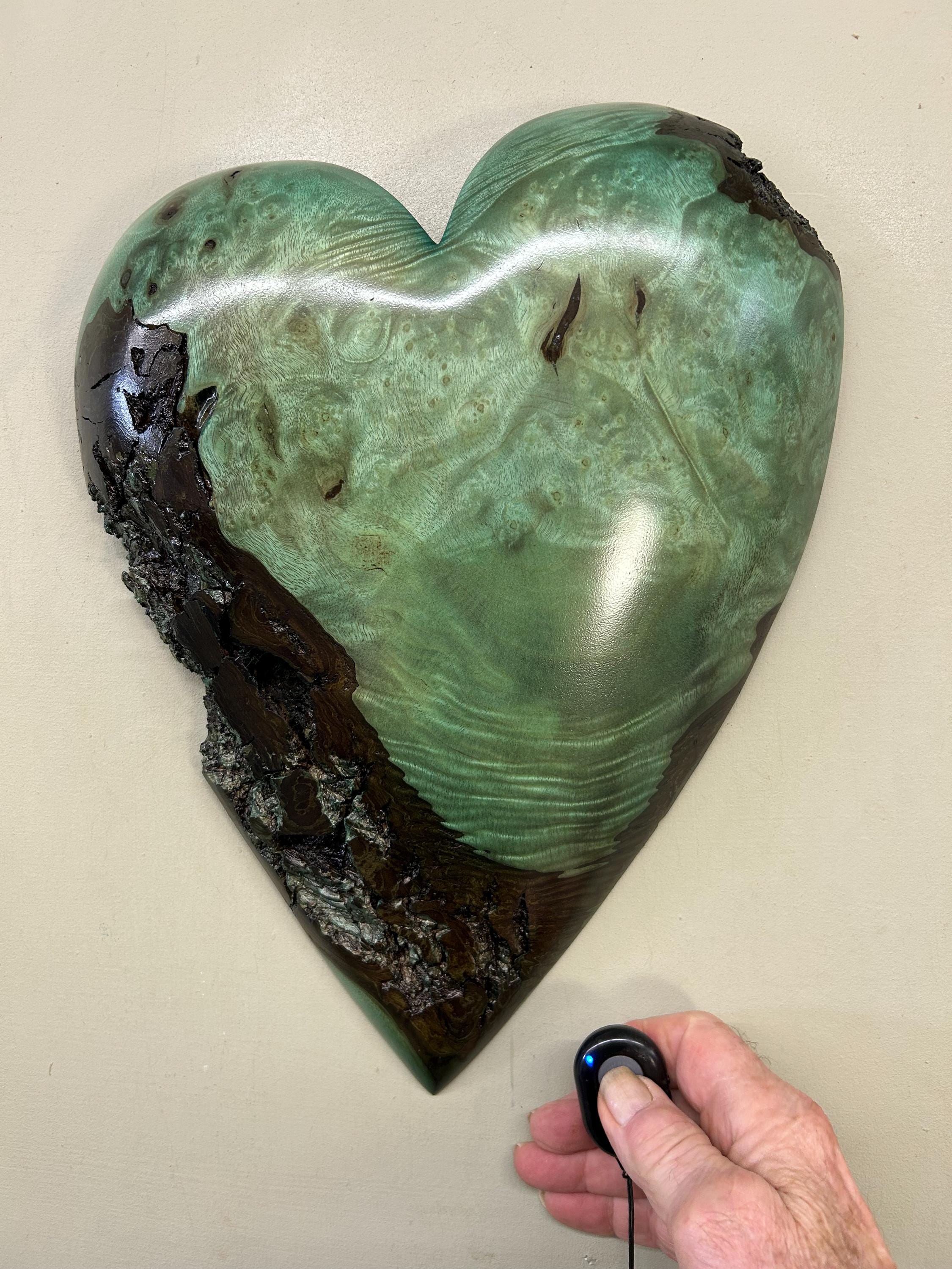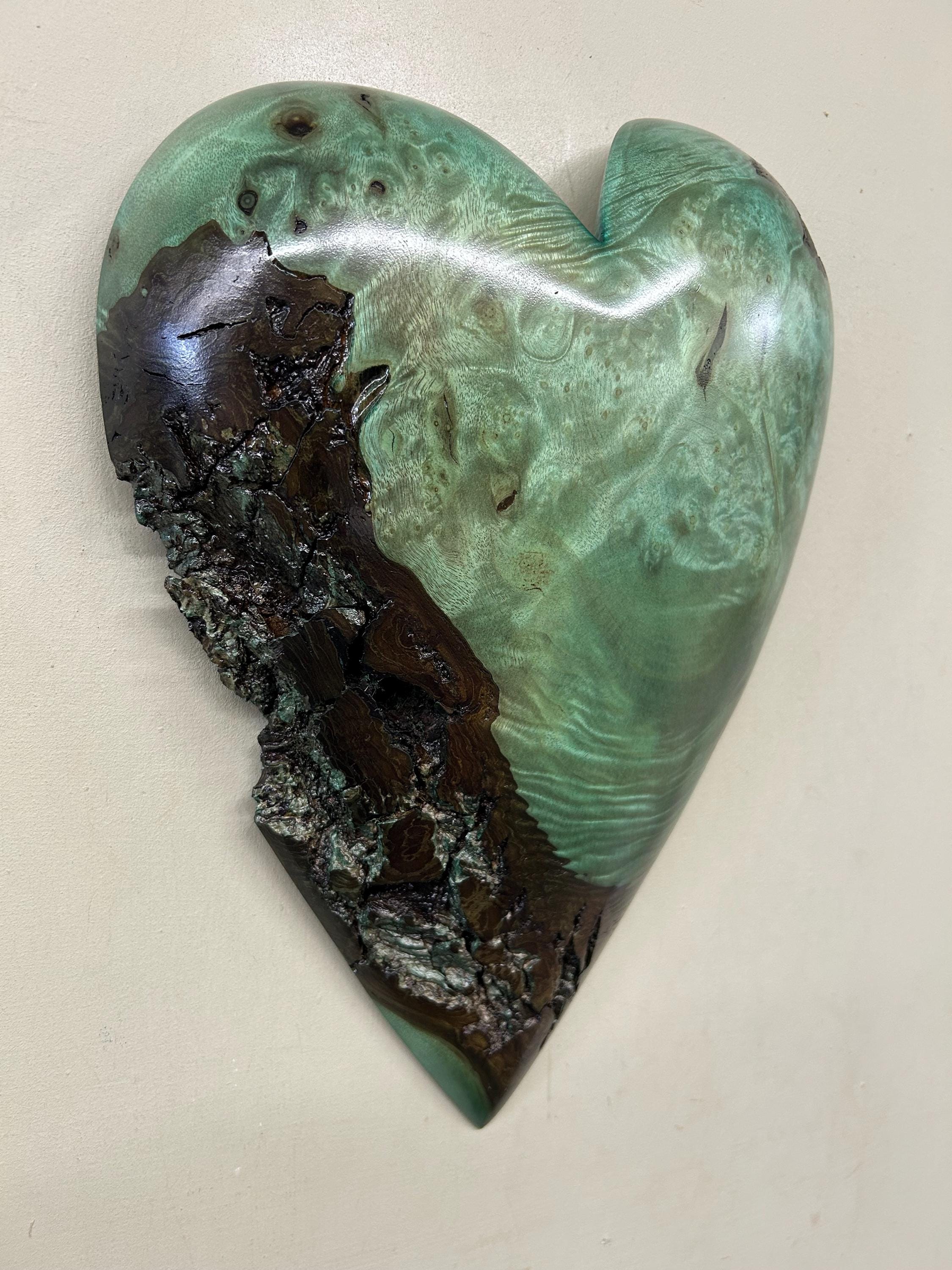 This is a wood Anniversary gift wall present is carved out of Myrtlewood that I dyed green. I love this color combination with the grain pattern. The color is a bit of a green/blue color because of the way that the dye took to the Myrtle wood. It would make a wonderful present for any occasion!!