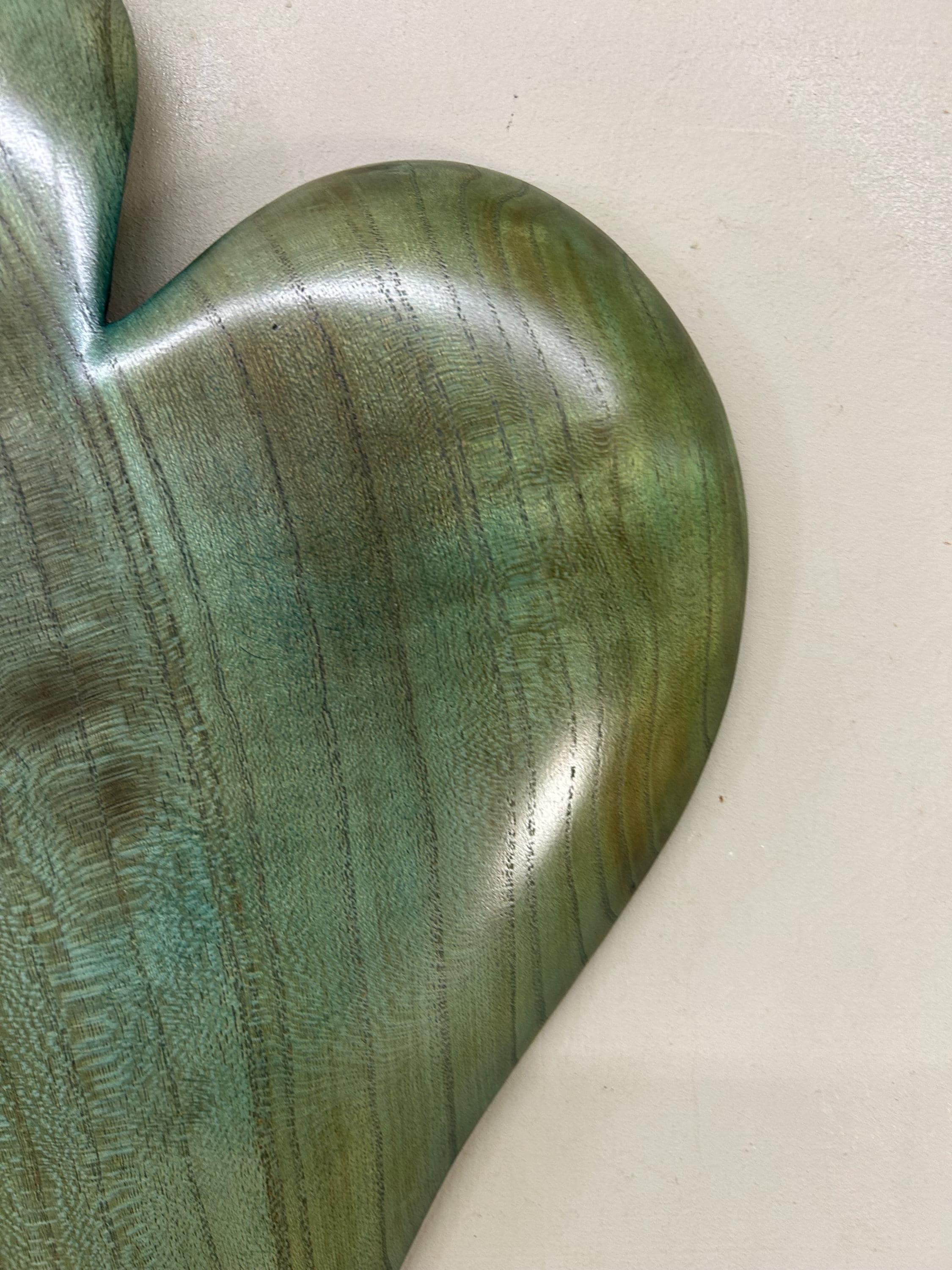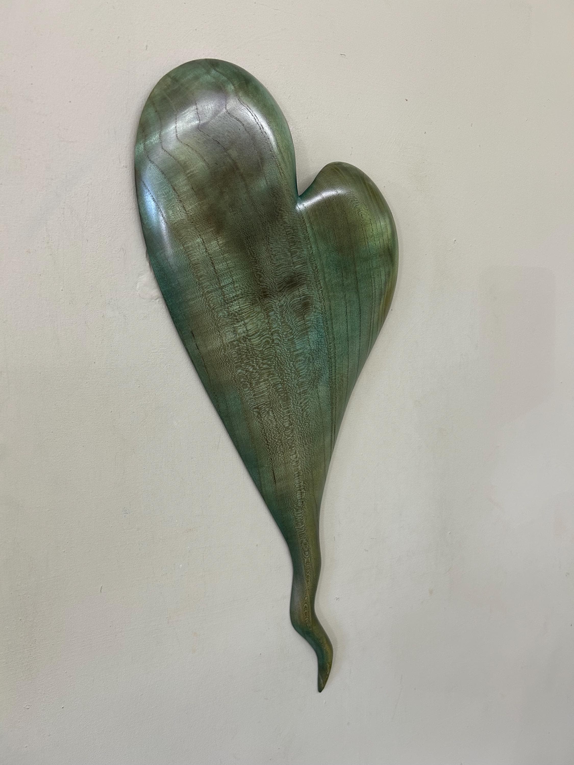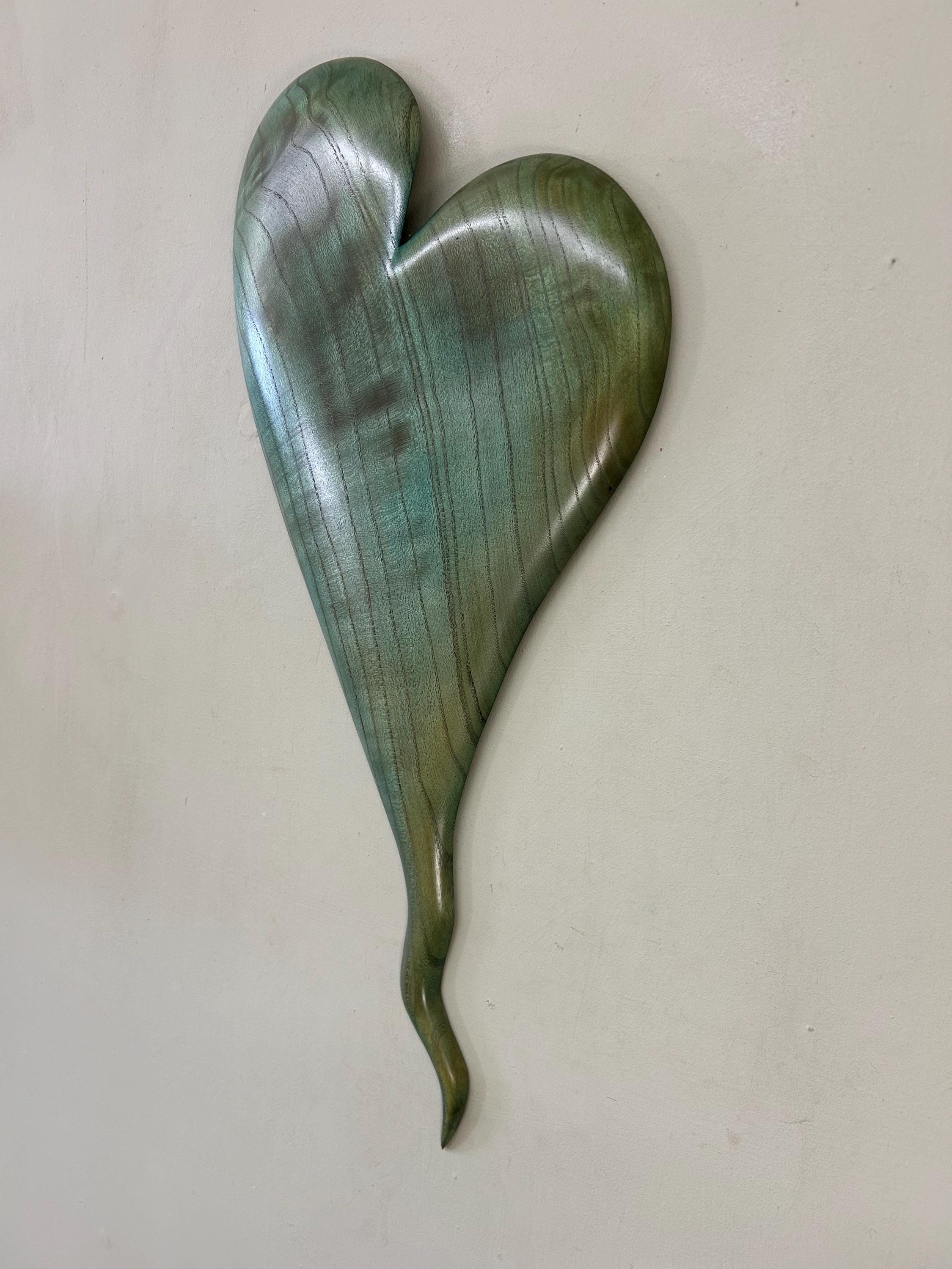 This green heart would make a wonderful 5th wood Wedding Anniversary gift present. It's carved out of Myrtlewood that I dyed a green/blue. It's a very whimsical heart design. It would make a wonderful present for any occasion!! It comes ready to hang on the wall. There are 8 photos of this heart. The next to last photo is of me carving in my shop and the last photo is of my gallery, The Tree Wizard Gallery at 2200 Jackson street in Port Orford, Oregon. It measures 21 1/2" tall x 9 1/2" wide x 1" thick. I have attached a metal self leveling hanger on the back and I signed Wiz on the back as well.