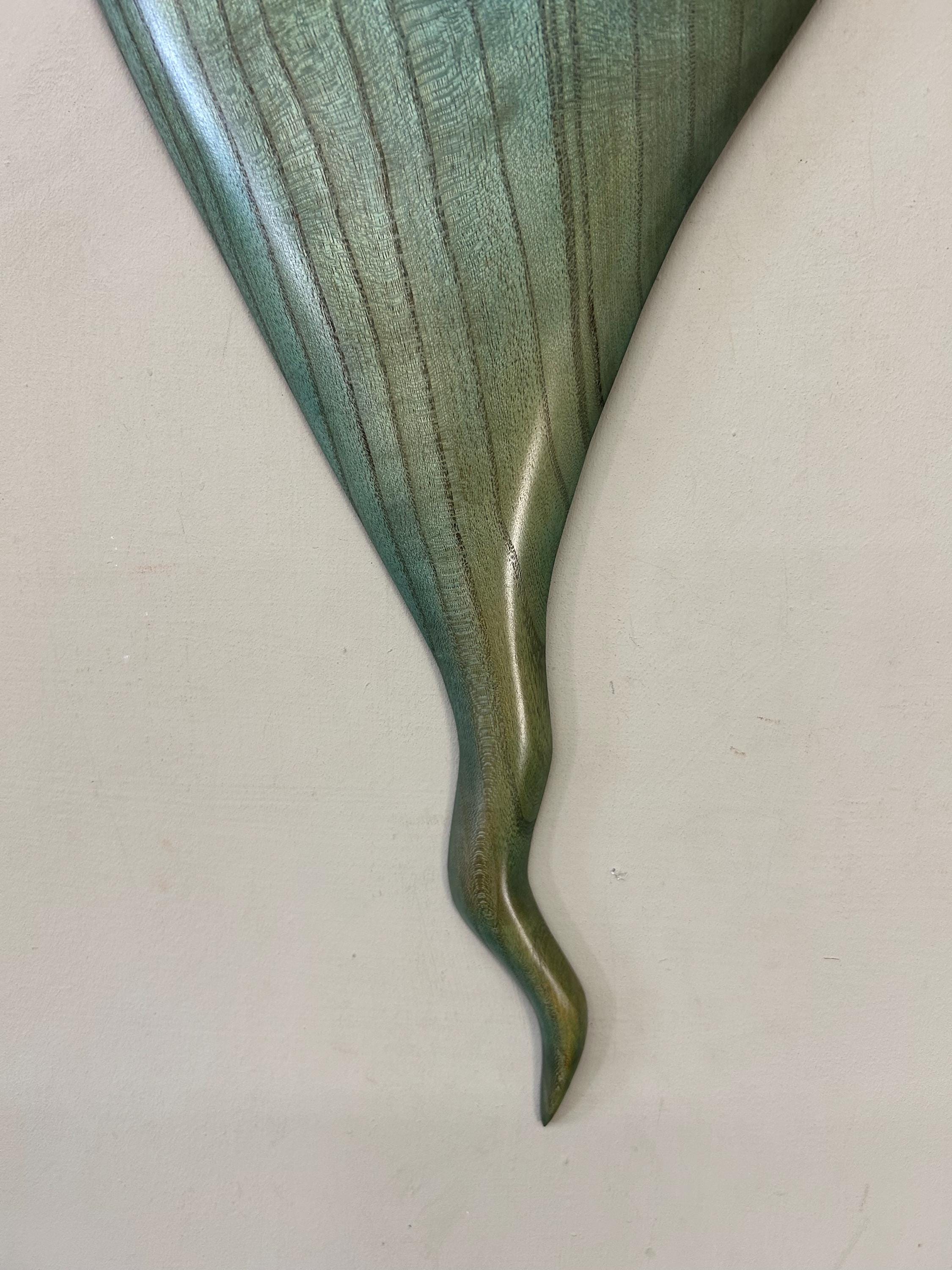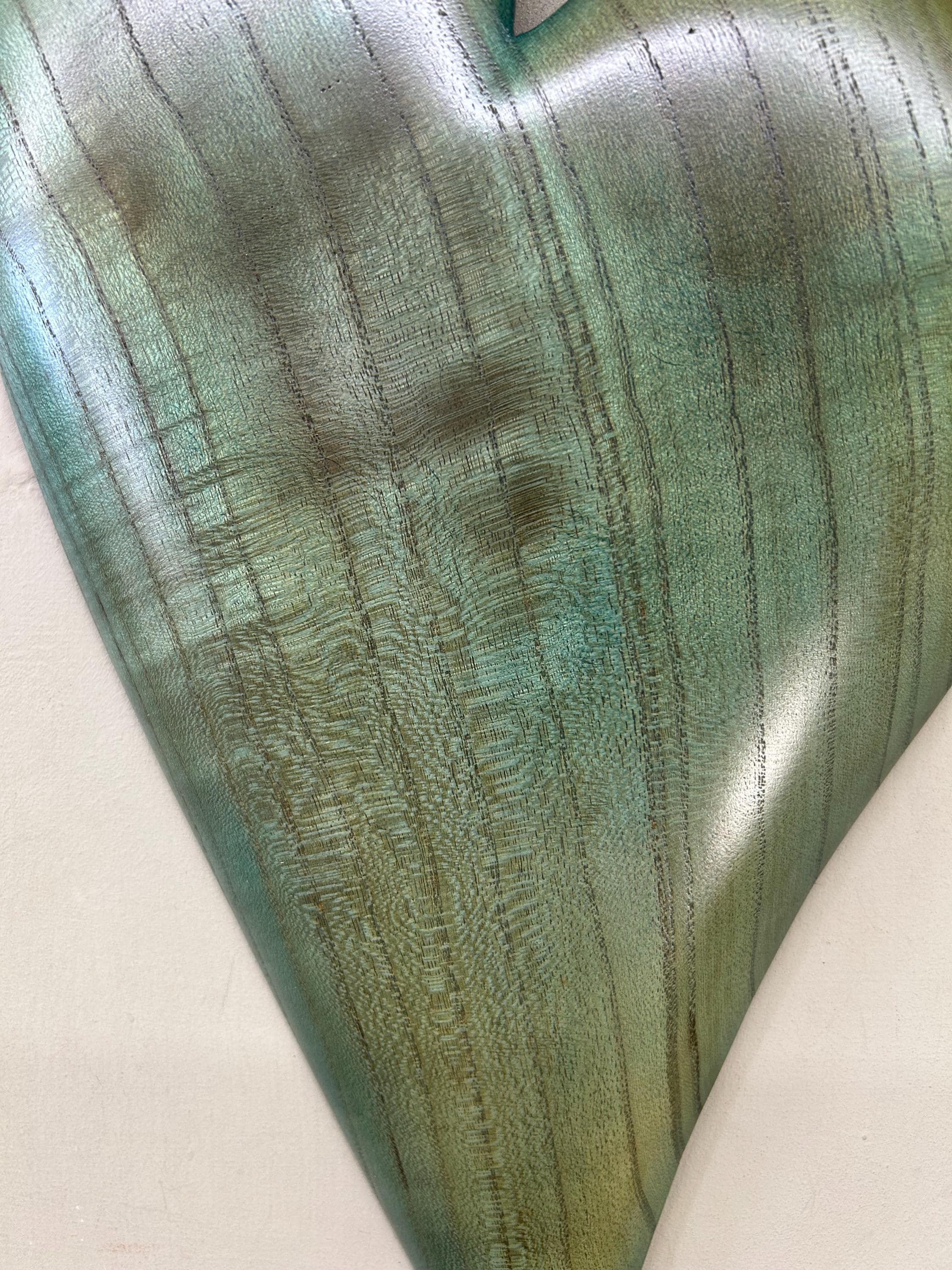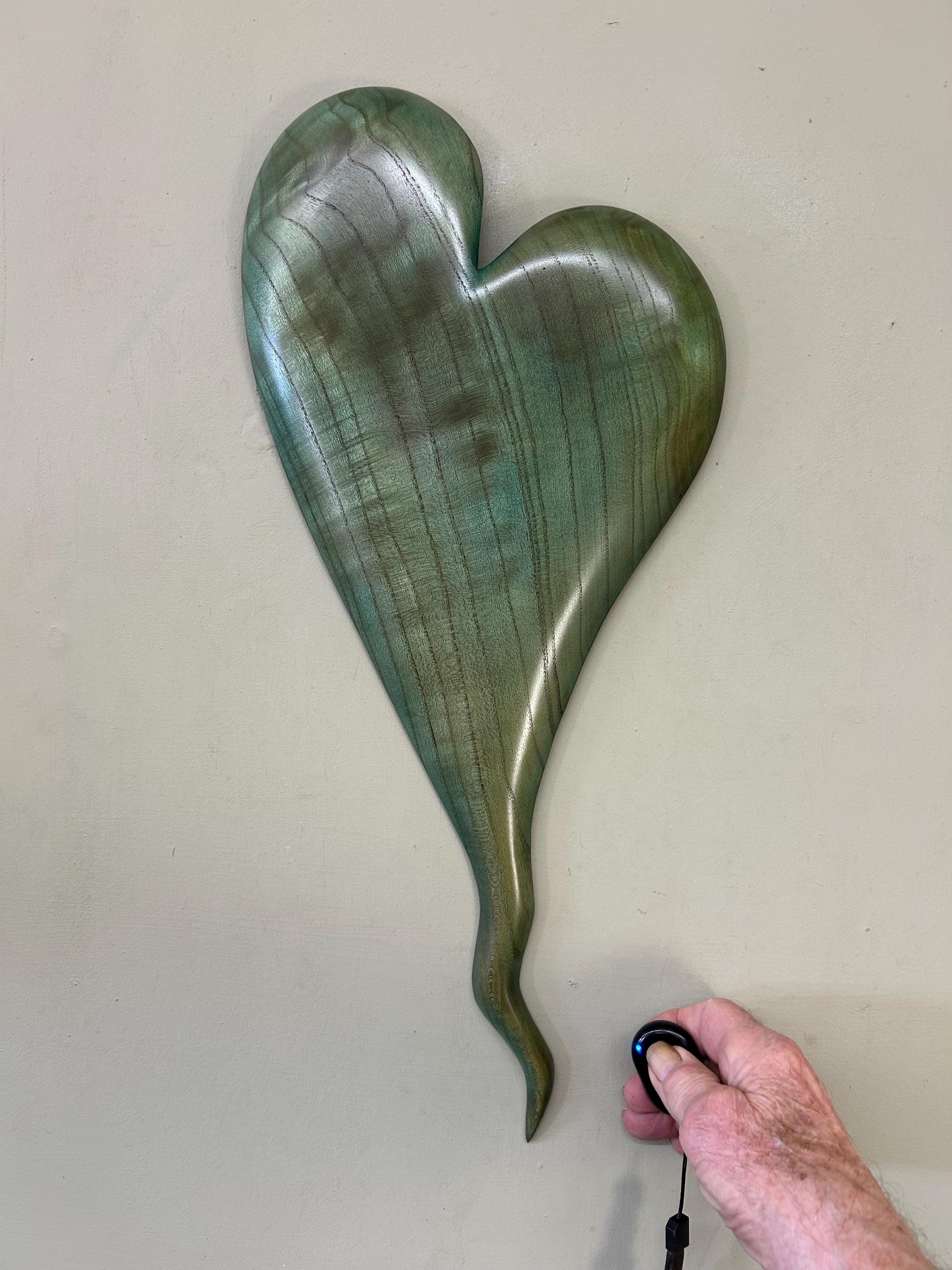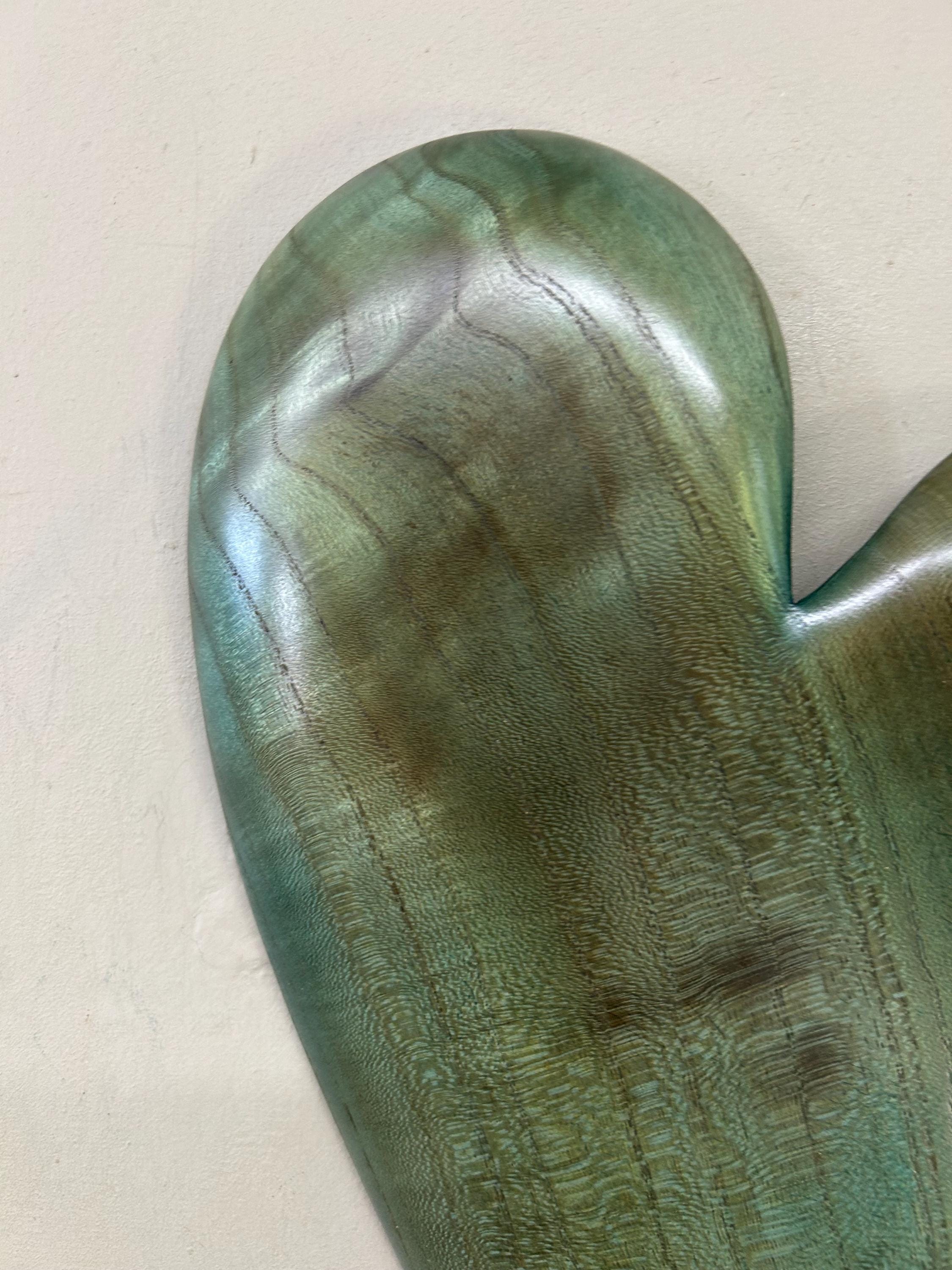 This green heart would make a wonderful 5th wood Wedding Anniversary gift present. It's carved out of Myrtlewood that I dyed a green/blue. It's a very whimsical heart design. It would make a wonderful present for any occasion!! It comes ready to hang on the wall. There are 8 photos of this heart. The next to last photo is of me carving in my shop and the last photo is of my gallery, The Tree Wizard Gallery at 2200 Jackson street in Port Orford, Oregon. It measures 21 1/2" tall x 9 1/2" wide x 1" thick. I have attached a metal self leveling hanger on the back and I signed Wiz on the back as well.