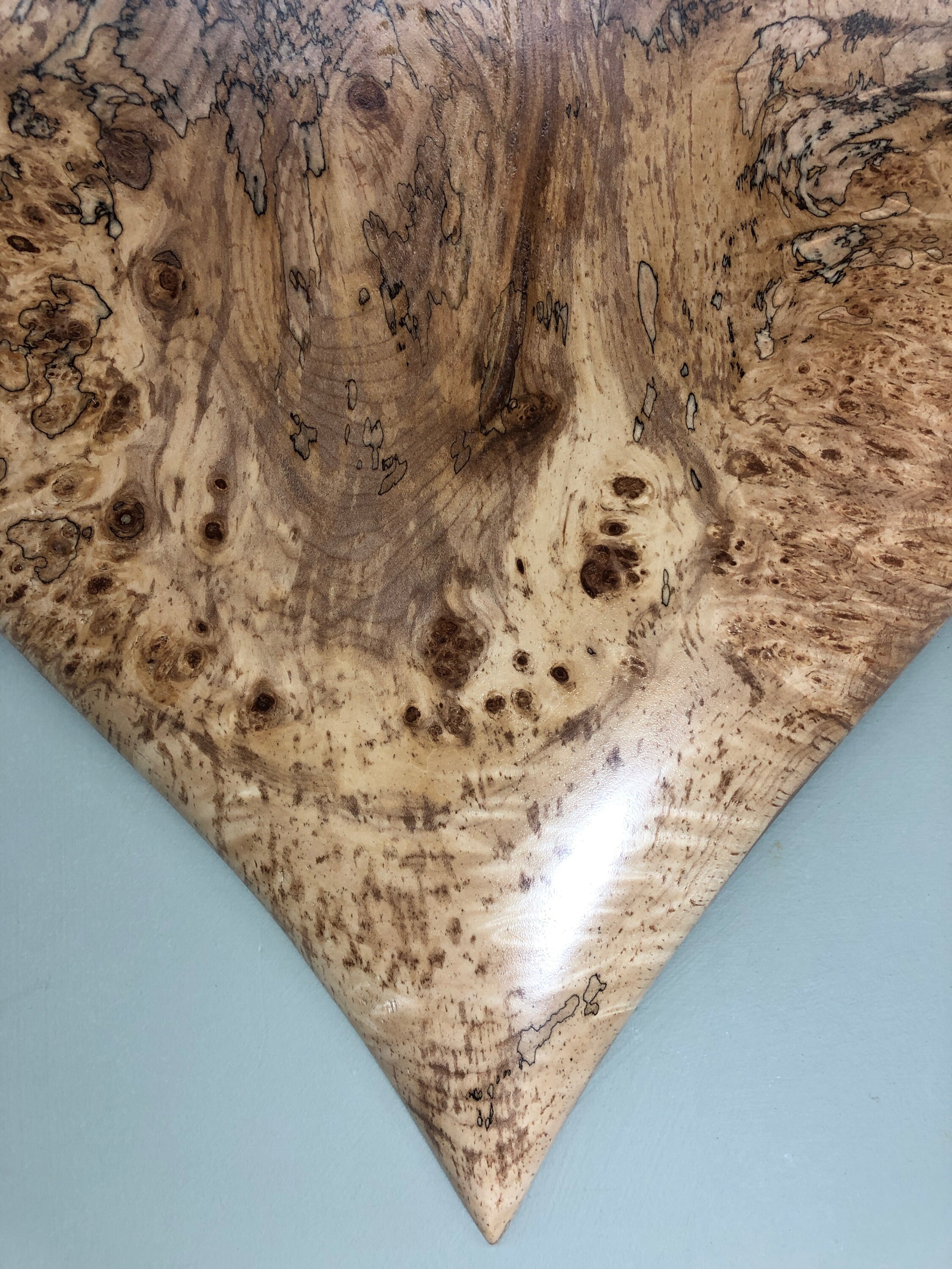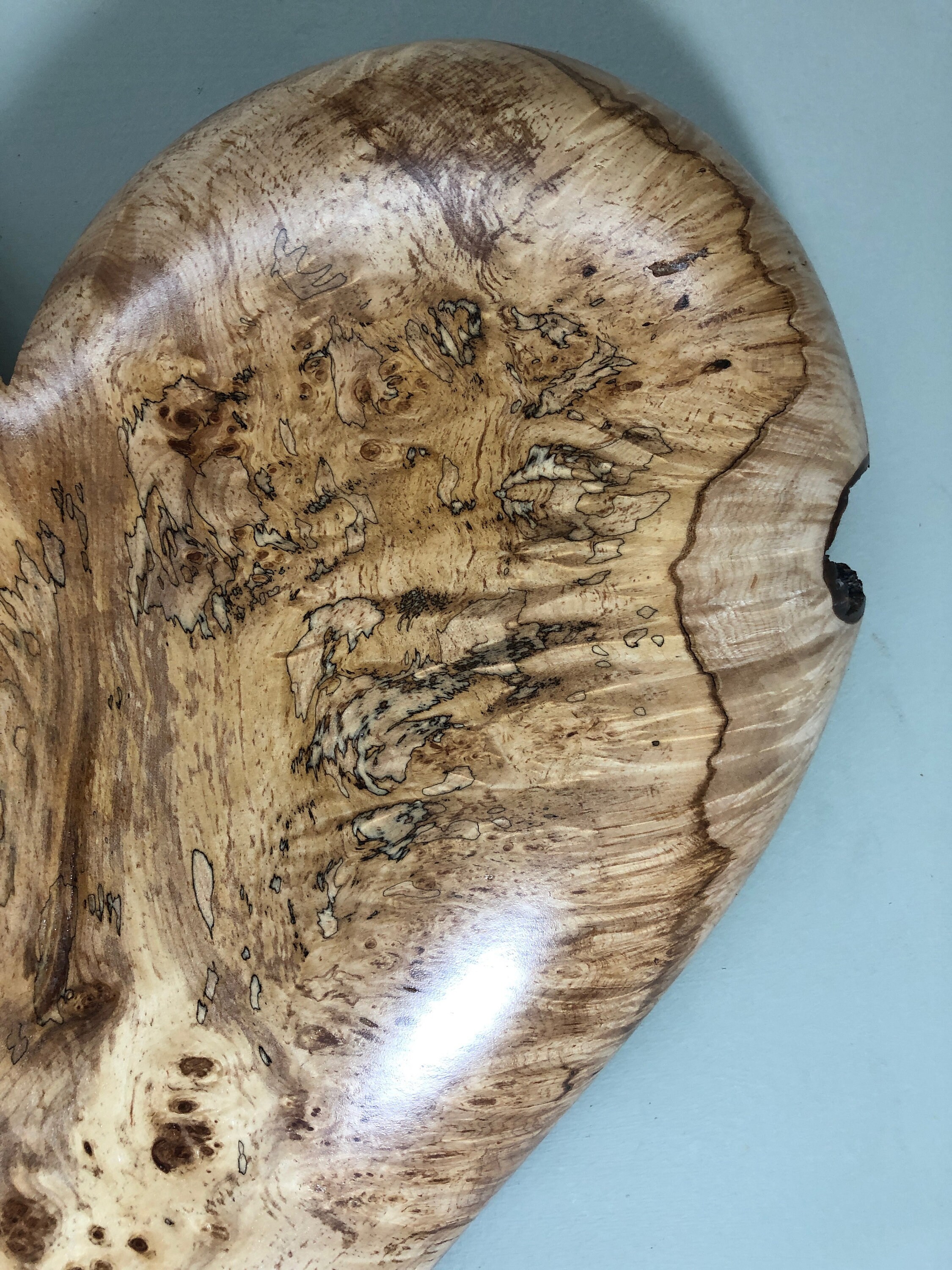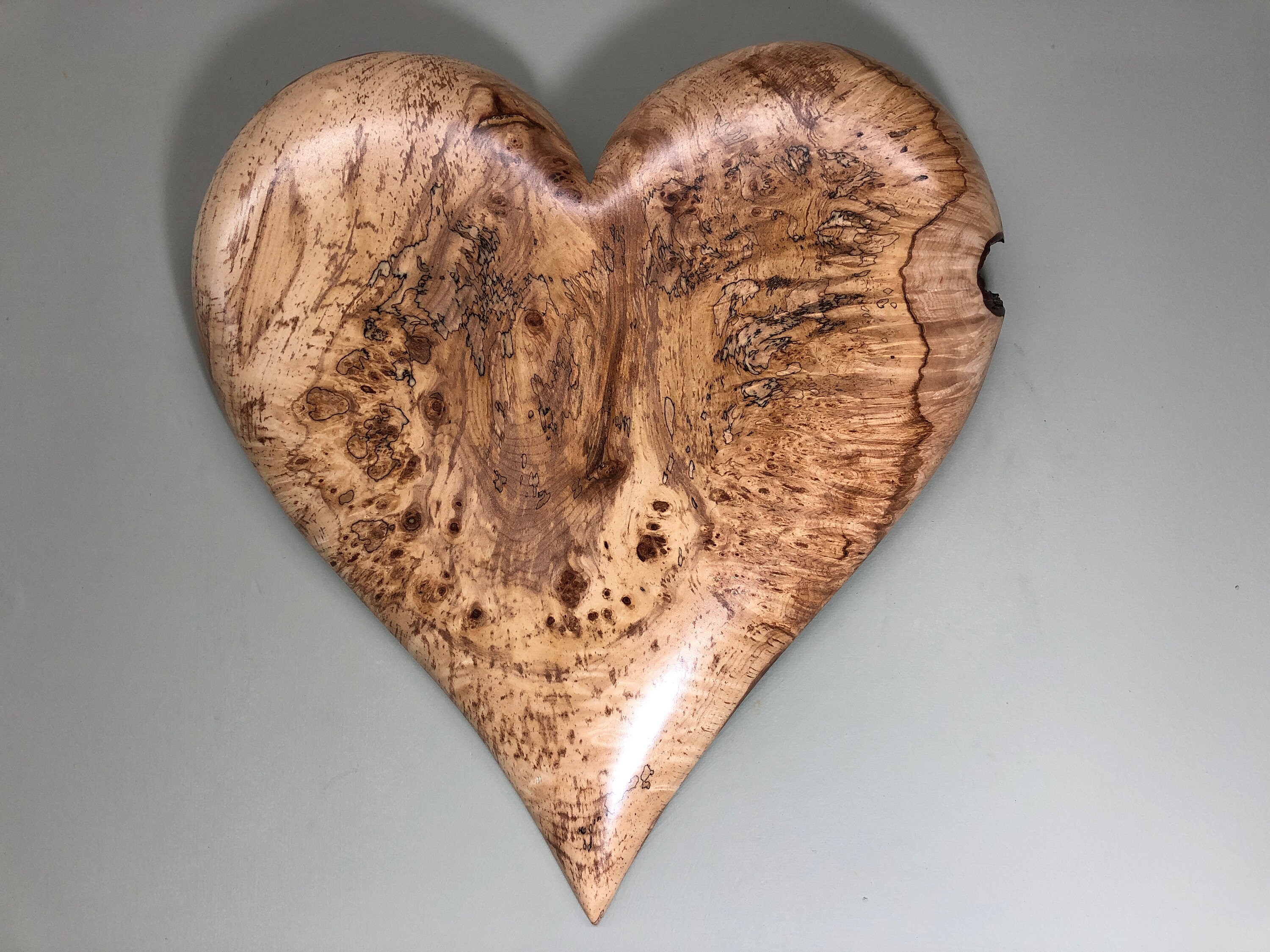 It is carved out of a beautiful piece of spaulted Big Leaf Maple Burl. I just love this wood! It looks so organic to me! I don't get many pieces like this. It makes a heart so unique! Spaulted pieces are much more laber intense to work. The wood is soft in some areas and not in others. I harden the soft wood with Minwax wood hardener so that it is just like a regular piece of wood in density when I am finished. Spaulting is where the wood started to rot. The molds go dormant when the moisture gets below 16%. The coloring is so unique to each piece spaulted piece.