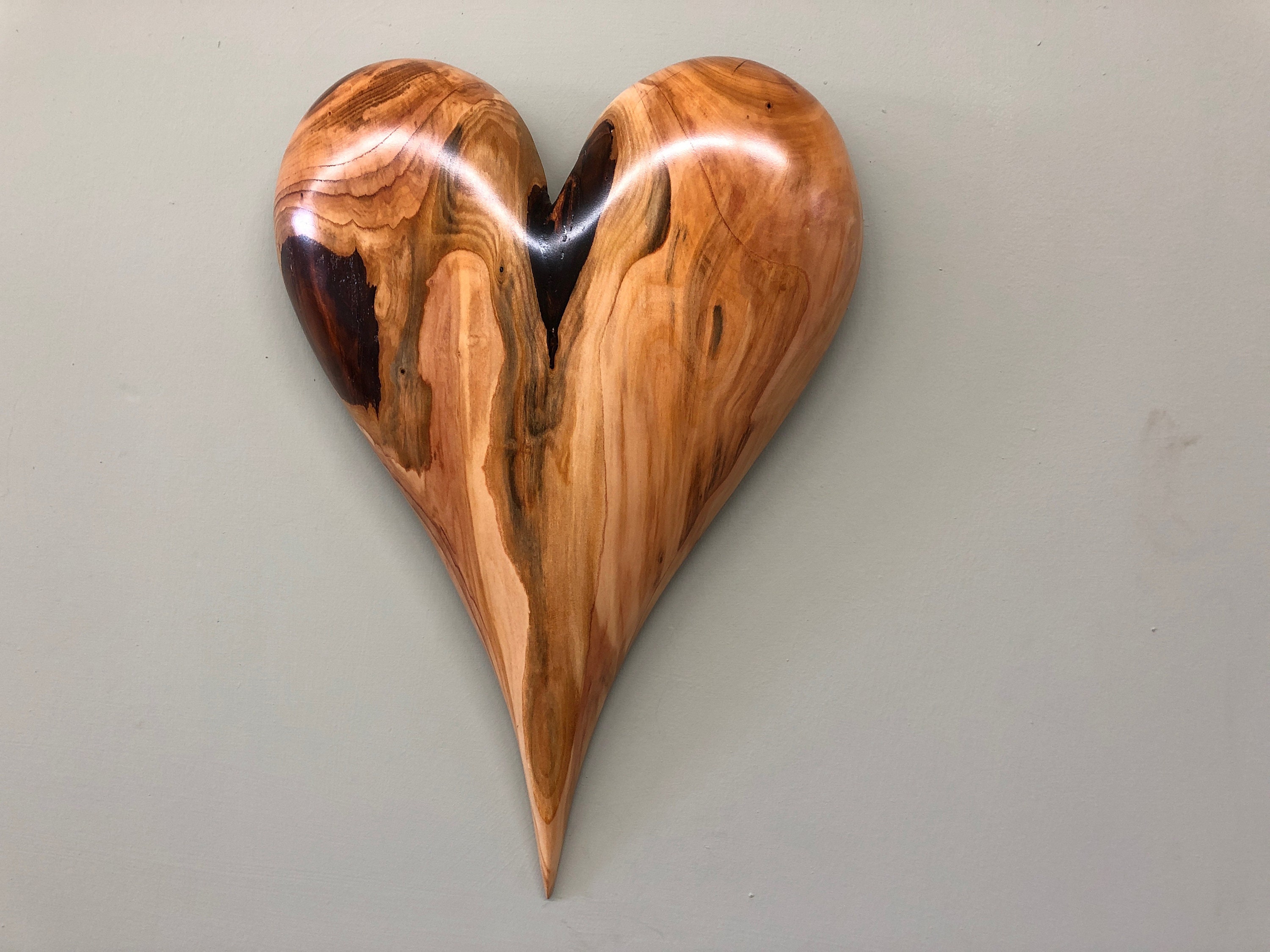This is a Cherry wooden Heart wall wood carving Wedding gift present. It's a great all occasion present!! I am Gary Burns the treewiz and I carved everything in my shop. I can Personalize it on the back. If it is simple like a short sentence and date there is no extra charge. It comes ready to hang. It really makes a loving statement!! There is bark on the left side and in the V of this heart. I love it when I can design bark into a heart. It adds a fun element to the piece. I don't find much Cherry wood. I only got a few pieces a few years ago. I have been patiently waiting for it to dry. I love working it. Would love to have a lot more of it!! It makes a wonderful heart!!