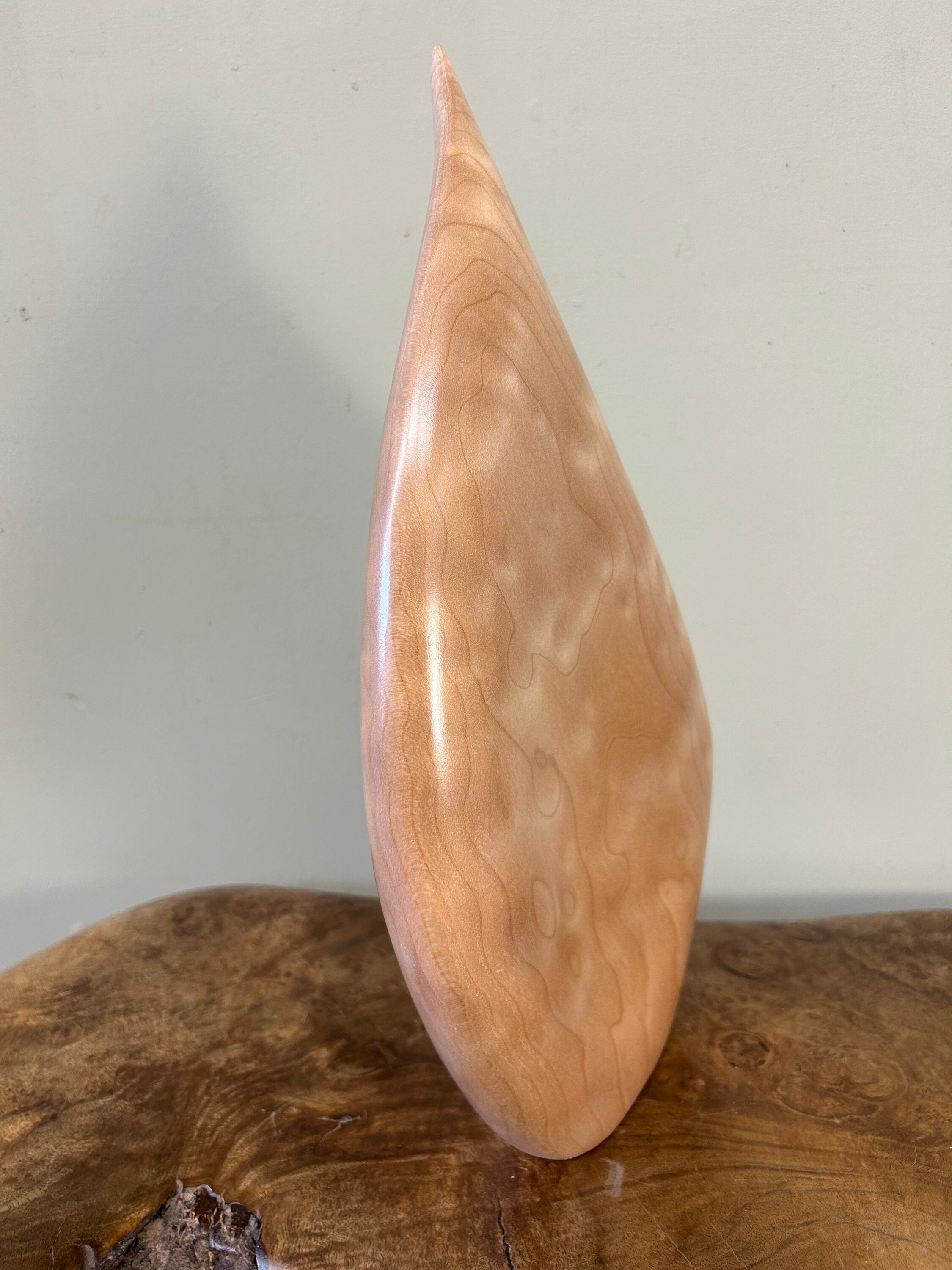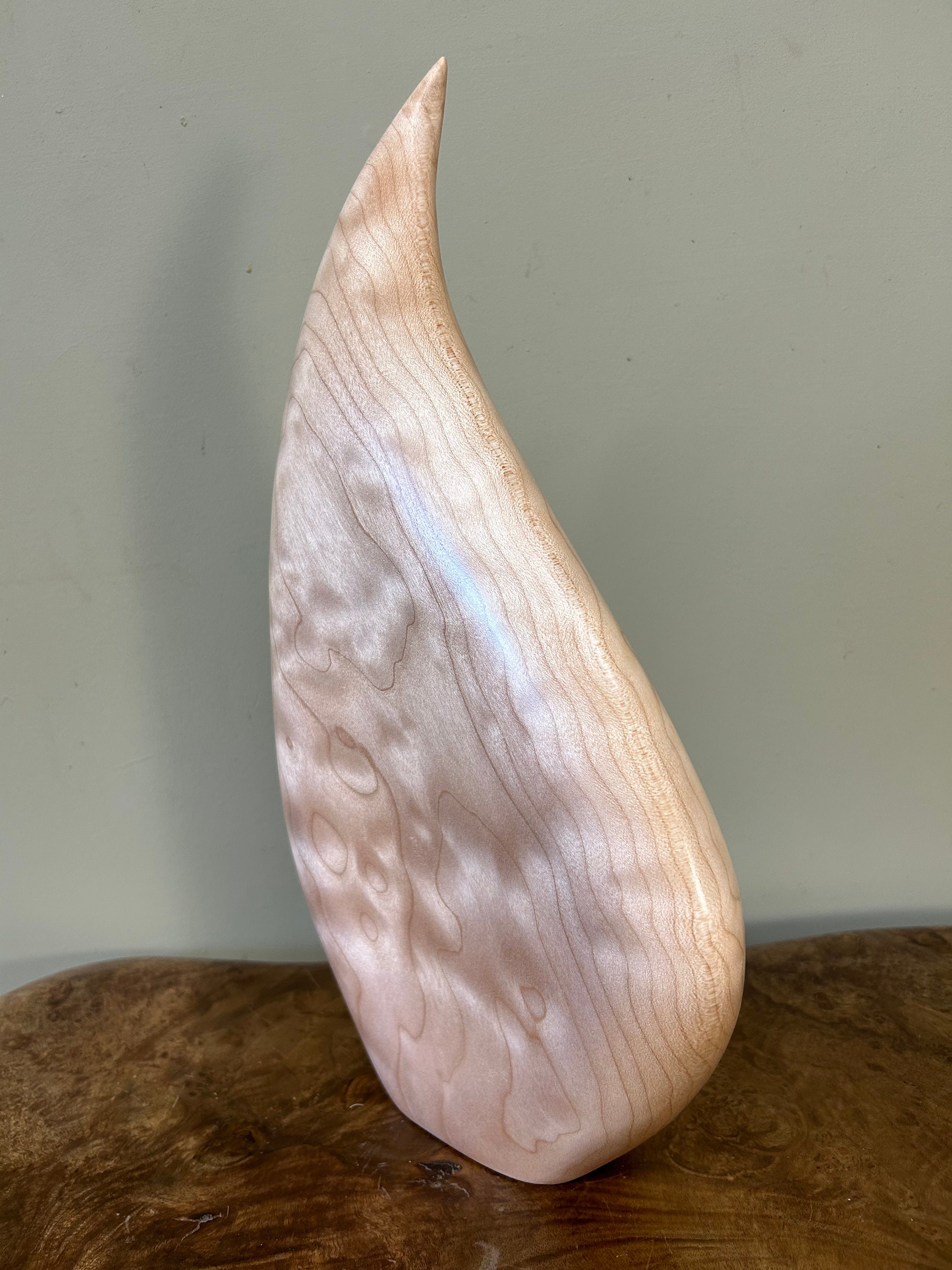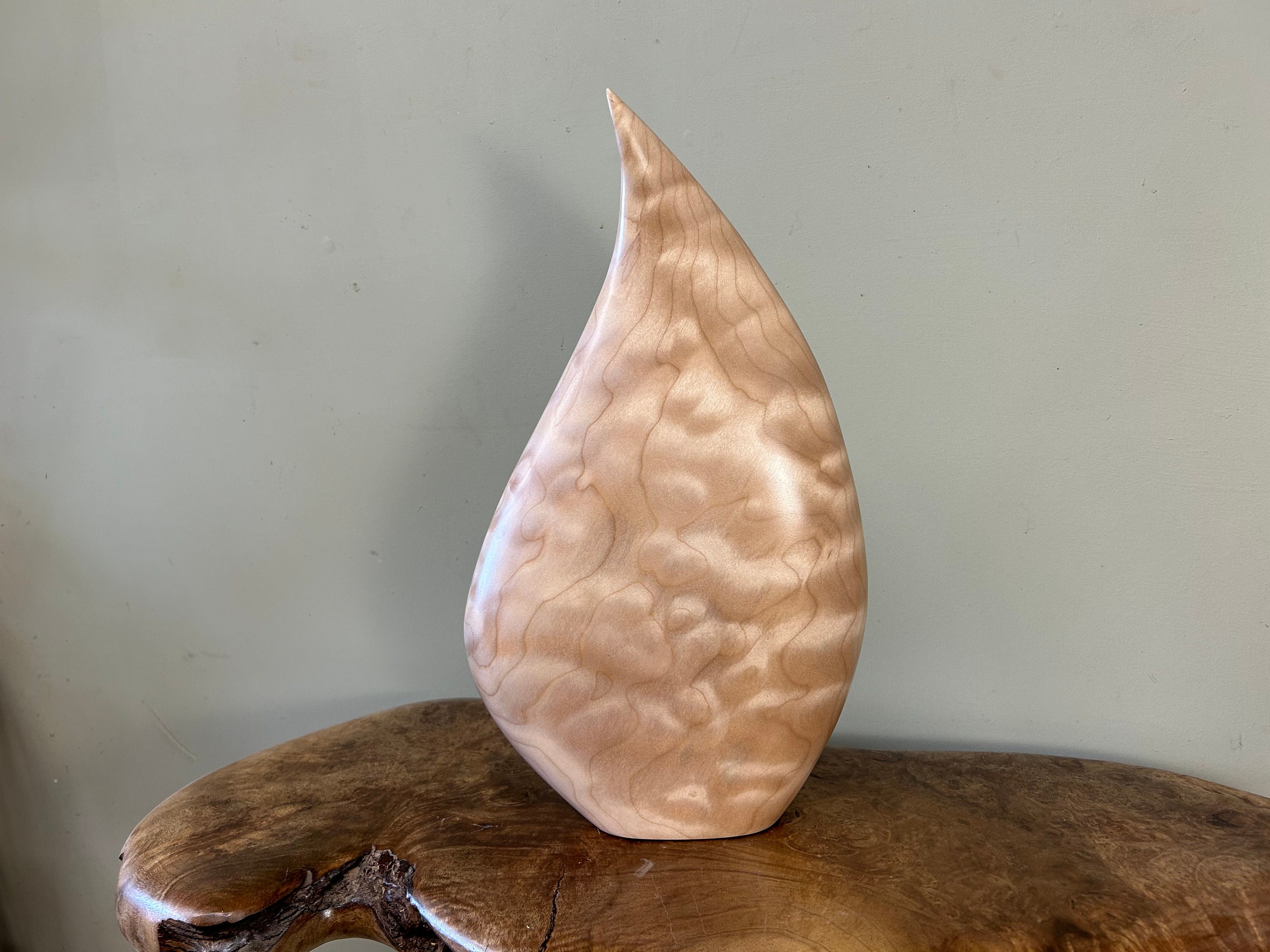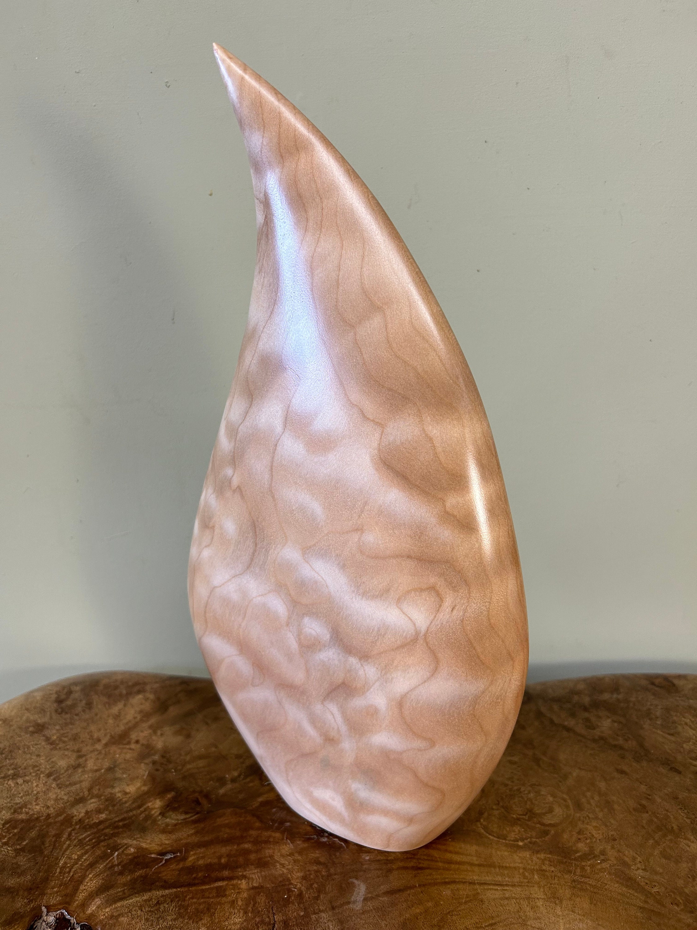 It flows and bends in a smooth graceful flow. It is very calming to be around for me. My designs are all unique and spontaneous. I love to flow with the "Will of the Wood". This piece is carved out of a kool piece of Quilted Maple. The light really plays with the flowing curves. A very fun piece.