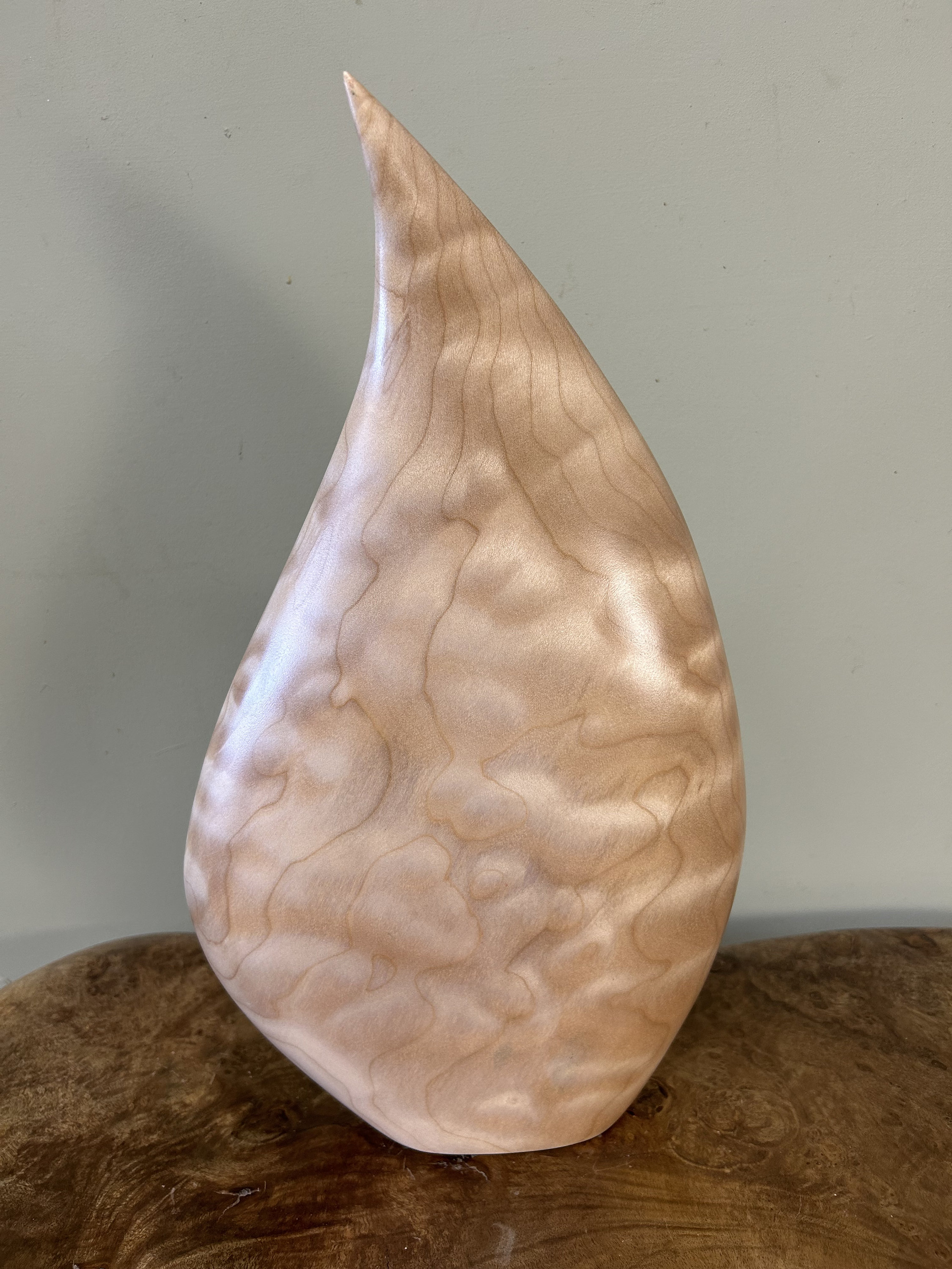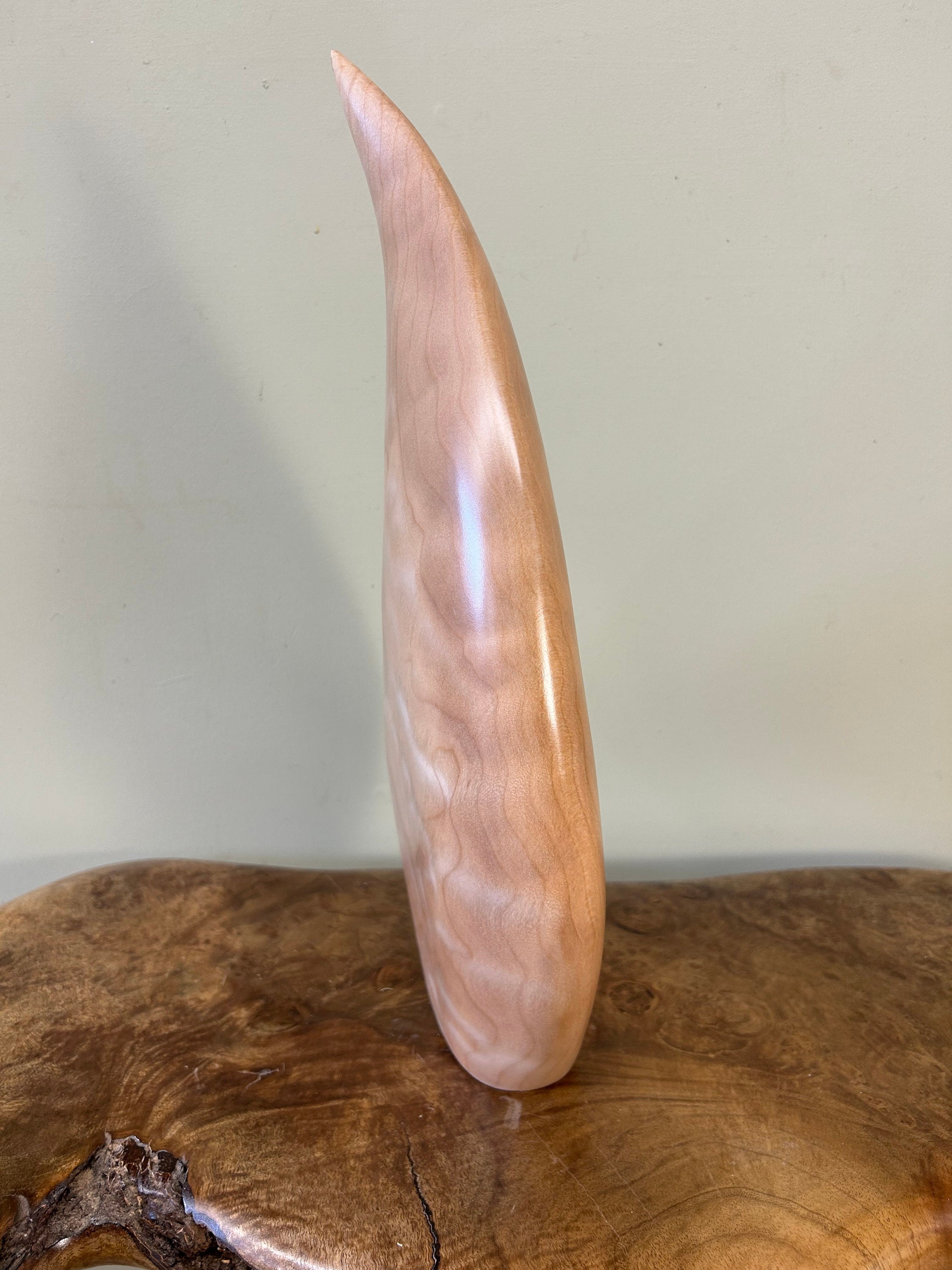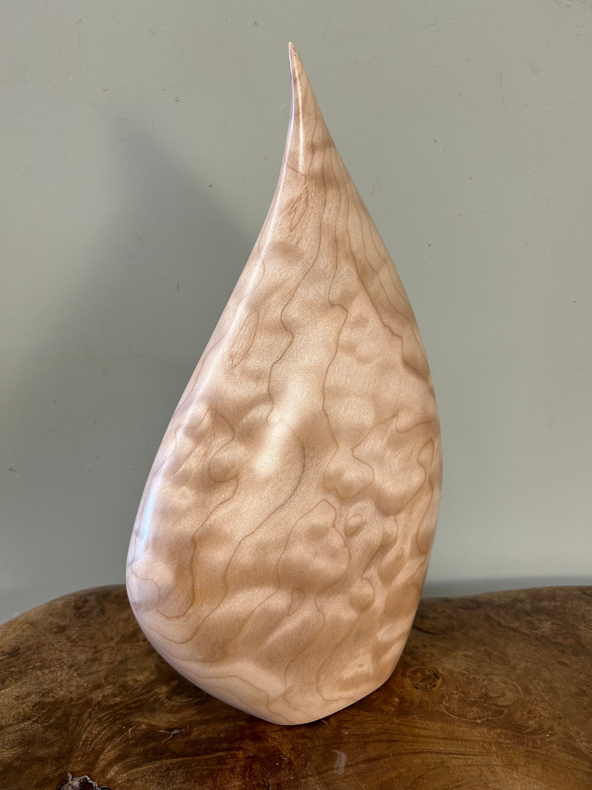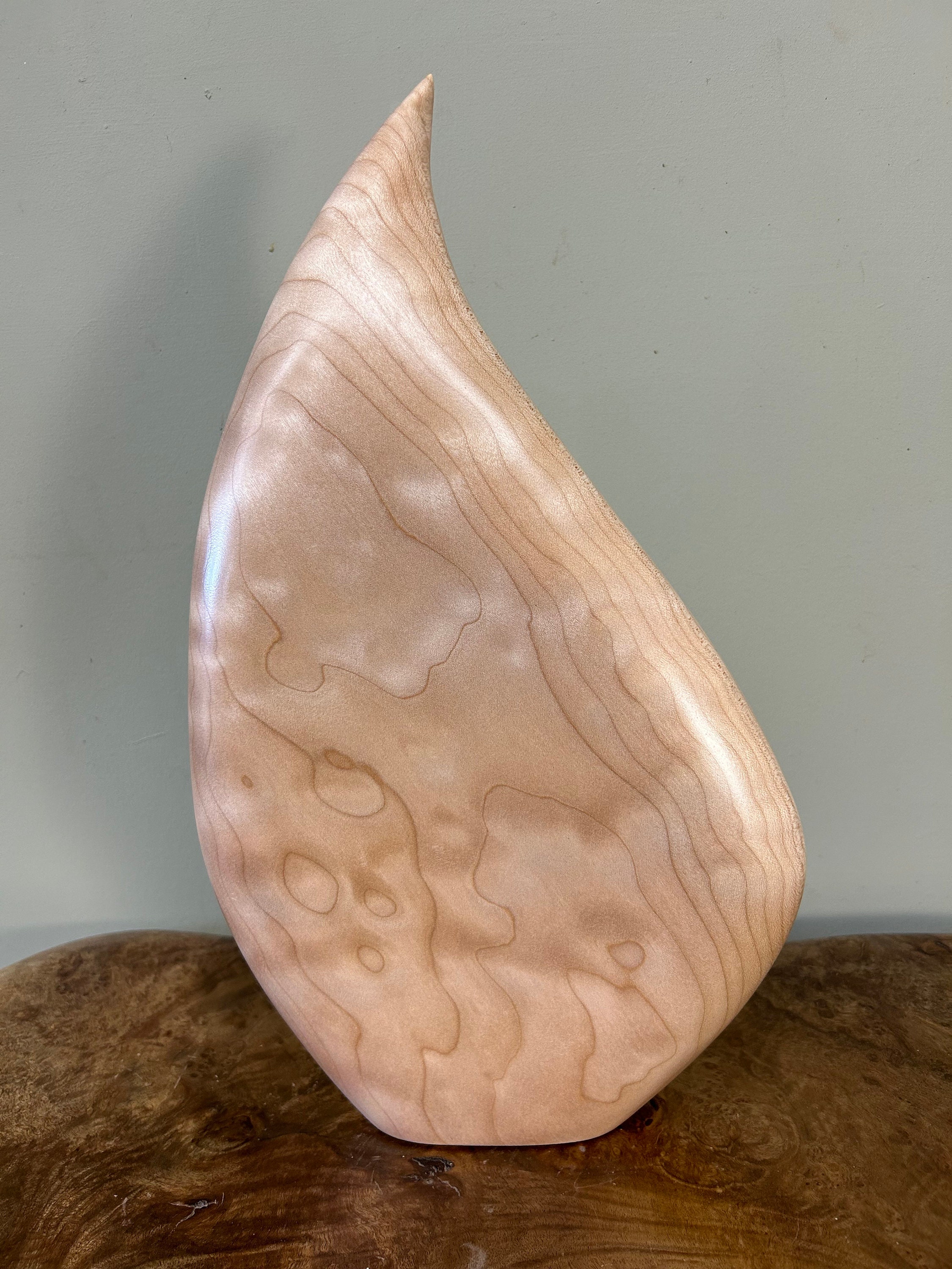 It flows and bends in a smooth graceful flow. It is very calming to be around for me. My designs are all unique and spontaneous. I love to flow with the "Will of the Wood". This piece is carved out of a kool piece of Quilted Maple. The light really plays with the flowing curves. A very fun piece.