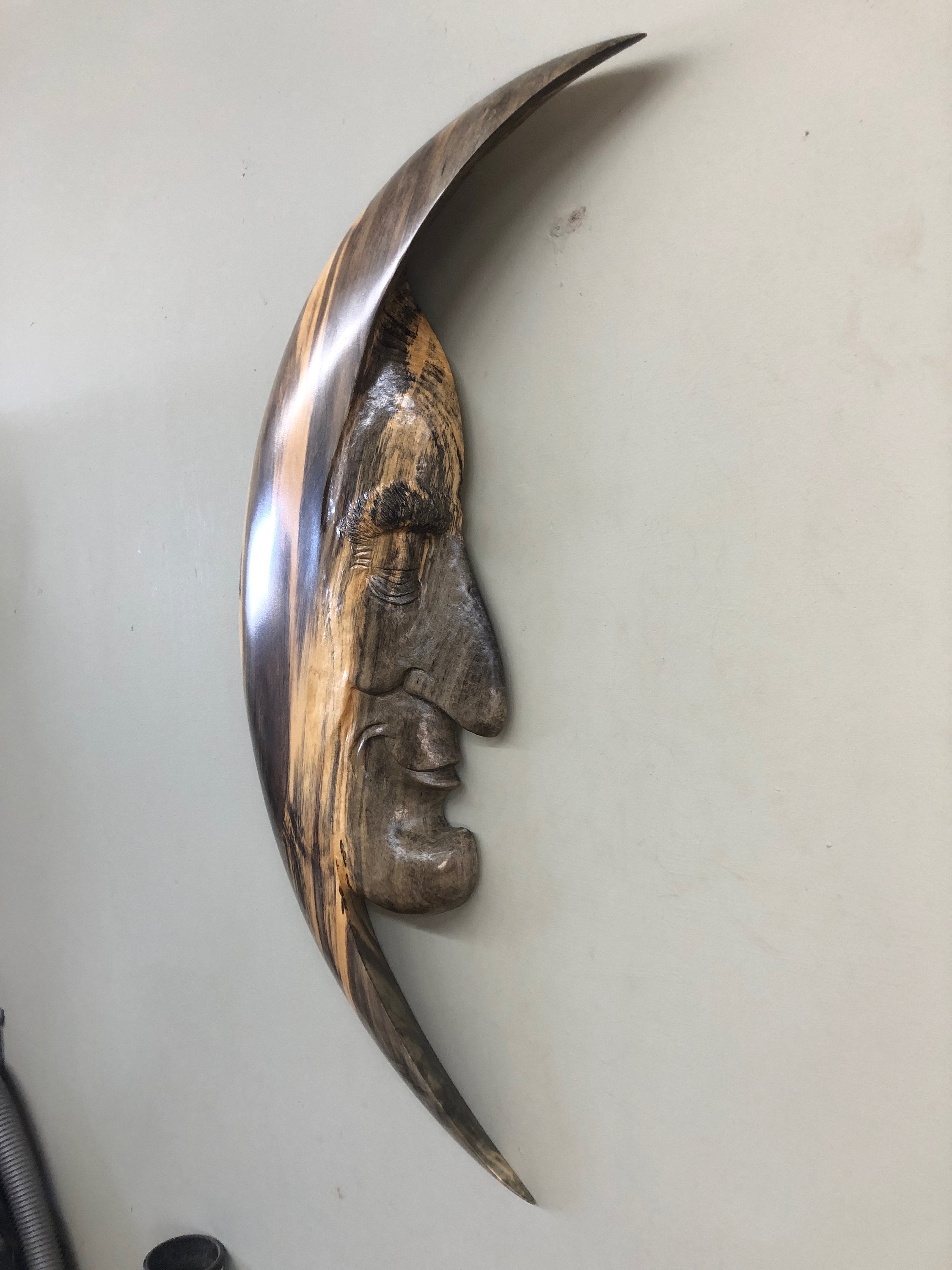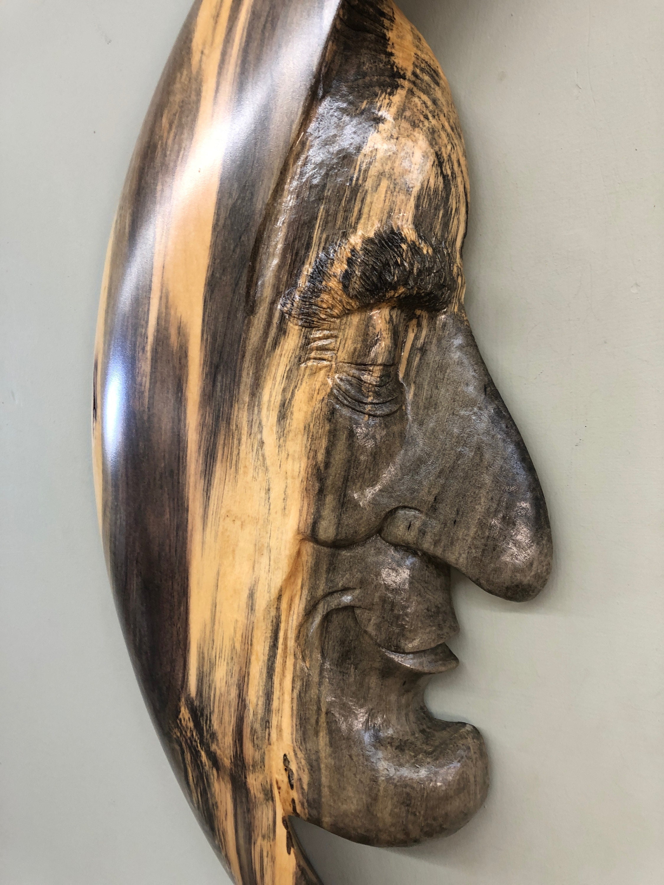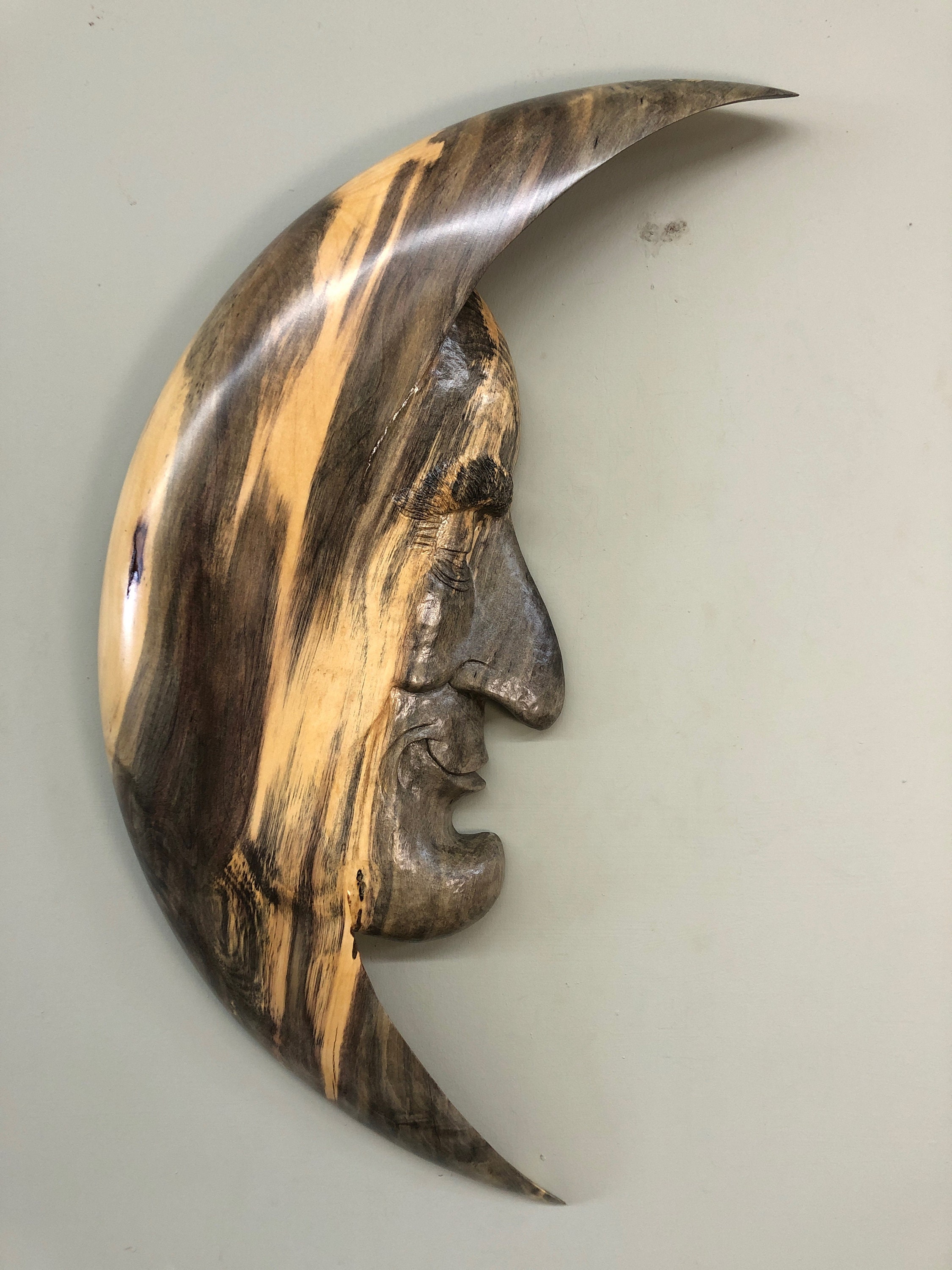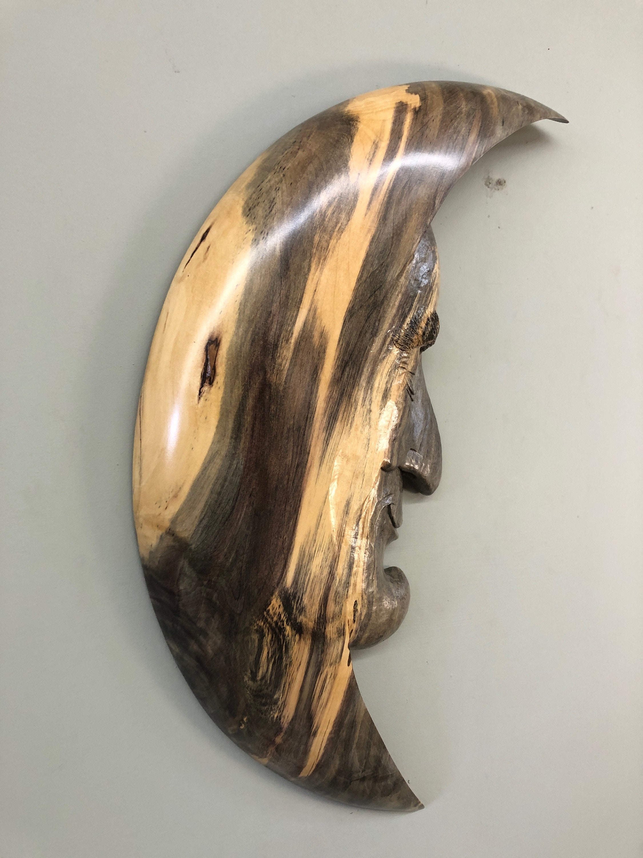 This Moon Man Wood Carving of the Man in the Moon is a Unique Art Wood Sculpture Present. He is a Ooak Moon Man Fantasy Gift wall hanging. I really love this Man in the Moon. He has a great attitude. I am Gary Burns the Treewiz and I carve everything in my shop. He measures 24 1/2" tall by 10 1/2" wide by 2" thick. He comes ready to hang on the wall. Dusting and a little Lemon Oil once in a while is all he needs to keep him looking like new. A wonderful any occasion gift!! He is carved in a piece of spalted Buckeye. This is the first Moon Man that I have done in Buckeye. I love this wood. The blue is the spalted portion and is so interesting mixed with the cream color.